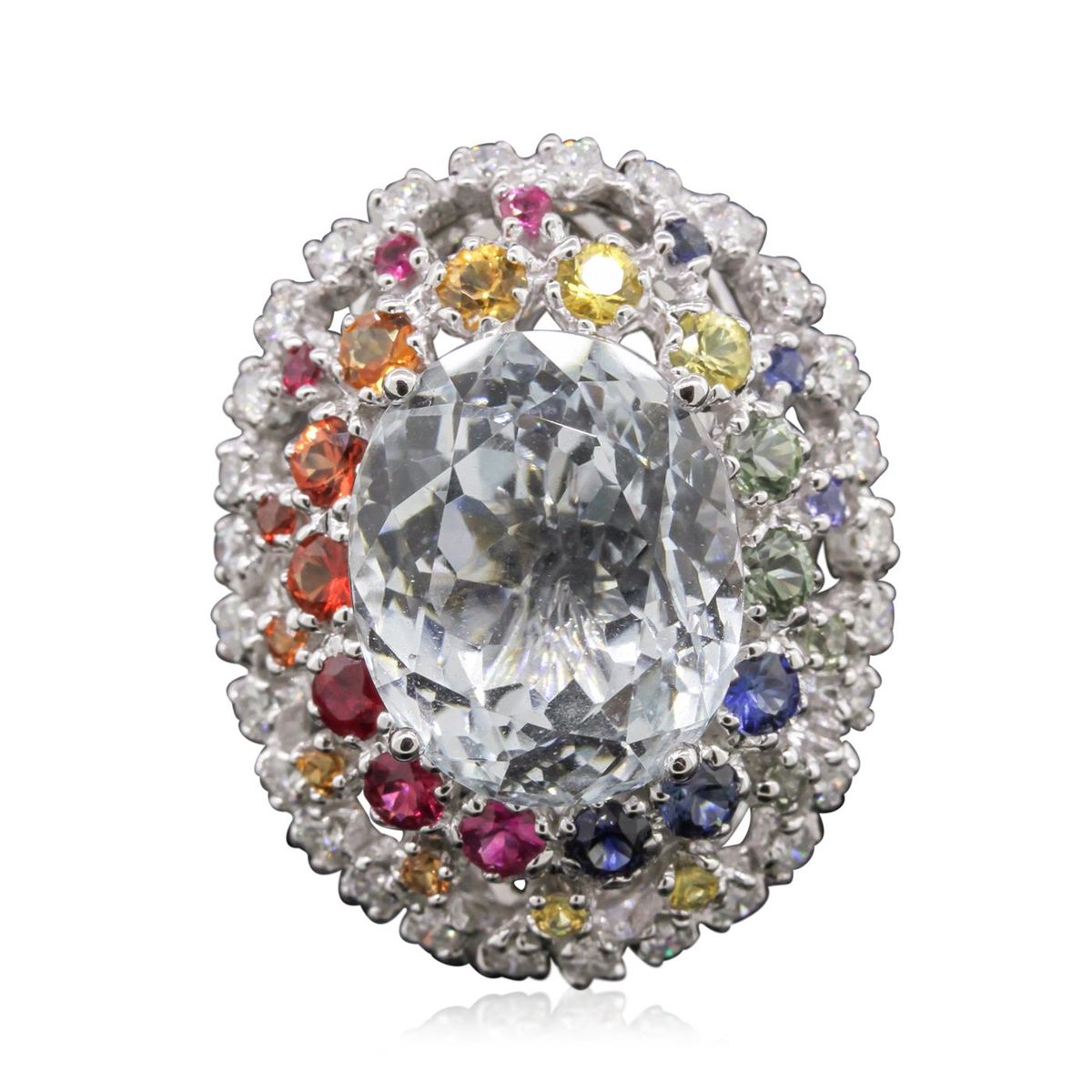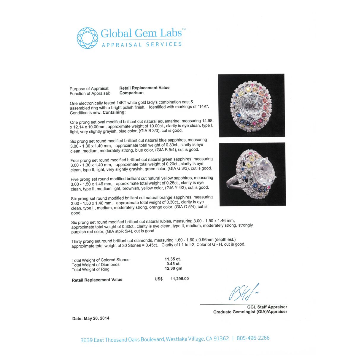 One electronically tested 14KT white gold Ladies combination cast & assembled ring with a bright polish finish. Condition is new. Identified with markings of "14K". Containing: One prong set oval modified brilliant cut natural aquamarine, measuring 14.98 x 12.14 x 10.00mm, approximate weight of 10.00ct., clarity is eye clean, type I, light, very slightly grayish, blue color, (GIA B 3/3), cut is good. Six prong set round modified brilliant cut natural blue sapphires, measuring 3.00 - 1.30 x 1.40 mm, approximate. Total Weight of 0.30ct., clarity is eye clean, medium, moderately strong, blue color, (GIA B 5/4), cut is good. Four prong set round modified brilliant cut natural green sapphires, measuring 3.00 - 1.30 x 1.40 mm, approximate. Total Weight of 0.20ct., clarity is eye clean, type II, light, very slightly grayish, green color, (GIA G 3/3), cut is good. Five prong set round modified brilliant cut natural yellow sapphires, measuring 3.00 - 1.50 x 1.46 mm, approximate. Total Weight of 0.25ct., clarity is eye clean, type II, medium light, brownish, yellow color, (GIA Y 4/3), cut is good. Six prong set round modified brilliant cut natural orange sapphires, measuring 3.00 - 1.50 x 1.46 mm, approximate. Total Weight of 0.30ct., clarity is eye clean, type II, medium, moderately strong, orange color, (GIA O 5/4), cut is good. Six prong set round modified brilliant cut natural rubies, measuring 3.00 - 1.50 x 1.46 mm, approximate. Total Weight of 0.30ct., clarity is eye clean, type II, medium, moderately strong, strongly purplish red color, (GIA stpR 5/4), cut is good. Colored gemstones are presumed to have been subjected to commonly used color/clarity enhancement processes. Thirty prong set round brilliant cut diamonds, measuring 1.60 - 1.60 x 0.96mm (depth est.) approximate. Total Weight of 30 Stones = 0.45ct. Clarity: I-1 to I-2. Color: G - H, Cut is Good. Total Weight of Colored Stones 11.35ct. Total Weight of Diamonds 0.45ct. Total Weight of Ring 12.30 grams. GGL Appraised at $11,295.00.