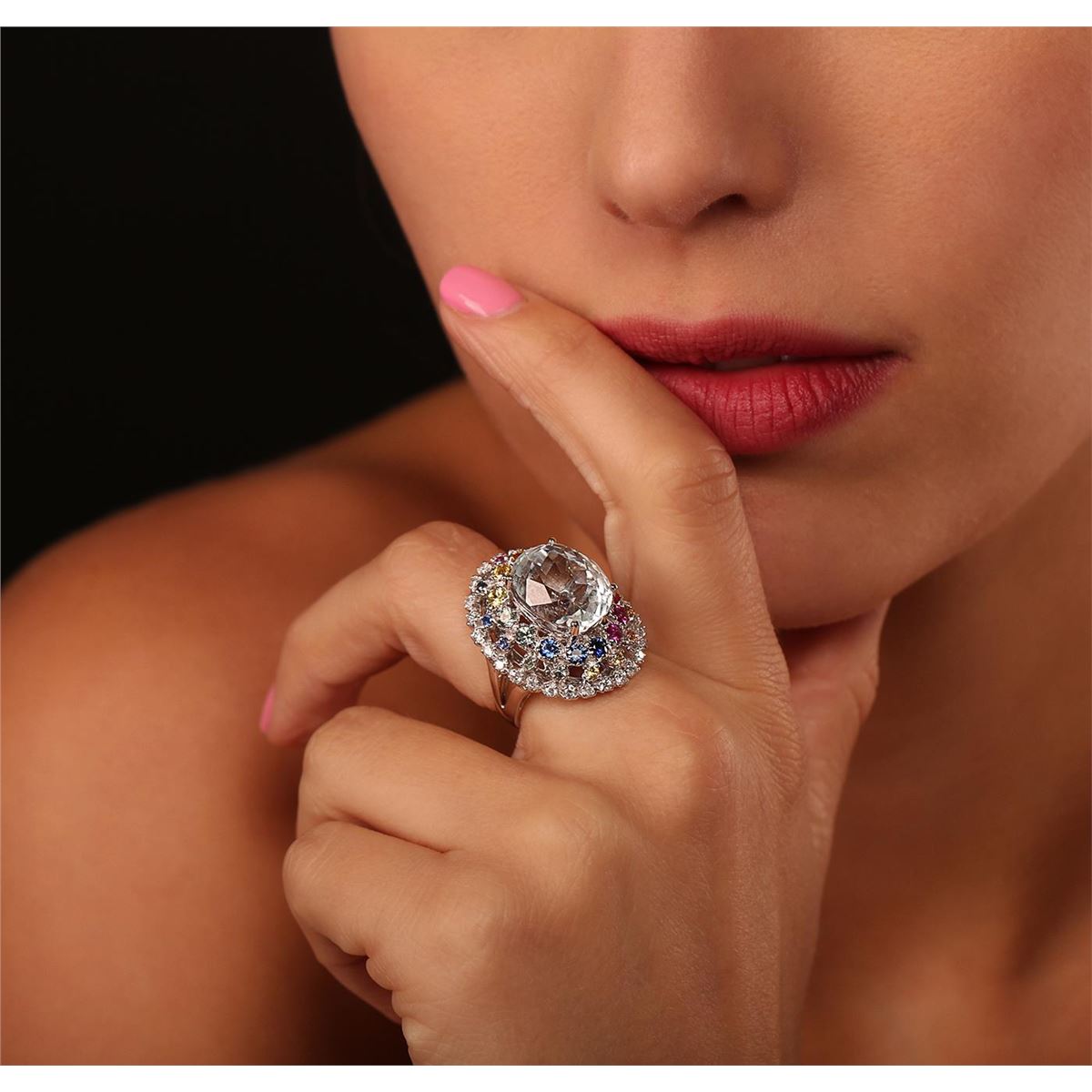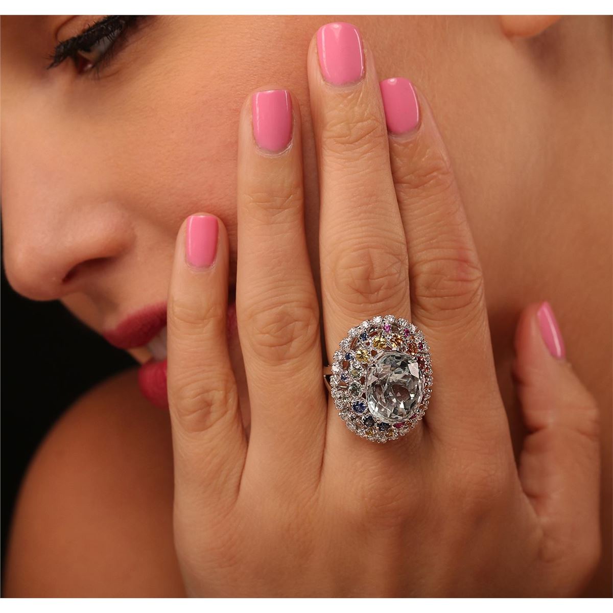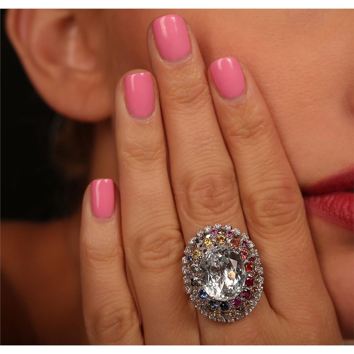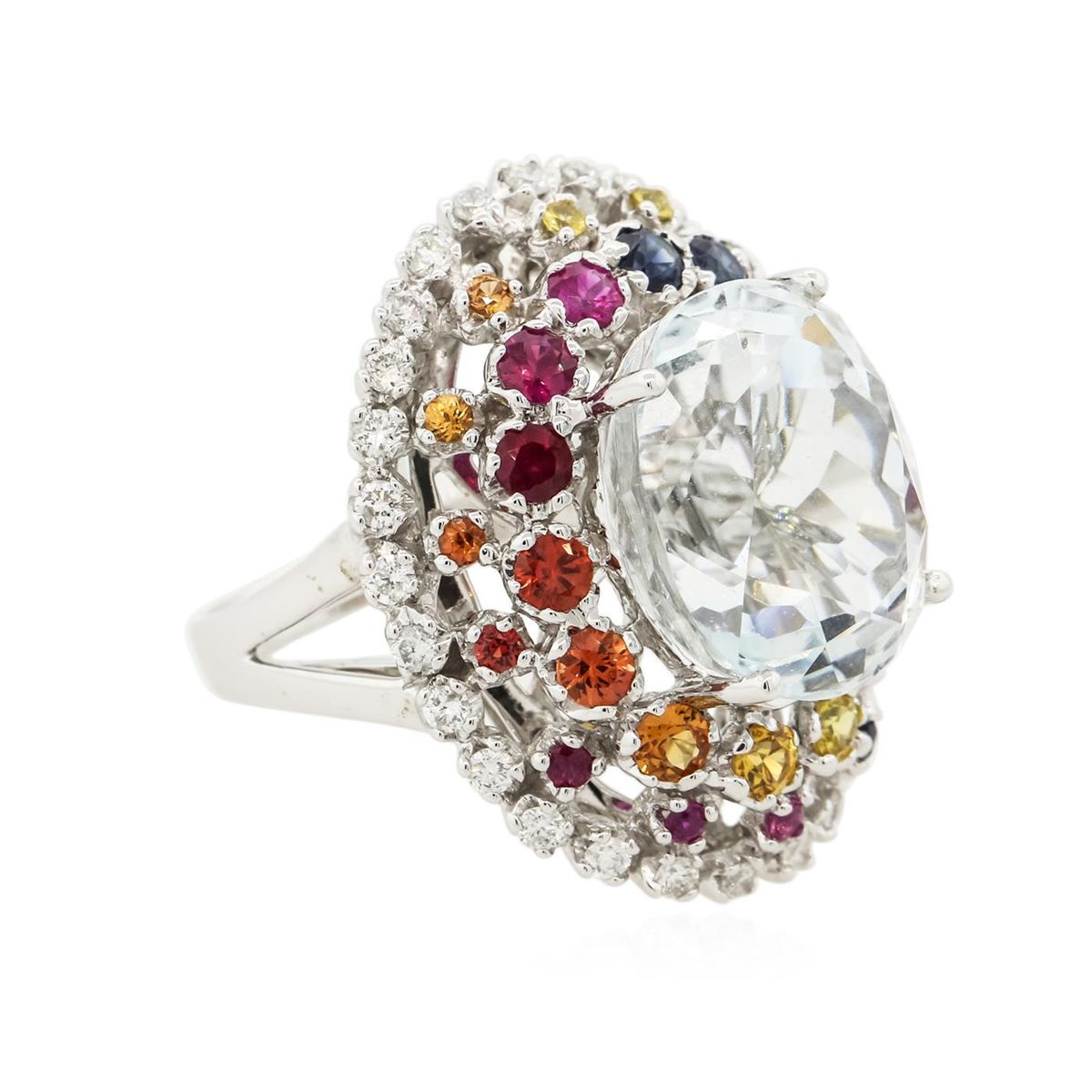 One electronically tested 14KT white gold Ladies combination cast & assembled ring with a bright polish finish. Condition is new. Identified with markings of "14K". Containing: One prong set oval modified brilliant cut natural aquamarine, measuring 14.98 x 12.14 x 10.00mm, approximate weight of 10.00ct., clarity is eye clean, type I, light, very slightly grayish, blue color, (GIA B 3/3), cut is good. Six prong set round modified brilliant cut natural blue sapphires, measuring 3.00 - 1.30 x 1.40 mm, approximate. Total Weight of 0.30ct., clarity is eye clean, medium, moderately strong, blue color, (GIA B 5/4), cut is good. Four prong set round modified brilliant cut natural green sapphires, measuring 3.00 - 1.30 x 1.40 mm, approximate. Total Weight of 0.20ct., clarity is eye clean, type II, light, very slightly grayish, green color, (GIA G 3/3), cut is good. Five prong set round modified brilliant cut natural yellow sapphires, measuring 3.00 - 1.50 x 1.46 mm, approximate. Total Weight of 0.25ct., clarity is eye clean, type II, medium light, brownish, yellow color, (GIA Y 4/3), cut is good. Six prong set round modified brilliant cut natural orange sapphires, measuring 3.00 - 1.50 x 1.46 mm, approximate. Total Weight of 0.30ct., clarity is eye clean, type II, medium, moderately strong, orange color, (GIA O 5/4), cut is good. Six prong set round modified brilliant cut natural rubies, measuring 3.00 - 1.50 x 1.46 mm, approximate. Total Weight of 0.30ct., clarity is eye clean, type II, medium, moderately strong, strongly purplish red color, (GIA stpR 5/4), cut is good. Colored gemstones are presumed to have been subjected to commonly used color/clarity enhancement processes. Thirty prong set round brilliant cut diamonds, measuring 1.60 - 1.60 x 0.96mm (depth est.) approximate. Total Weight of 30 Stones = 0.45ct. Clarity: I-1 to I-2. Color: G - H, Cut is Good. Total Weight of Colored Stones 11.35ct. Total Weight of Diamonds 0.45ct. Total Weight of Ring 12.30 grams. GGL Appraised at $11,295.00.