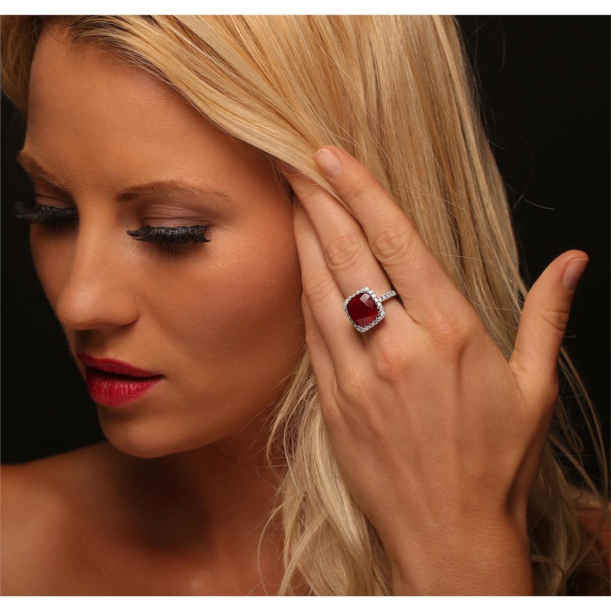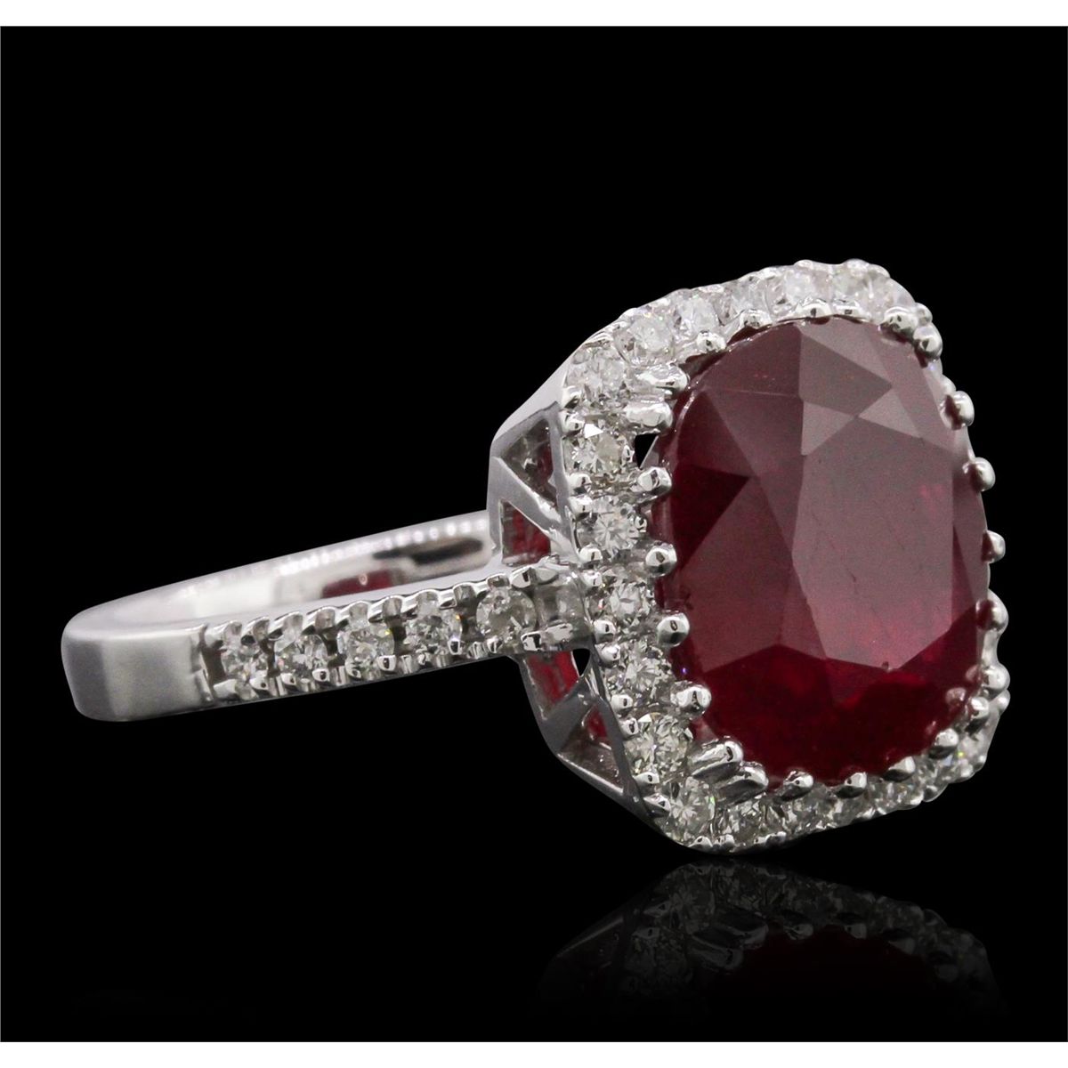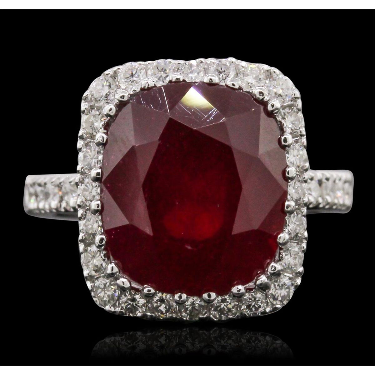 One electronically tested 14KT white gold Ladies combination cast & assembled ring with a high polish finish. Condition is new. Identified with markings of "14K". Containing: One prong set square cushion modified mixed cut natural ruby, measuring 12.00 x 12.00 x 7.80mm, approximate weight of 10.00ct., clarity is heavily included, type II, medium dark, moderately strong, strongly purplish red color, (GIA stpR 6/4), cut is good. Colored gemstones are presumed to have been subjected to commonly used color/clarity enhancement processes. Thirty-Four prong set round brilliant cut diamonds, measuring 1.70 - 1.50 x 0.96mm (depth est.) approximate. Total Weight of 34 Stones = 0.66ct. Clarity: I-1 to I-2. Color: H - I, Cut is Good. Total Weight of Colored Stones 10.00ct. Total Weight of Diamonds 0.66ct. Total Weight of Ring 7.70 grams. GGL Appraised at $6,155.00.