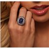 One electronically tested 14KT white gold ladies cast tanzanite, sapphire, and diamond ring. The featured tanzanite is set within an inner diamond bezel and an outer sapphire bezel supported by diamond set shoulders, completed by a two and one-half millimeter wide band. Bright polish finish with milgrain detailing. Identified with markings of "K14". Condition is new, good workmanship. Containing: One prong set oval cabochon cut natural tanzanite, measuring 13.65 x 10.55 x 6.70mm, 15%. bulge factor, approximate weight of 10.04ct., clarity is moderately included, type I, medium dark, moderately strong, violetish blue color, (GIA vB 6/4), cut is good. Transmitting light somewhat diffusely, transparent to translucent. Naturally occurring internal & external characteristics are present. Colored Stone Grading Report attached. Graded in the setting. Tanzanite is a very rare gemstone that is only found in the country of Tanzania. Originally discovered in 1967. Tiffany & Company, named the stone Tanzanite. It is found in the Usumburu Mountains that border the Umba Valley of northern Tanzania. Tanzanite occurs in gray, brown, violet, blue, reddish-purple, & green. The gem is interesting because of its exceptional pleochroism. Rotated in different directions a tanzanite will exhibit multiple changes of color. Tanzanite has a low tolerance to ultrasonic cleaning, and should not be cleaned using this method. Thirty-two prong set round mixed cut natural blue sapphires, measuring 1.90 - 1.80 x 1.20 mm, approximate. Total Weight of 1.06ct., clarity is slightly included, type II, medium dark, very slightly grayish, blue color, (GIA B 6/3), cut is good. Transmitting light with a minimum of distortion, transparent to translucent. Naturally occurring internal & external characteristics are present, including some partial color zoning. Color grade is an average for the group. Graded in the setting. Twenty-Four bezel set round brilliant cut diamonds, measuring 1.90 - 1.80 x 1.11mm (depth est.) approximate. Total Weight of 24 Stones = 0.65ct. Graded in the setting. Clarity: SI-1 to I-1. Color: H - J. Total Weight of Colored Stones 11.10ct. Total Weight of Diamonds 0.65ct.