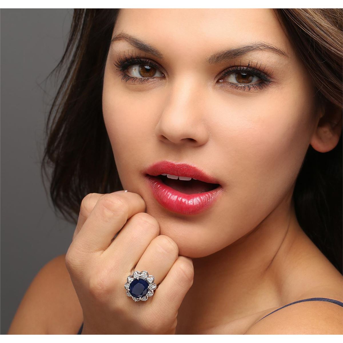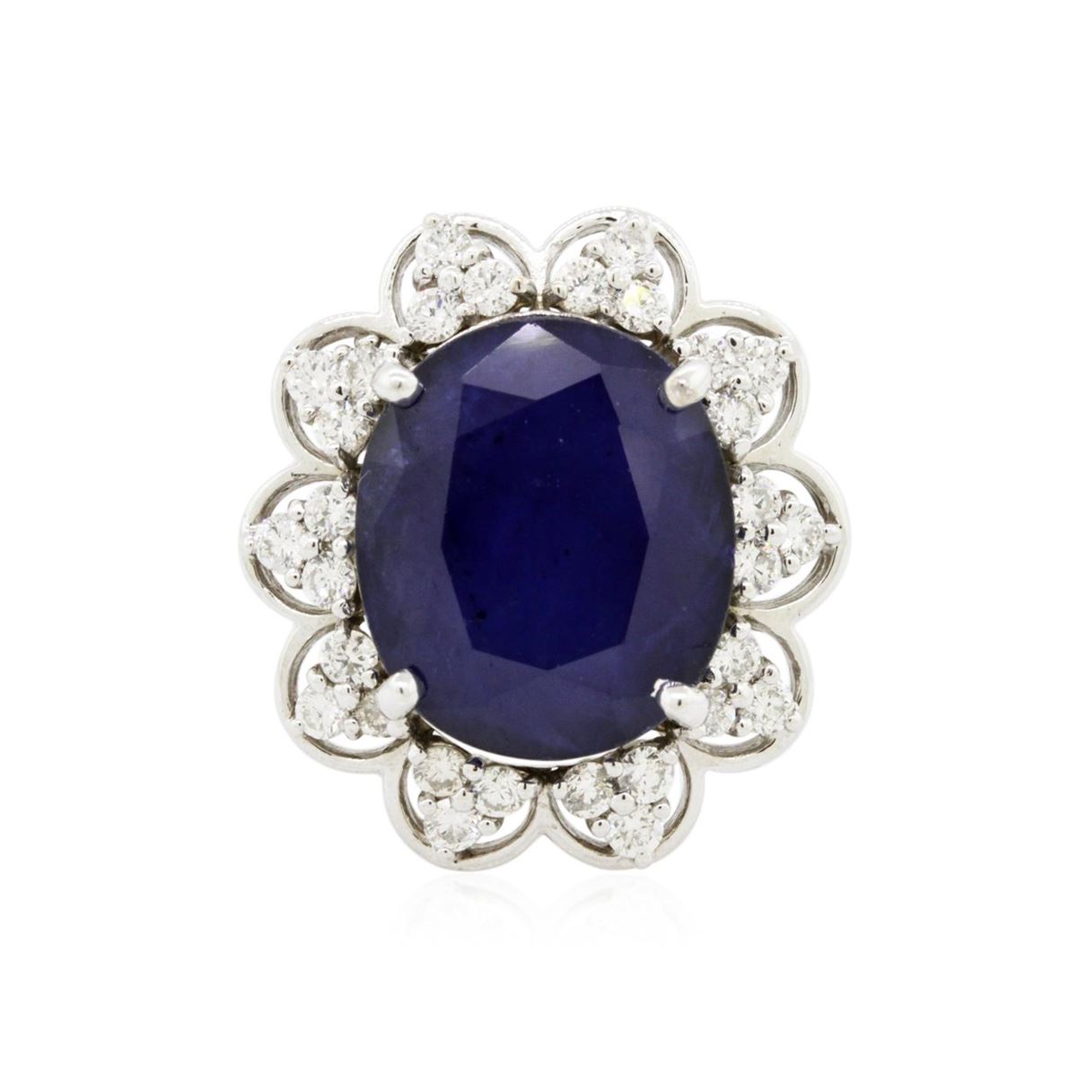 One electronically tested 14KT white gold ladies cast sapphire and diamond ring with a bright polish finish. Identified with markings of "14K". Condition is new. Containing: One prong set oval modified brilliant cut natural blue sapphire, measuring 14.25 x 12.17 x 6.95mm, approximate weight of 10.12ct., clarity is heavily included, type II, dark, strong, blue color, (GIA B 7/5), cut is good. Thirty prong set round brilliant cut diamonds, measuring 1.80 - 1.80 x 1.08mm (depth est.) approximate total weight of 30 Stones = 0.64ct. Clarity: SI-1 to I-1. Color: H - I, Cut is Good. Colored gemstones are presumed to have been subjected to commonly used enhancement processes. All diamonds and colored gemstones are graded in the mounting, unless otherwise stated. Total Weight of Colored Stones 10.12ct. Total Weight of Diamonds 0.64ct. Total Weight of Ring 7.80 grams. GGL Appraised at $4,075.00.