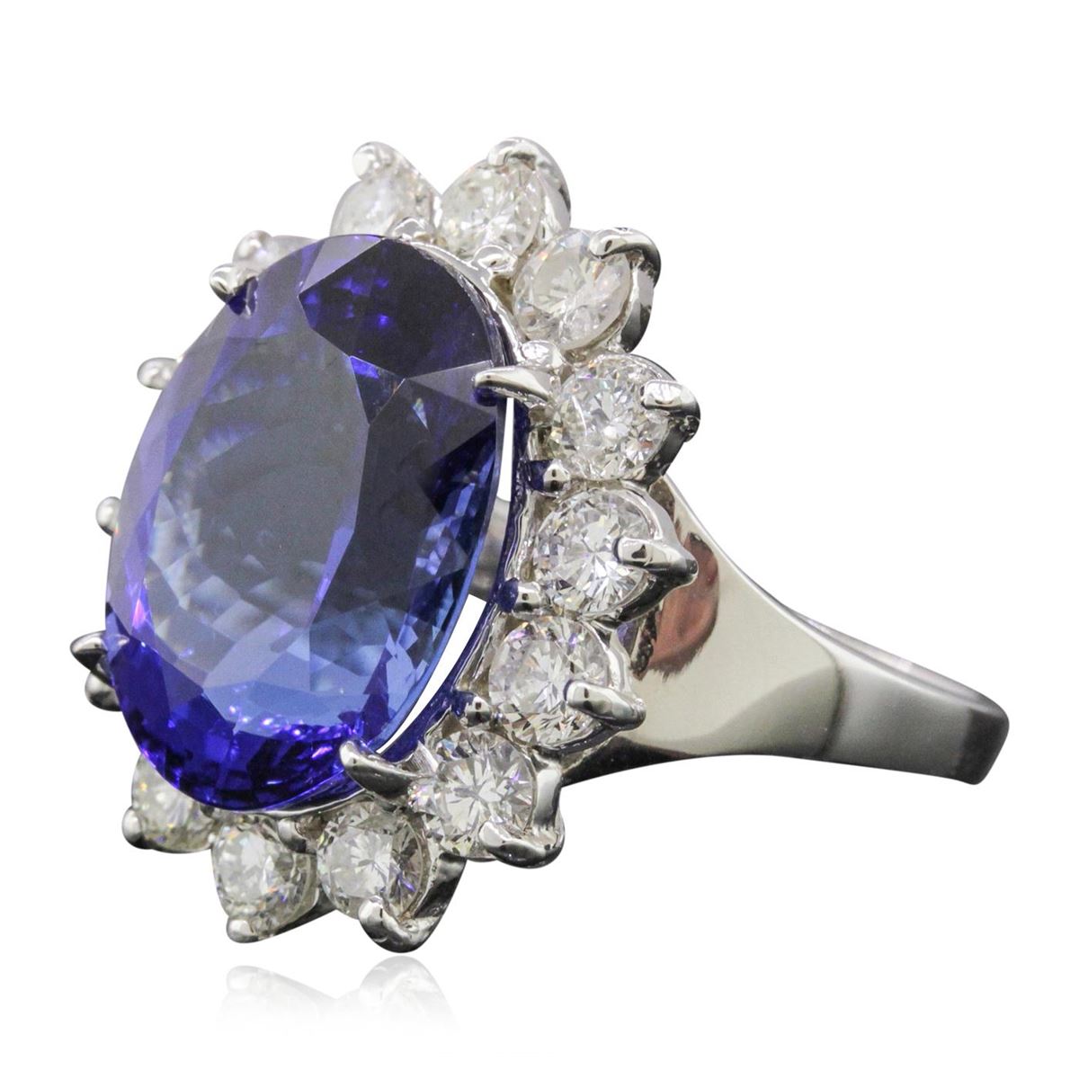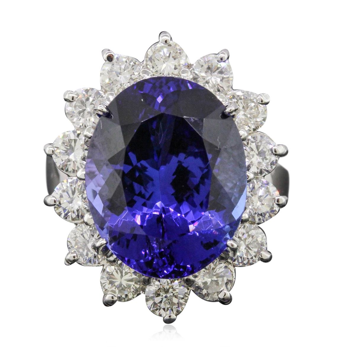 One electronically tested 14KT white gold ladies combination cast & assembled ring with a flat shank with rounded edges with a bright polish finish. Identified with markings of "K14". Condition is new. Containing: One prong set oval modified brilliant cut natural tanzanite, measuring 15.24 x 11.99 x 8.18mm, approximate weight of 10.16ct., clarity is eye clean, type I, medium dark, moderately strong, bluish violet color, (GIA bV 6/4), cut is good. Fourteen prong set round brilliant cut diamonds, measuring 3.40 - 3.40 x 2.04mm (depth est.) approximate total weight of 14 Stones = 2.01ct. Clarity: SI-2 to I-1. Color: I - J, Cut is Good. Colored gemstones are presumed to have been subjected to commonly used enhancement processes. All diamonds and colored gemstones are graded in the mounting, unless otherwise stated. Total Weight of Colored Stones 10.16ct. Total Weight of Diamonds 2.01ct. Total Weight of Ring 7.80 grams. GGL Appraised at $20,590.00.
