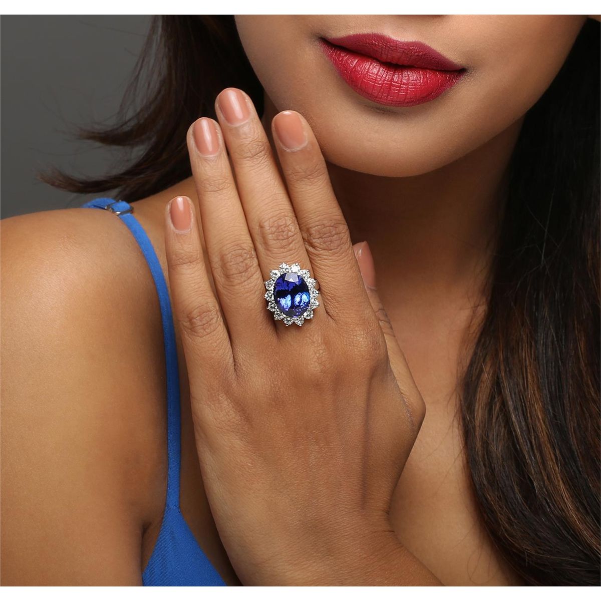 One electronically tested 14KT white gold ladies combination cast & assembled ring with a flat shank with rounded edges with a bright polish finish. Identified with markings of "K14". Condition is new. Containing: One prong set oval modified brilliant cut natural tanzanite, measuring 15.24 x 11.99 x 8.18mm, approximate weight of 10.16ct., clarity is eye clean, type I, medium dark, moderately strong, bluish violet color, (GIA bV 6/4), cut is good. Fourteen prong set round brilliant cut diamonds, measuring 3.40 - 3.40 x 2.04mm (depth est.) approximate total weight of 14 Stones = 2.01ct. Clarity: SI-2 to I-1. Color: I - J, Cut is Good. Colored gemstones are presumed to have been subjected to commonly used enhancement processes. All diamonds and colored gemstones are graded in the mounting, unless otherwise stated. Total Weight of Colored Stones 10.16ct. Total Weight of Diamonds 2.01ct. Total Weight of Ring 7.80 grams. GGL Appraised at $20,590.00.