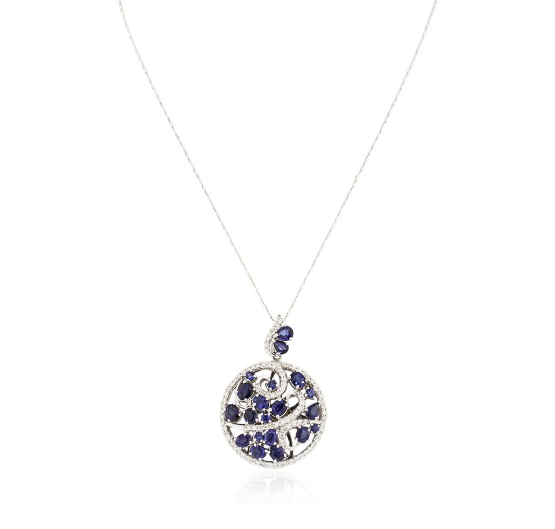One electronically tested 14KT white gold ladies cast sapphire and diamond pendant & chain 18.0" long, with a lobster claw clasp with a bright polish finish. Identified with markings of "14K". Condition is new. Containing: Six prong set round modified brilliant cut natural blue sapphires, measuring 3.00 - 3.00 x 1.95 mm, approximate total weight of 0.84ct., clarity is eye clean, type II, medium, moderately strong, blue color, (GIA B 5/4), cut is good. Three prong set pear modified brilliant cut natural blue sapphires, measuring 5.30 x 3.00 x 1.95mm, approximate total weight of 0.75ct., clarity is eye clean, type II, medium, moderately strong, blue color, (GIA B 5/4), cut is good. Eleven prong set oval modified brilliant cut natural blue sapphires, measuring 5.70 x 5.00 x 3.25mm, approximate total weight of 8.58ct., clarity is eye clean, type II, medium, moderately strong, blue color, (GIA B 5/4), cut is good. Ninety-Four prong set round brilliant cut diamonds, measuring 1.20 - 1.50 x 0.81mm (depth est.) approximate total weight of 94 Stones = 0.85ct. Clarity: SI-1 to SI-2. Color: I - J, Cut is Good. Colored gemstones are presumed to have been subjected to commonly used enhancement processes. All diamonds and colored gemstones are graded in the mounting, unless otherwise stated. Total Weight of Colored Stones 10.17ct. Total Weight of Diamonds 0.85ct. Total Weight of Pendant & Chain 17.90 grams. GGL Appraised at $8,285.00.