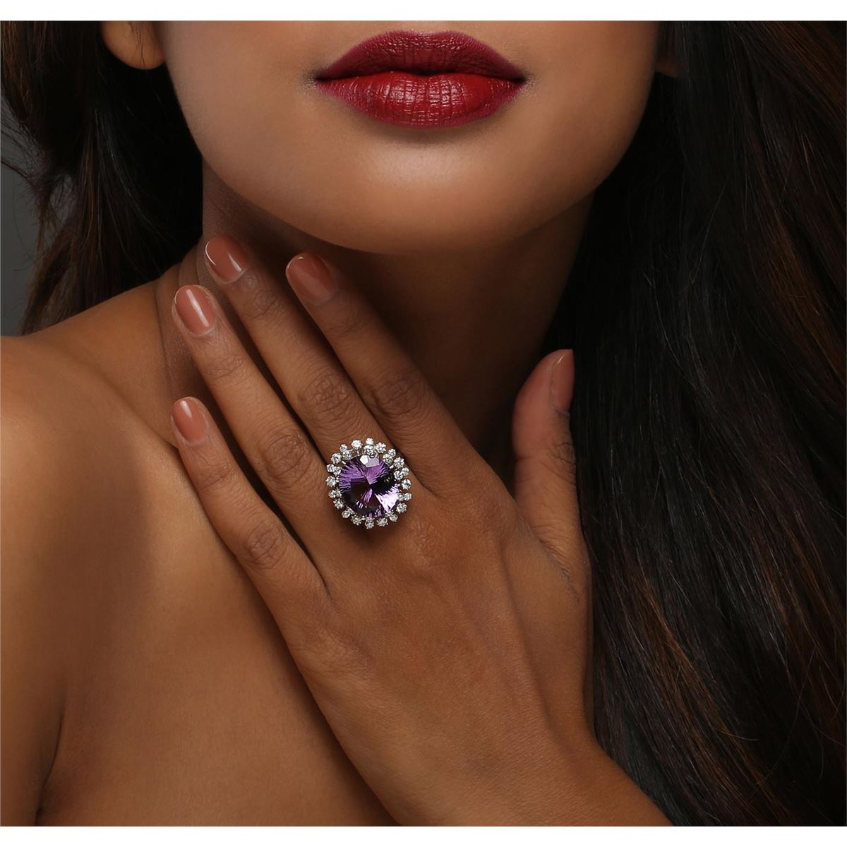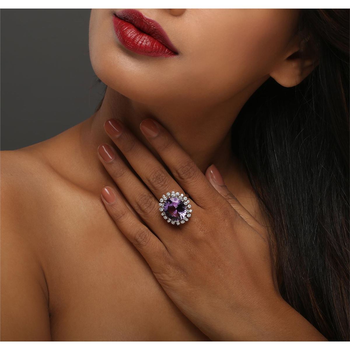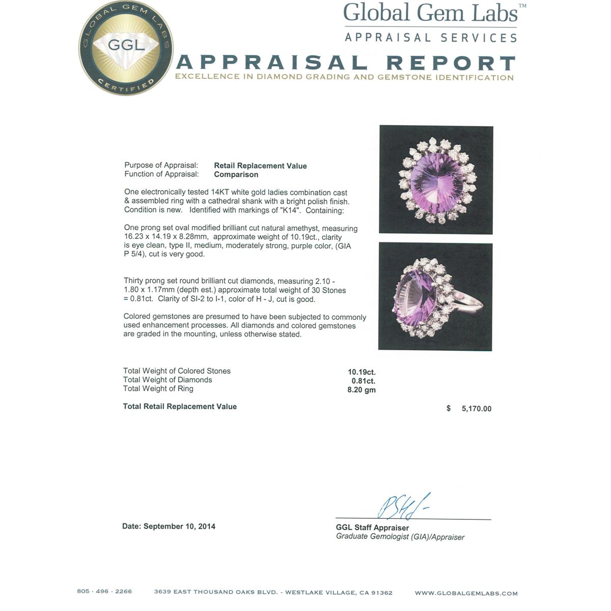 One electronically tested 14KT white gold ladies combination cast & assembled ring with a cathedral shank with a bright polish finish. Identified with markings of "K14". Condition is new. Containing: One prong set oval modified brilliant cut natural amethyst, measuring 16.23 x 14.19 x 8.28mm, approximate weight of 10.19ct., clarity is eye clean, type II, medium, moderately strong, purple color, (GIA P 5/4), cut is very good. Thirty prong set round brilliant cut diamonds, measuring 2.10 - 1.80 x 1.17mm (depth est.) approximate total weight of 30 Stones = 0.81ct. Clarity: SI-2 to I-1. Color: H - J, Cut is Good. Colored gemstones are presumed to have been subjected to commonly used enhancement processes. All diamonds and colored gemstones are graded in the mounting, unless otherwise stated. Total Weight of Colored Stones 10.19ct. Total Weight of Diamonds 0.81ct. Total Weight of Ring 8.20 grams. GGL Appraised at $5,170.00.