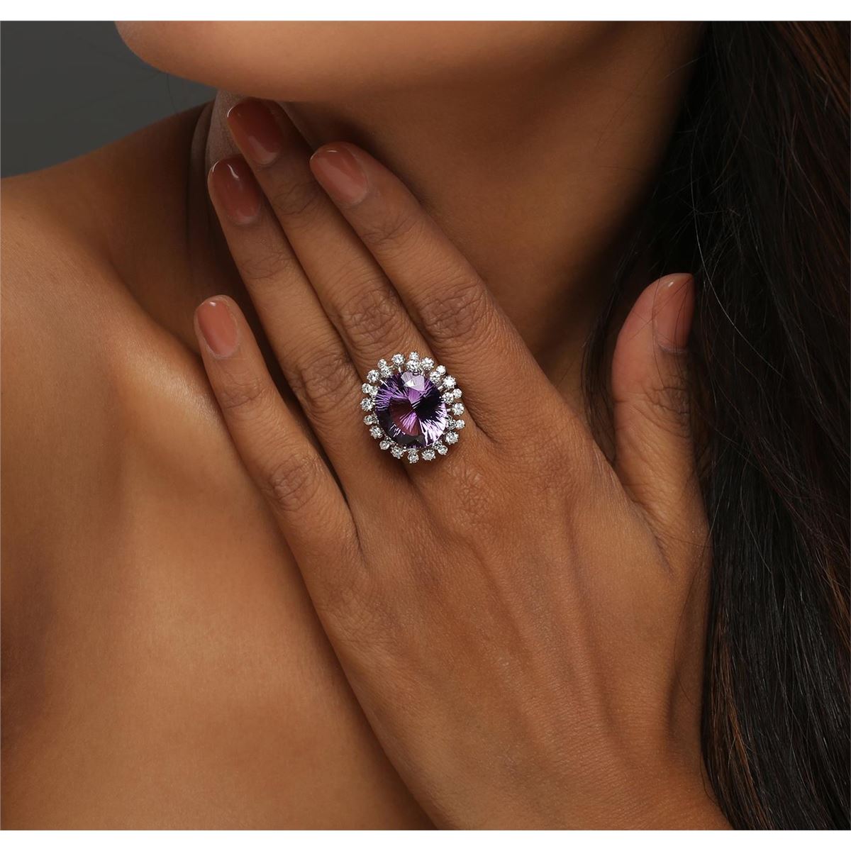 One electronically tested 14KT white gold ladies combination cast & assembled ring with a cathedral shank with a bright polish finish. Identified with markings of "K14". Condition is new. Containing: One prong set oval modified brilliant cut natural amethyst, measuring 16.23 x 14.19 x 8.28mm, approximate weight of 10.19ct., clarity is eye clean, type II, medium, moderately strong, purple color, (GIA P 5/4), cut is very good. Thirty prong set round brilliant cut diamonds, measuring 2.10 - 1.80 x 1.17mm (depth est.) approximate total weight of 30 Stones = 0.81ct. Clarity: SI-2 to I-1. Color: H - J, Cut is Good. Colored gemstones are presumed to have been subjected to commonly used enhancement processes. All diamonds and colored gemstones are graded in the mounting, unless otherwise stated. Total Weight of Colored Stones 10.19ct. Total Weight of Diamonds 0.81ct. Total Weight of Ring 8.20 grams. GGL Appraised at $5,170.00.
