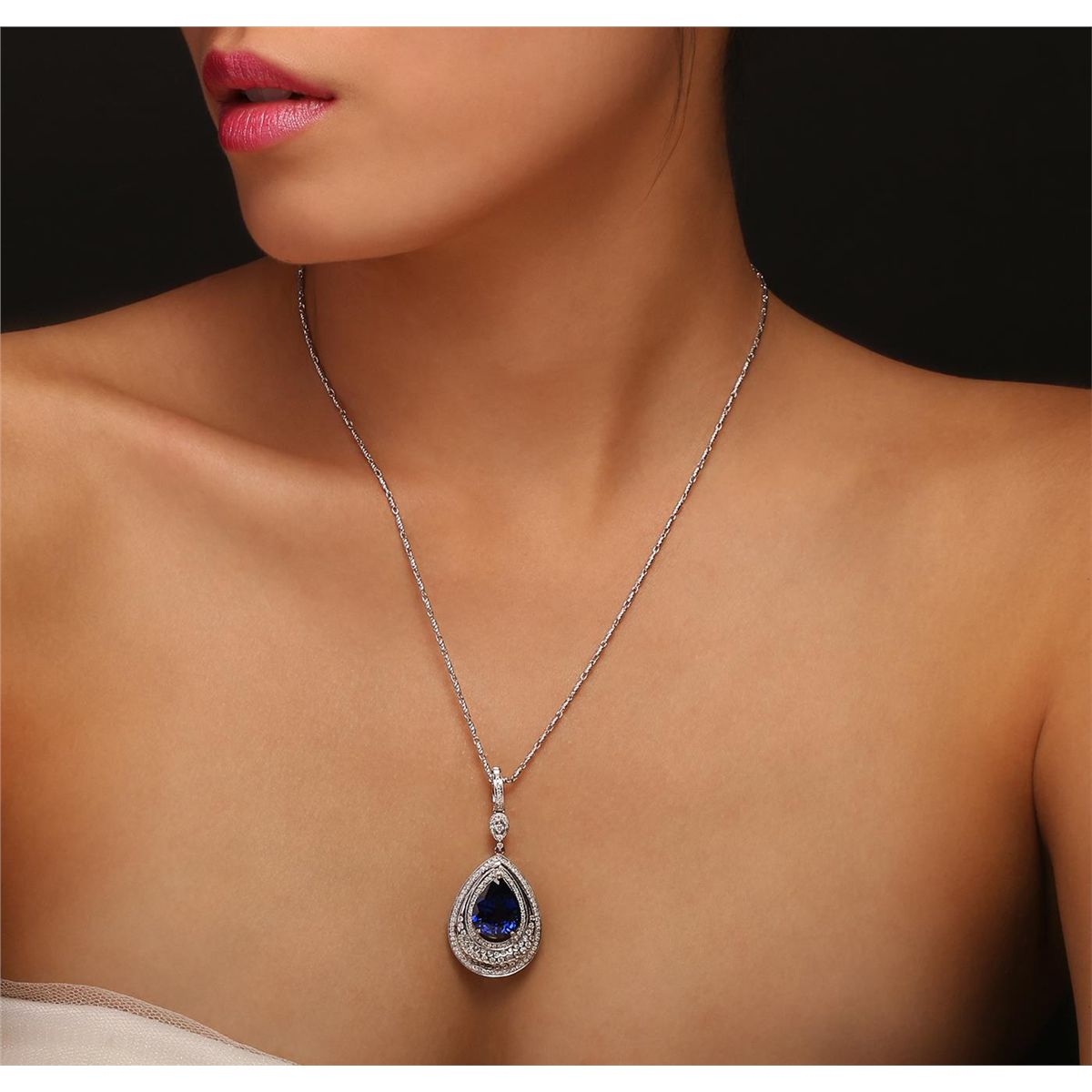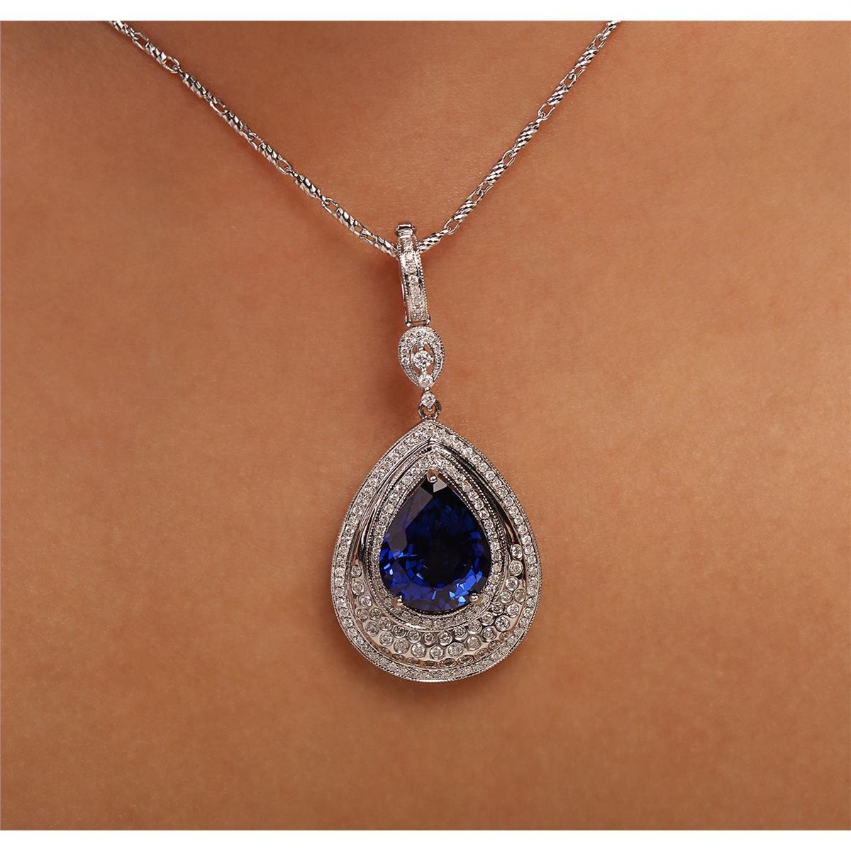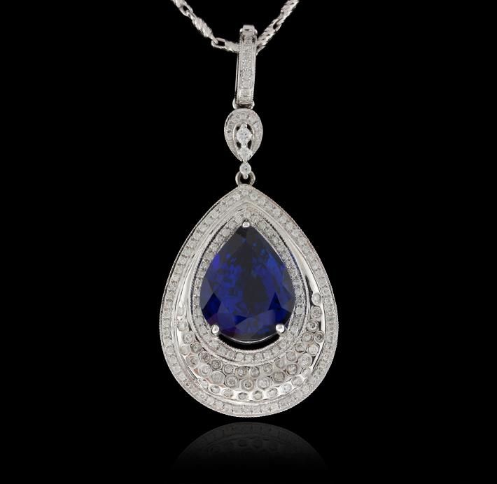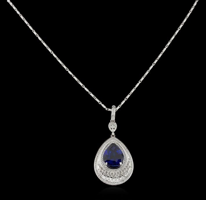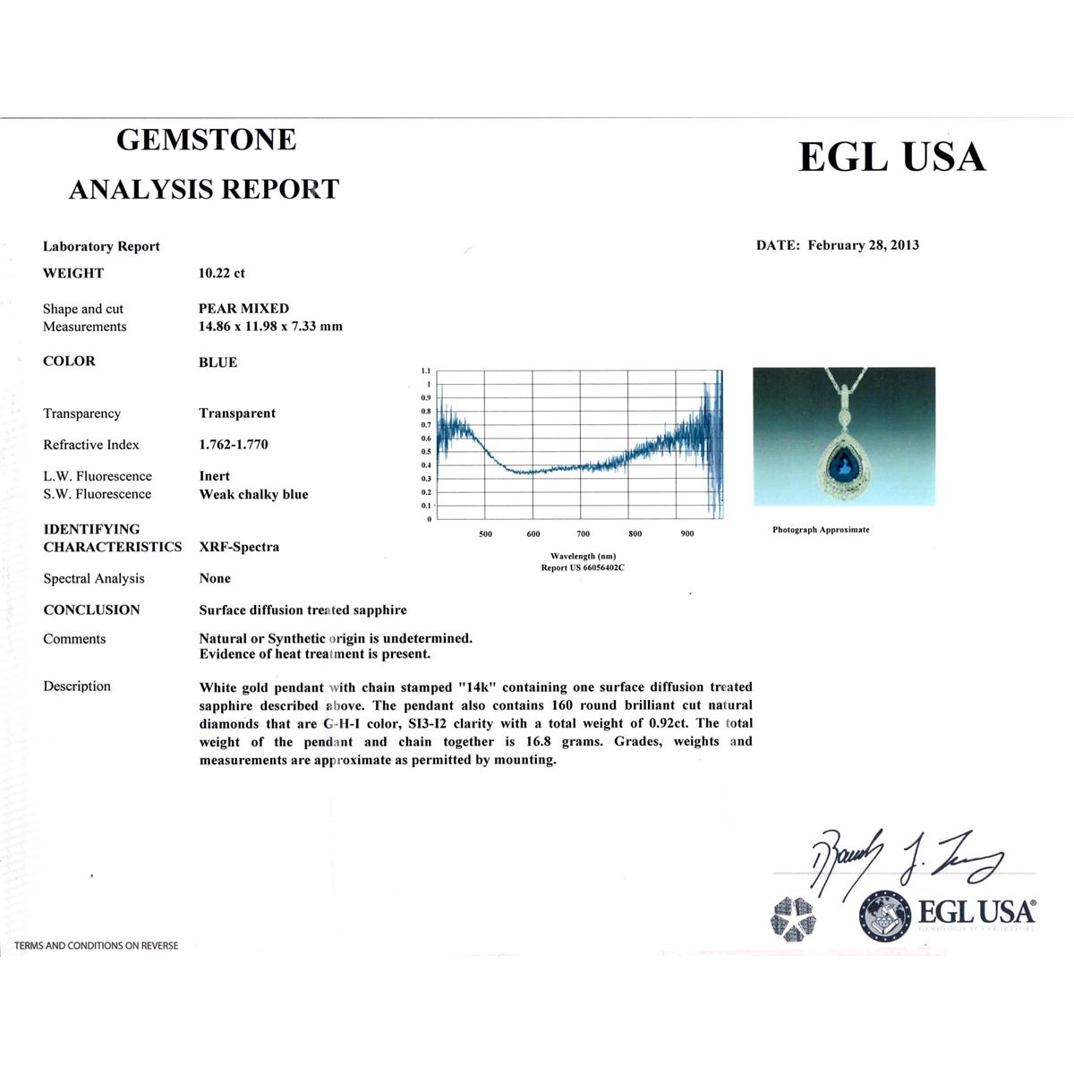 Laboratory Report Us 66056402C. Weight: 10.22 ct. Shape and cut: Pear mixed. Measurement: 14.86 x 11.98 x 7.33 mm. Color: Blue. Transparency: Transparent. Refractive Index: 1.762-1.770. L.W. Fluorescence: Inert. S.W. Fluorescence: Weak chalky blue. Identifying. Characteristics: XRF-Spectra. Spectra Analysis: None. Conclusion : Surface diffusion treated sapphire. Comments: Natural or Synthetic origin is undetermined. Evidence of heat treatment is present. Description: White gold pendant with chain stamped "14K" containing one surface diffusion treated sapphire described above. The pendant also contains 160 round brilliant cut natural diamonds that are G-H-I color, SI3-12 clarity with a total weight of 0.92ct. The total weight of the pendant and chain together is 16.8 grams. Grade, weights and measurements are approximate as permitted by mounting.