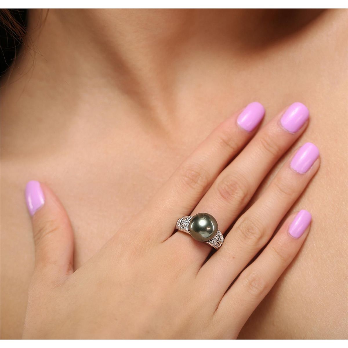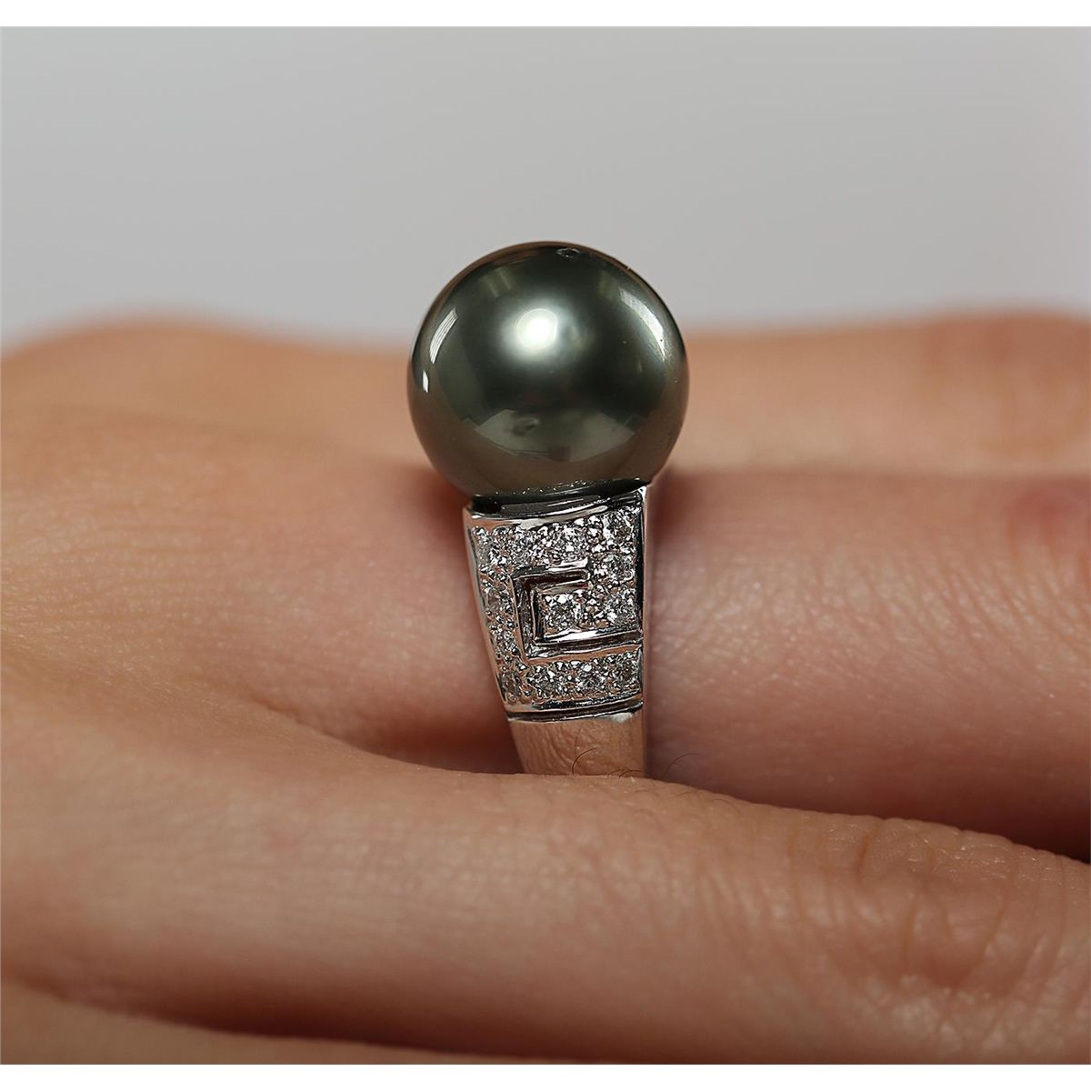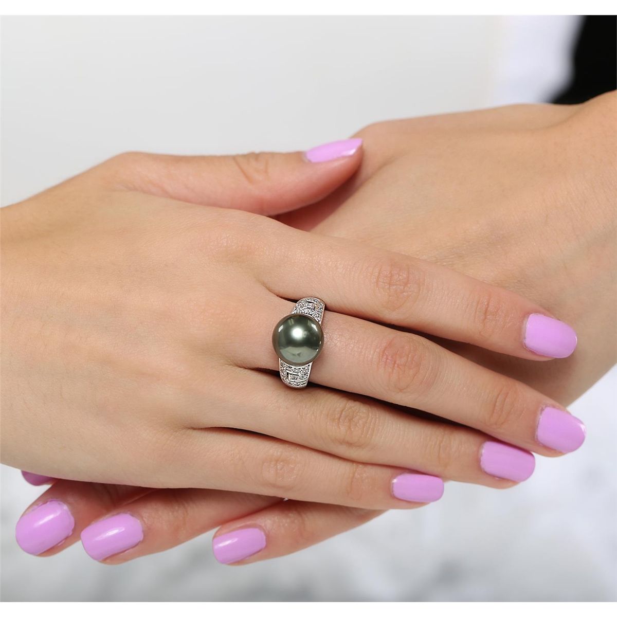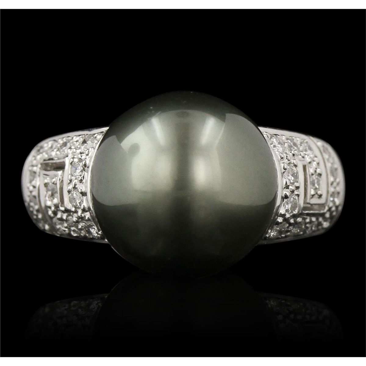 One electronically tested 14KT white gold Ladies combination cast & assembled cocktail ring with a bright polish finish. Identified with markings of "14K". Condition is excellent. Containing: One black tahitian cultured pearl, 10.2mm in size. The pearl is gray in color and exhibiting orient with a medium luster, medium nacre, round, lightly spotted. Twenty-Six prong set round brilliant cut diamonds, measuring 1.60 - 1.50 x 0.93mm (depth est.) approximate total weight of 26 Stones = 0.35ct. Clarity of SI-2 to I-1, Color of G - H, Cut is Good. Total Weight of Diamonds 0.35ct. Total Weight of Ring 7.60gm. GGL Appraised at $6,495.00.