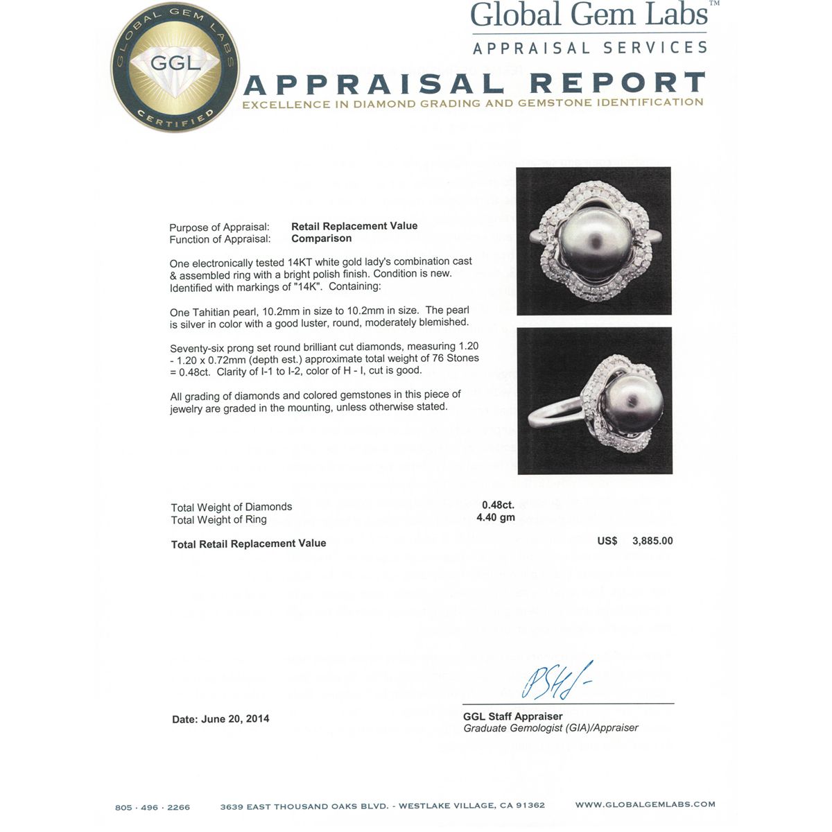 One electronically tested 14KT white gold Ladies combination cast & assembled ring with a bright polish finish. Condition is new. Identified with markings of "14K". Containing: One Tahitian pearl, 10.2mm in size to 10.2mm in size. The pearl is silver in color with a good luster, round, moderately blemished. Seventy-Six prong set round brilliant cut diamonds, measuring 1.20 - 1.20 x 0.72mm (depth est.) approximate. Total Weight of 76 Stones = 0.48ct. Clarity: I-1 to I-2. Color: H - I, Cut is Good. All grading of diamonds and colored gemstones in this piece of jewelry are graded in the mounting, unless otherwise stated. Total Weight of Diamonds 0.48ct. Total Weight of Ring 4.40 grams. GGL Appraised at $3,885.00.