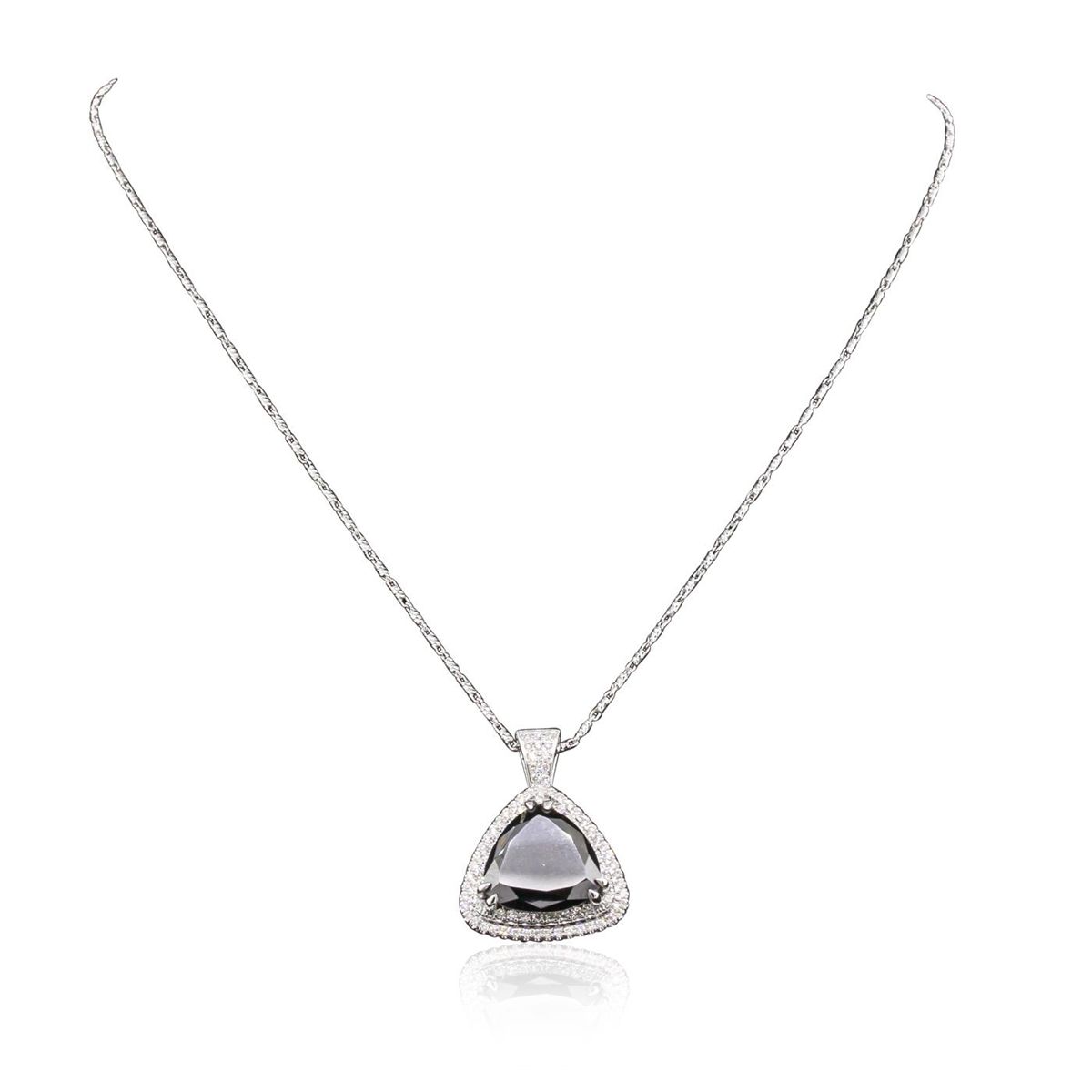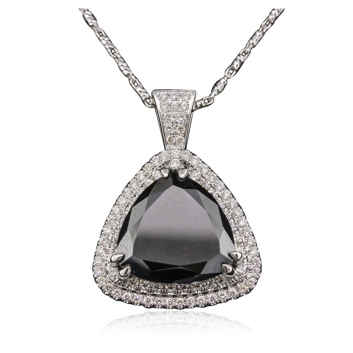One electronically tested 14KT white gold ladies cast & assembled black and white diamond pendant with chain. Condition is new, good workmanship. The pendant features a black diamond set within two tiered white diamond bezels, completed by a white diamond set bail. The pendant is supported by a sixteen inch length 14KT white gold designer style chain, terminating in a lobster claw clasp. Bright polish finish. Identified with markings of ""14K"". Containing: One prong set triangle cut diamond, measuring 14.30 x 13.90 x 7.80mm (depth est.), 8.00% GTCF approximate weight of 9.60ct. Indications of multiple laboratory enhancements. The specific gravity of black diamond is 3.120 to 3.165. Diamond tester results are non reactive. Graded in the setting. Clarity Déclassé‚ Color Fancy Black; Irradiated Depth 57.1% Table 56.8%. Eighty-Five prong set round brilliant cut diamonds, measuring 1.30 - 1.20 x 0.75mm (depth est.) approximate total weight of 85 Stones = 0.70ct. Graded in the setting. Clarity VS-1 to VS-2 Color G - I Total Weight of Diamonds 10.30 ct. Total Weight of Pendant With Chain 12.34 grams. AIG Appraised at $18,165.00.