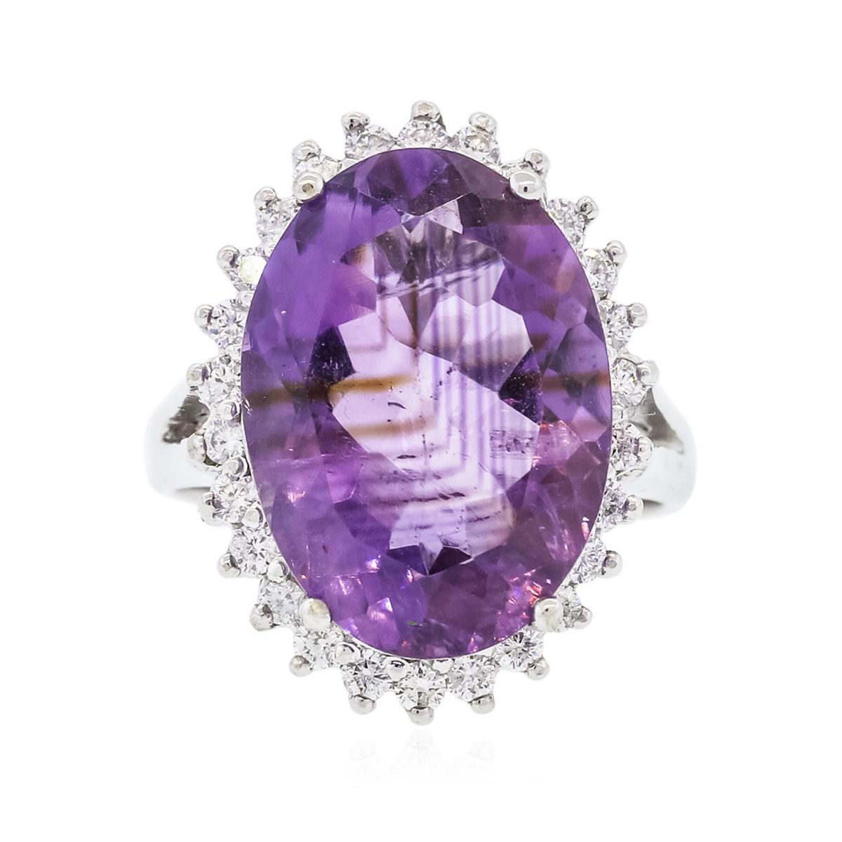 One electronically tested 14KT white gold ladies combination cast & assembled amethyst and diamond ring with a split shank with a bright polish finish. Identified with markings of "14K". Condition is new. Containing: One prong set oval modified brilliant cut natural amethyst, measuring 17.65 x 12.87 x 7.71mm, approximate weight of 10.33ct., clarity is eye clean, type II, medium light, very slightly grayish, purple color, (GIA P 4/3), cut is good. Twenty-Six prong set round brilliant cut diamonds, measuring 1.80 - 1.80 x 1.08mm (depth est.) approximate total weight of 26 Stones = 0.55ct. Clarity: SI-1 to SI-2. Color: H - I, Cut is Good. Colored gemstones are presumed to have been subjected to commonly used enhancement processes. All diamonds and colored gemstones are graded in the mounting, unless otherwise stated. Total Weight of Colored Stones 10.33ct. Total Weight of Diamonds 0.55ct. Total Weight of Ring 8.40 grams. GGL Appraised at $4,145.00.