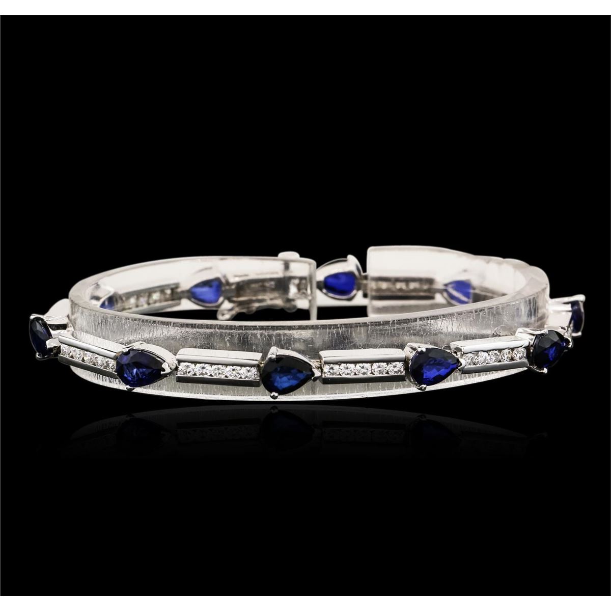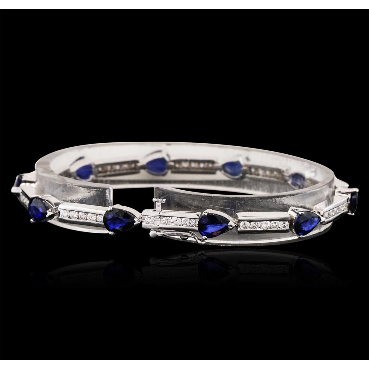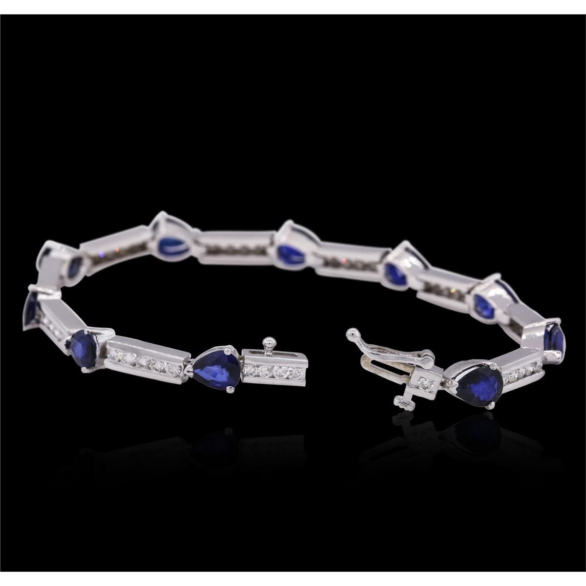 One electronically tested 14KT white gold ladies combination cast & assembled sapphire and diamond bracelet with a hidden box clasp with safety closer with a bright polish finish. Measurements: 7 in length. Identified with markings of 14K. Condition is new. Containing: Ten prong set pear modified brilliant cut natural blue sapphires, measuring 8.00 x 5.00 x 3.25mm, approximate total weight of 10.40ct., clarity is eye clean, type II, medium, moderately strong, blue color, (GIA B 5/4), cut is good. Fifty channel set round brilliant cut diamonds, measuring 2.00 - 2.00 x 1.20mm (depth est.) approximate total weight of 50 Stones = 1.46ct. Clarity: SI-1 to SI-2. Color: I - J, Cut is Good. Colored gemstones are presumed to have been subjected to commonly used enhancement processes. All diamonds and colored gemstones are graded in the mounting, unless otherwise stated. Total Weight of Colored Stones 10.40ct. Total Weight of Diamonds 1.46ct. Total Weight of Bracelet 16.60 grams. GGL Appraised at $10,800.00.