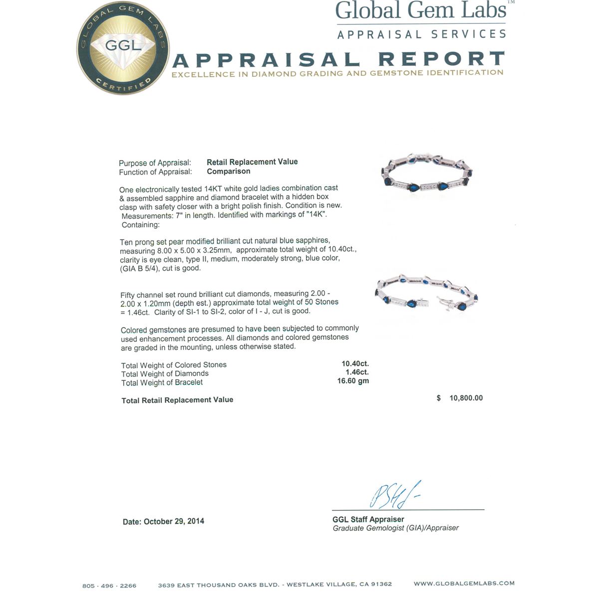 One electronically tested 14KT white gold ladies combination cast & assembled sapphire and diamond bracelet with a hidden box clasp with safety closer with a bright polish finish. Measurements: 7 in length. Identified with markings of 14K. Condition is new. Containing: Ten prong set pear modified brilliant cut natural blue sapphires, measuring 8.00 x 5.00 x 3.25mm, approximate total weight of 10.40ct., clarity is eye clean, type II, medium, moderately strong, blue color, (GIA B 5/4), cut is good. Fifty channel set round brilliant cut diamonds, measuring 2.00 - 2.00 x 1.20mm (depth est.) approximate total weight of 50 Stones = 1.46ct. Clarity: SI-1 to SI-2. Color: I - J, Cut is Good. Colored gemstones are presumed to have been subjected to commonly used enhancement processes. All diamonds and colored gemstones are graded in the mounting, unless otherwise stated. Total Weight of Colored Stones 10.40ct. Total Weight of Diamonds 1.46ct. Total Weight of Bracelet 16.60 grams. GGL Appraised at $10,800.00.