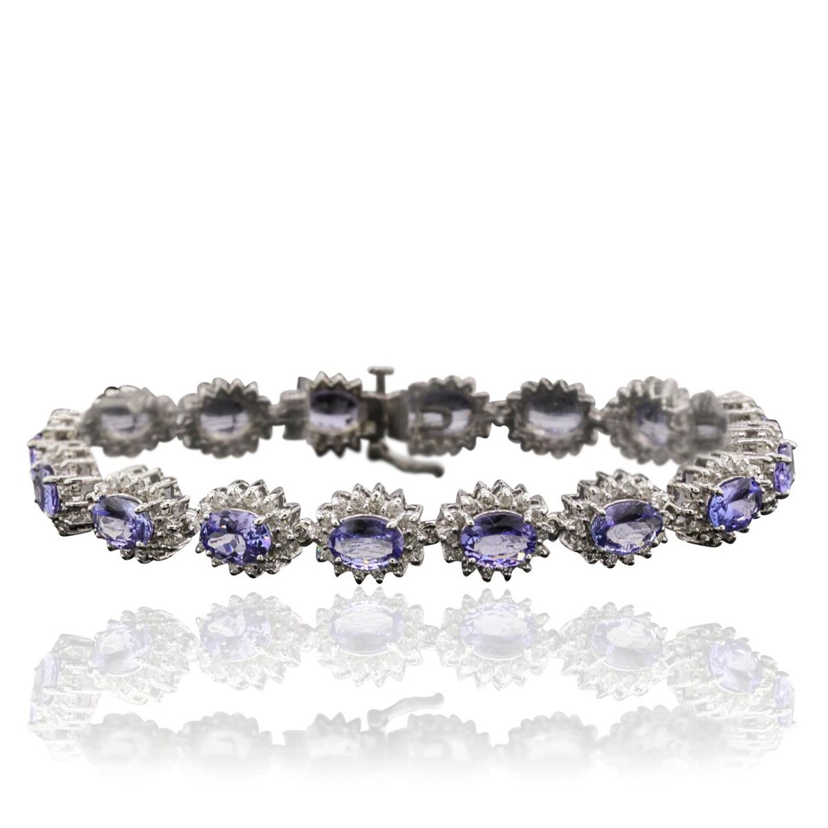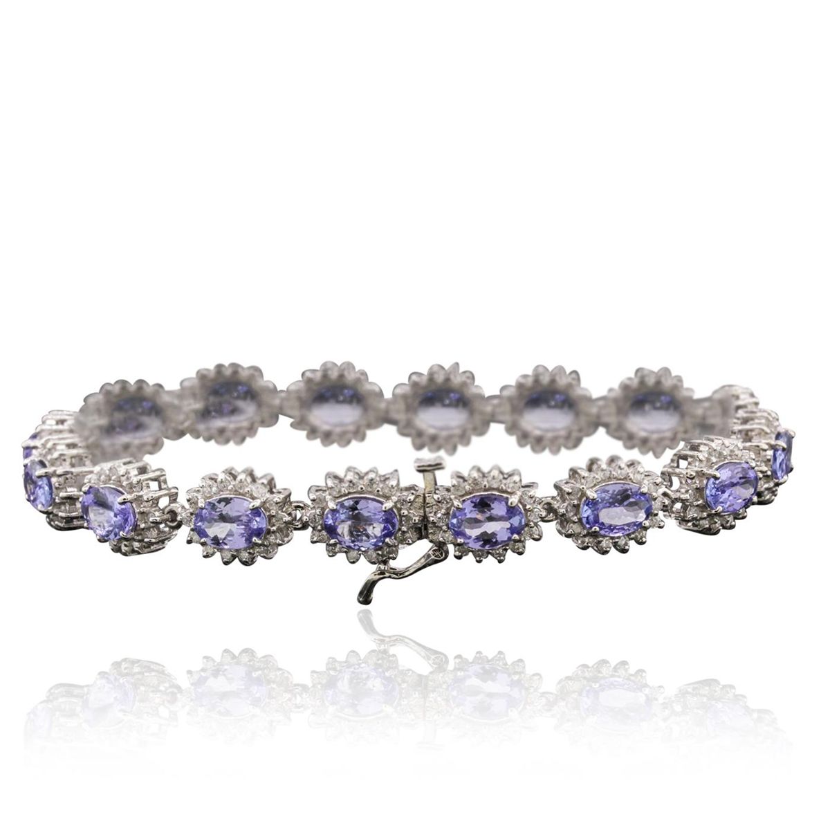 One electronically tested 14KT white gold ladies combination cast & assembled bracelet with a hidden box clasp with a bright polish finish. Condition is new. Measurements: 7" in length. Identified with markings of "14K". Containing: Sixteen prong set oval modified brilliant cut natural tanzanites, measuring 6.90 x 4.65 x 2.90mm, approximate. Total Weight of 10.40ct., clarity is eye clean, type I, medium light, very slightly grayish, violet color, (GIA V 4/3), cut is good. Two Hundred Twenty-Four prong set round brilliant cut diamonds, measuring 1.40 - 1.40 x 0.84mm (depth est.) approximate. Total Weight of 224 Stones = 2.24ct. Clarity: I-1 to I-2. Color: I - J, Cut is Good. Colored gemstones are presumed to have been subjected to commonly used enhancement processes. All diamonds and colored gemstones are graded in the mounting, unless otherwise stated. Total Weight of Colored Stones 10.40ct. Total Weight of Diamonds 2.24ct. Total Weight of Bracelet 19.90 grams. GGL Appraised at $15,005.00.