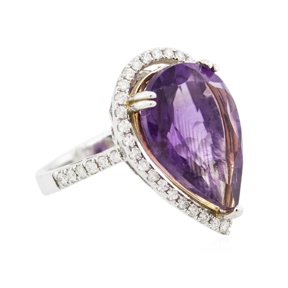 One electronically tested 14KT white gold ladies cast amethyst and diamond ring with a bright polish finish. The featured tanzanite is set within a diamond bezel supported by diamond set shoulders, completed by a three millimeter wide band. Identified with markings of "14K". Condition is new, good workmanship. Containing: One prong set pear brilliant cut natural amethyst, measuring 18.00 x 12.50 x 8.05mm, 8% bulge factor, approximate weight of 10.41ct., clarity is moderately included, type II, medium dark, very slightly grayish, reddish purple color, (GIA rP 6/3), cut is good. Transmitting light with a minimum of distortion, transparent. Naturally occurring internal & external characteristics are present. Colored Stone Grading Report attached. Graded in the setting. Forty-Six prong set round brilliant cut diamonds, measuring 1.60 - 1.50 x 0.93mm (depth est.) approximate total weight of 46 Stones = 0.72ct. Graded in the setting. Clarity: SI-1 to I-1. Color: G - I. Total Weight of Colored Stones 10.41ct. Total Weight of Diamonds 0.72ct. Total Weight of Ring 7.38 grams. AIG Appraised at $3,485.00.