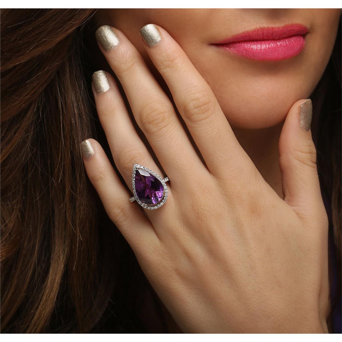 One electronically tested 14KT white gold ladies cast amethyst and diamond ring with a bright polish finish. The featured tanzanite is set within a diamond bezel supported by diamond set shoulders, completed by a three millimeter wide band. Identified with markings of "14K". Condition is new, good workmanship. Containing: One prong set pear brilliant cut natural amethyst, measuring 18.00 x 12.50 x 8.05mm, 8% bulge factor, approximate weight of 10.41ct., clarity is moderately included, type II, medium dark, very slightly grayish, reddish purple color, (GIA rP 6/3), cut is good. Transmitting light with a minimum of distortion, transparent. Naturally occurring internal & external characteristics are present. Colored Stone Grading Report attached. Graded in the setting. Forty-Six prong set round brilliant cut diamonds, measuring 1.60 - 1.50 x 0.93mm (depth est.) approximate total weight of 46 Stones = 0.72ct. Graded in the setting. Clarity: SI-1 to I-1. Color: G - I. Total Weight of Colored Stones 10.41ct. Total Weight of Diamonds 0.72ct. Total Weight of Ring 7.38 grams. AIG Appraised at $3,485.00.