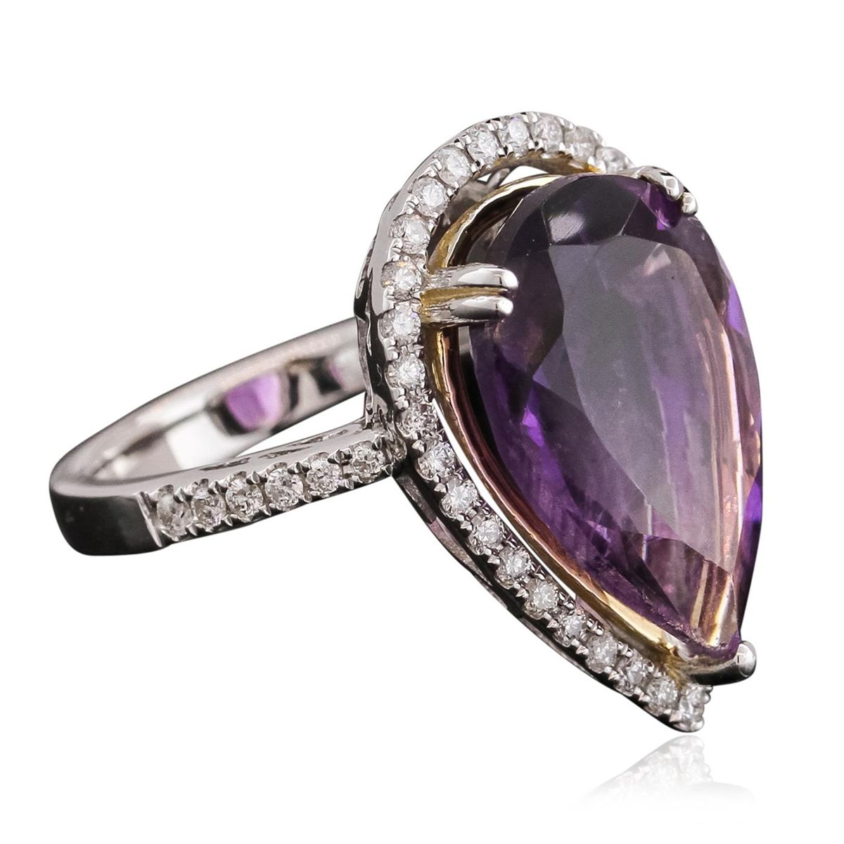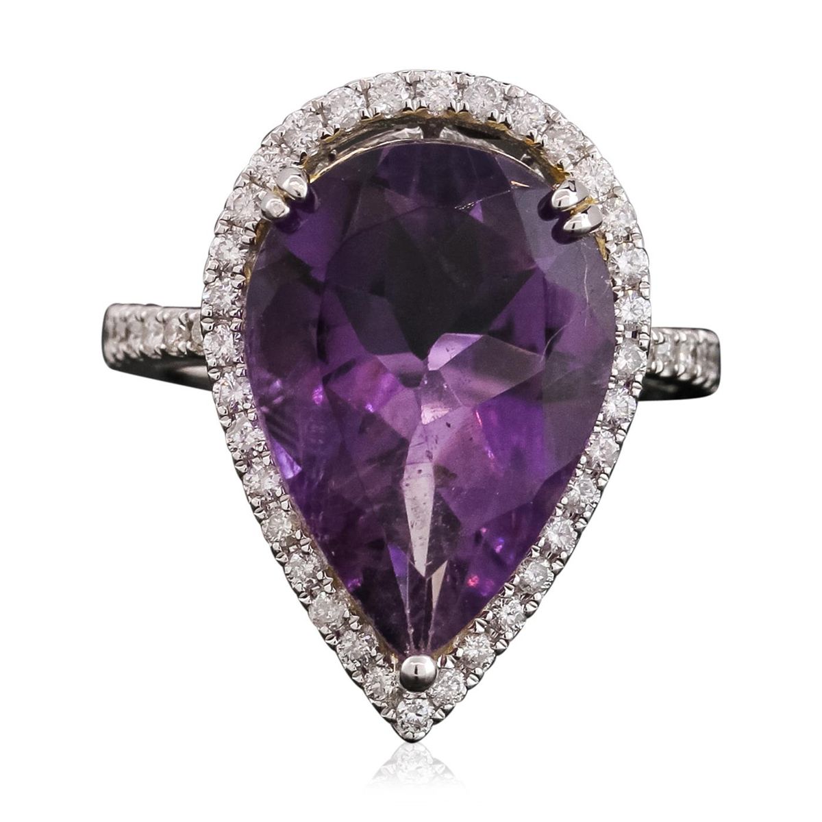 One electronically tested 14KT white gold ladies cast amethyst and diamond ring with a bright polish finish. The featured tanzanite is set within a diamond bezel supported by diamond set shoulders, completed by a three millimeter wide band. Identified with markings of "14K". Condition is new, good workmanship. Containing: One prong set pear brilliant cut natural amethyst, measuring 18.00 x 12.50 x 8.05mm, 8% bulge factor, approximate weight of 10.41ct., clarity is moderately included, type II, medium dark, very slightly grayish, reddish purple color, (GIA rP 6/3), cut is good. Transmitting light with a minimum of distortion, transparent. Naturally occurring internal & external characteristics are present. Colored Stone Grading Report attached. Graded in the setting. Forty-Six prong set round brilliant cut diamonds, measuring 1.60 - 1.50 x 0.93mm (depth est.) approximate total weight of 46 Stones = 0.72ct. Graded in the setting. Clarity: SI-1 to I-1. Color: G - I. Total Weight of Colored Stones 10.41ct. Total Weight of Diamonds 0.72ct. Total Weight of Ring 7.38 grams. AIG Appraised at $3,485.00.