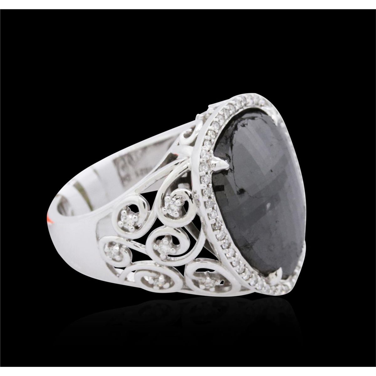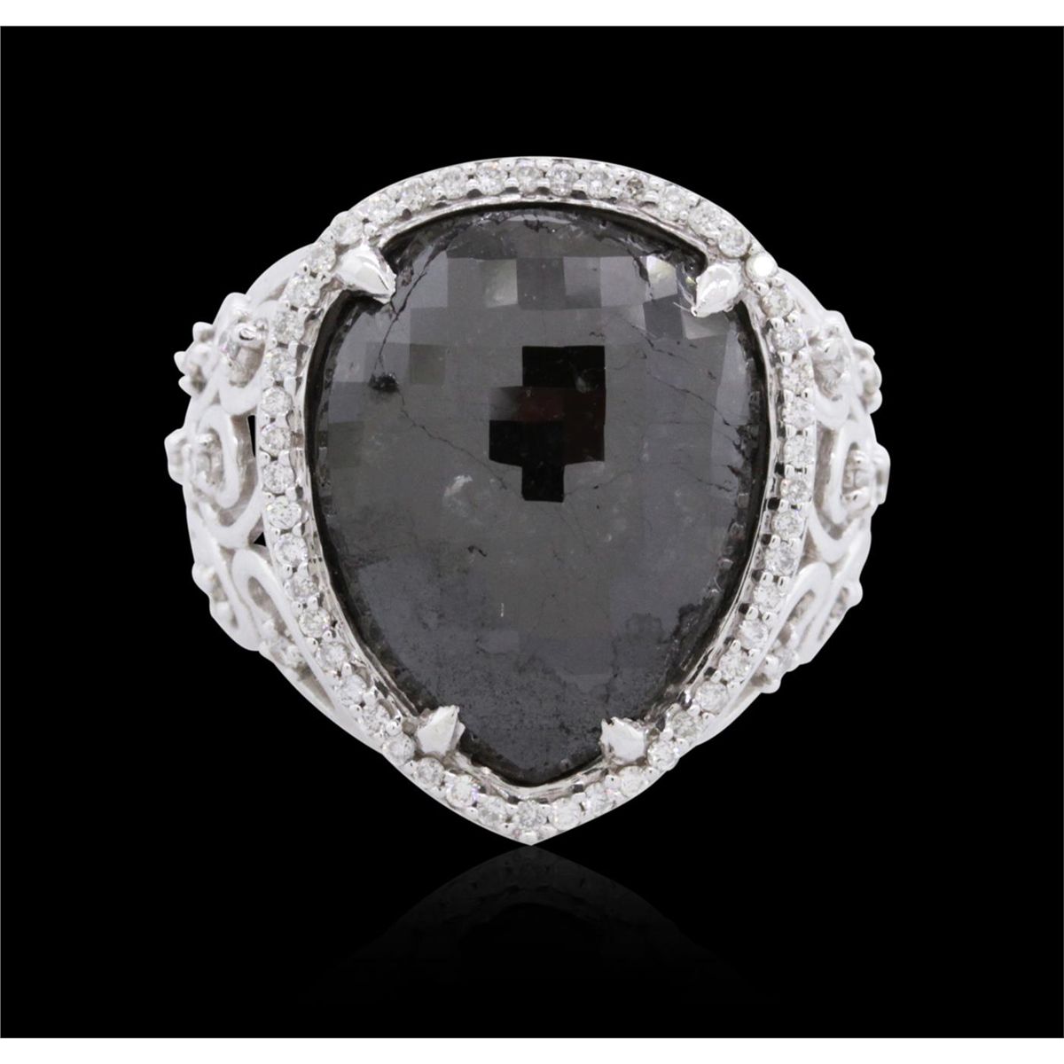 One 14KT white gold ring containing one natural pear rose cut fancy black diamond, enhanced for color, with a total weight of 10.21ct. The ring also contains diamonds graded G-H color, SI3-I1 clarity with a total weight of 0.20ct. Total weight of the ring