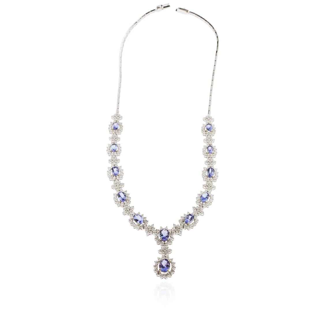 One electronically tested 14KT white gold ladies cast tanzanite and diamond necklace with a hidden box clasp with safety closer with a bright polish finish. Measurements: 16.50" in length Identified with markings of "14K". Condition is new. Containing: One prong set oval modified brilliant cut natural tanzanite, measuring 8.50 x 6.50 x 4.23mm, approximate weight of 1.64ct., clarity is eye clean, type I, medium, very slightly grayish, violet color, (GIA V 5/3), cut is good. Eleven prong set oval modified brilliant cut natural tanzanites, measuring 7.00 x 5.00 x 3.25mm, approximate total weight of 8.80ct., clarity is eye clean, type I, medium light, very slightly grayish, violet color, (GIA V 4/3), cut is good. Two Hundred Sixty-Three prong set round brilliant cut diamonds, measuring 2.00 - 1.60 x 1.08mm (depth est.) approximate total weight of 263 Stones = 5.60ct. Clarity: SI-1 to SI-2. Color: I - J, Cut is Good. Colored gemstones are presumed to have been subjected to commonly used enhancement processes. All diamonds and colored gemstones are graded in the mounting, unless otherwise stated. Total Weight of Colored Stones 10.44ct. Total Weight of Diamonds 5.60ct. Total Weight of Necklace 29.70 grams. GGL Appraised at $21,265.00.