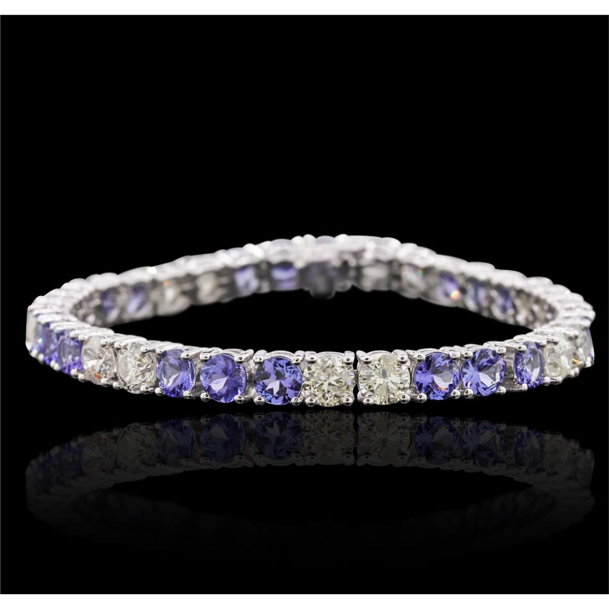 One electronically tested 14KT white gold ladies cast & assembled tanzanite and diamond bracelet with a bright polish finish. Condition is new, good workmanship. Seven inch length bracelet features a tanzanite and diamond ribbon, terminating in a hidden clasp with safety bar. Identified with markings of "14K". Containing: Twenty-one prong set round brilliant cut natural tanzanites, measuring 5.00 - 4.90 x 2.80 mm, 6%. bulge factor, approximate. Total Weight of 10.50ct., clarity is eye clean, type I, medium dark, moderately strong, bluish violet color, (GIA bV 6/4), cut is good. Transmitting light with no distortion, transparent. Color grade is an average for the group. Graded in the setting. Tanzanite is a very rare gemstone that is only found in the country of Tanzania. Originally discovered in 1967. Tiffany & Company, named the stone Tanzanite. It is found in the Usumburu Mountains that border the Umba Valley of northern Tanzania. Tanzanite occurs in gray, brown, violet, blue, reddish-purple, & green. The gem is interesting because of its exceptional pleochroism. Rotated in different directions a tanzanite will exhibit multiple changes of color. Tanzanite has a low tolerance to ultrasonic cleaning, and should not be cleaned using this method. Fourteen prong set round brilliant cut diamonds, measuring 5.10 - 5.00 x 3.25mm (depth est.) approximate. Total Weight of 14 Stones = 7.17ct. The color grade reflects the entire range of color for this group. Graded in the setting. Clarity: I-1 to I-2 . Color: I - L. Total Weight of Colored Stones 10.50ct.. Total Weight of Diamonds 7.17ct.. Total Weight of Bracelet 20.28gm. AIG Appraised at $45,345.00.