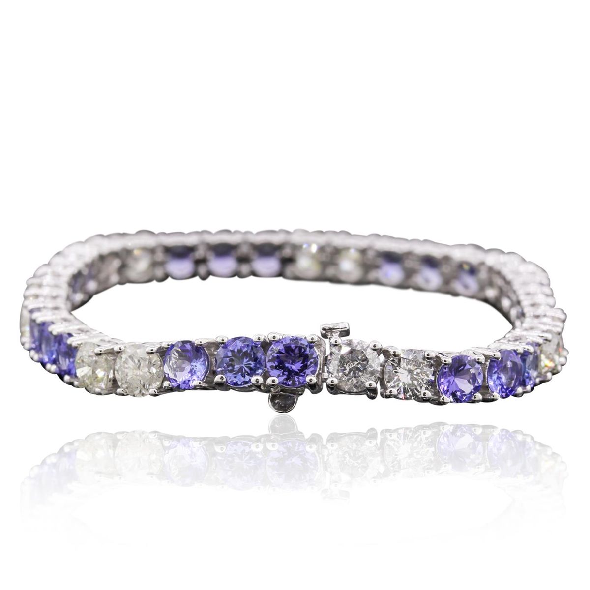 One electronically tested 14KT white gold ladies cast & assembled tanzanite and diamond bracelet with a bright polish finish. Condition is new, good workmanship. Seven inch length bracelet features a tanzanite and diamond ribbon, terminating in a hidden clasp with safety bar. Identified with markings of "14K". Containing: Twenty-one prong set round brilliant cut natural tanzanites, measuring 5.00 - 4.90 x 2.80 mm, 6%. bulge factor, approximate. Total Weight of 10.50ct., clarity is eye clean, type I, medium dark, moderately strong, bluish violet color, (GIA bV 6/4), cut is good. Transmitting light with no distortion, transparent. Color grade is an average for the group. Graded in the setting. Tanzanite is a very rare gemstone that is only found in the country of Tanzania. Originally discovered in 1967. Tiffany & Company, named the stone Tanzanite. It is found in the Usumburu Mountains that border the Umba Valley of northern Tanzania. Tanzanite occurs in gray, brown, violet, blue, reddish-purple, & green. The gem is interesting because of its exceptional pleochroism. Rotated in different directions a tanzanite will exhibit multiple changes of color. Tanzanite has a low tolerance to ultrasonic cleaning, and should not be cleaned using this method. Fourteen prong set round brilliant cut diamonds, measuring 5.10 - 5.00 x 3.25mm (depth est.) approximate. Total Weight of 14 Stones = 7.17ct. The color grade reflects the entire range of color for this group. Graded in the setting. Clarity: I-1 to I-2 . Color: I - L. Total Weight of Colored Stones 10.50ct.. Total Weight of Diamonds 7.17ct.. Total Weight of Bracelet 20.28gm. AIG Appraised at $45,345.00.
