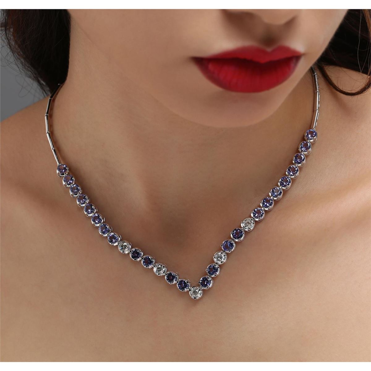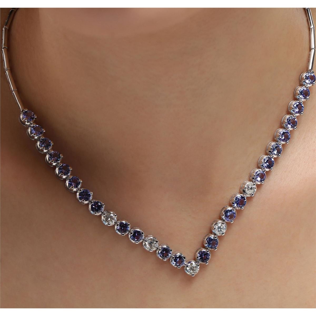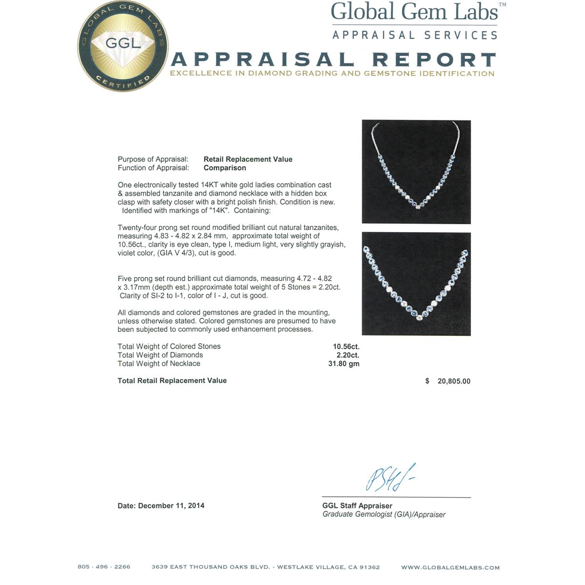 One electronically tested 14KT white gold ladies combination cast & assembled tanzanite and diamond necklace with a hidden box clasp with safety closer with a bright polish finish. Identified with markings of "14K". Condition is new. Containing: Twenty-four prong set round modified brilliant cut natural tanzanites, measuring 4.83 - 4.82 x 2.84 mm, approximate total weight of 10.56ct., clarity is eye clean, type I, medium light, very slightly grayish, violet color, (GIA V 4/3), cut is good. Five prong set round brilliant cut diamonds, measuring 4.72 - 4.82 x 3.17mm (depth est.) approximate total weight of 5 Stones = 2.20ct. Clarity: SI-2 to I-1. Color: I - J, Cut is Good. All diamonds and colored gemstones are graded in the mounting, unless otherwise stated. Colored gemstones are presumed to have been subjected to commonly used enhancement processes. Total Weight of Colored Stones 10.56ct. Total Weight of Diamonds 2.20ct. Total Weight of Necklace 31.80 grams. GGL Appraised at $20,805.00.