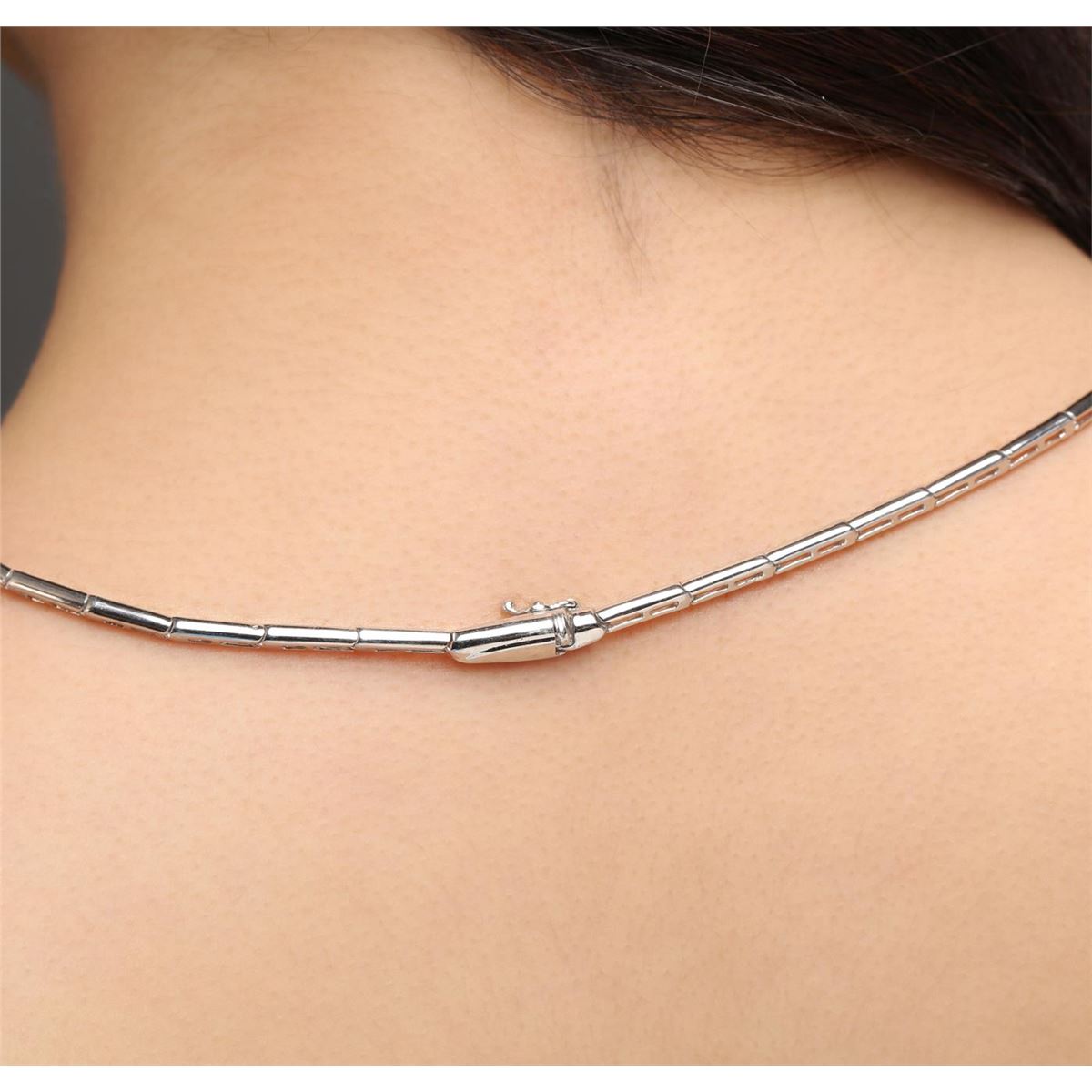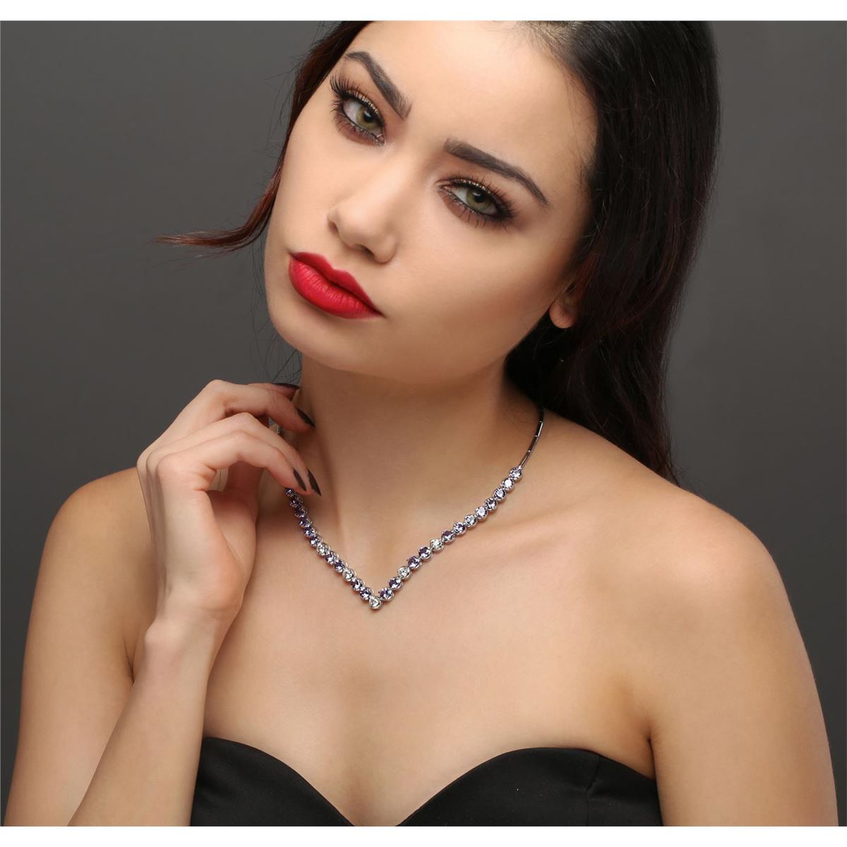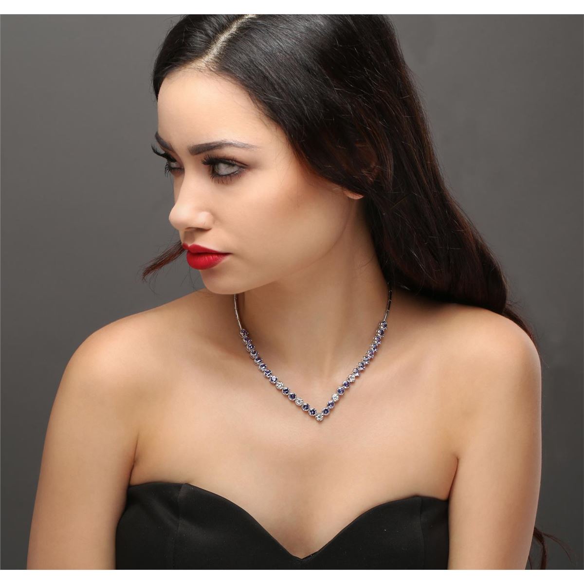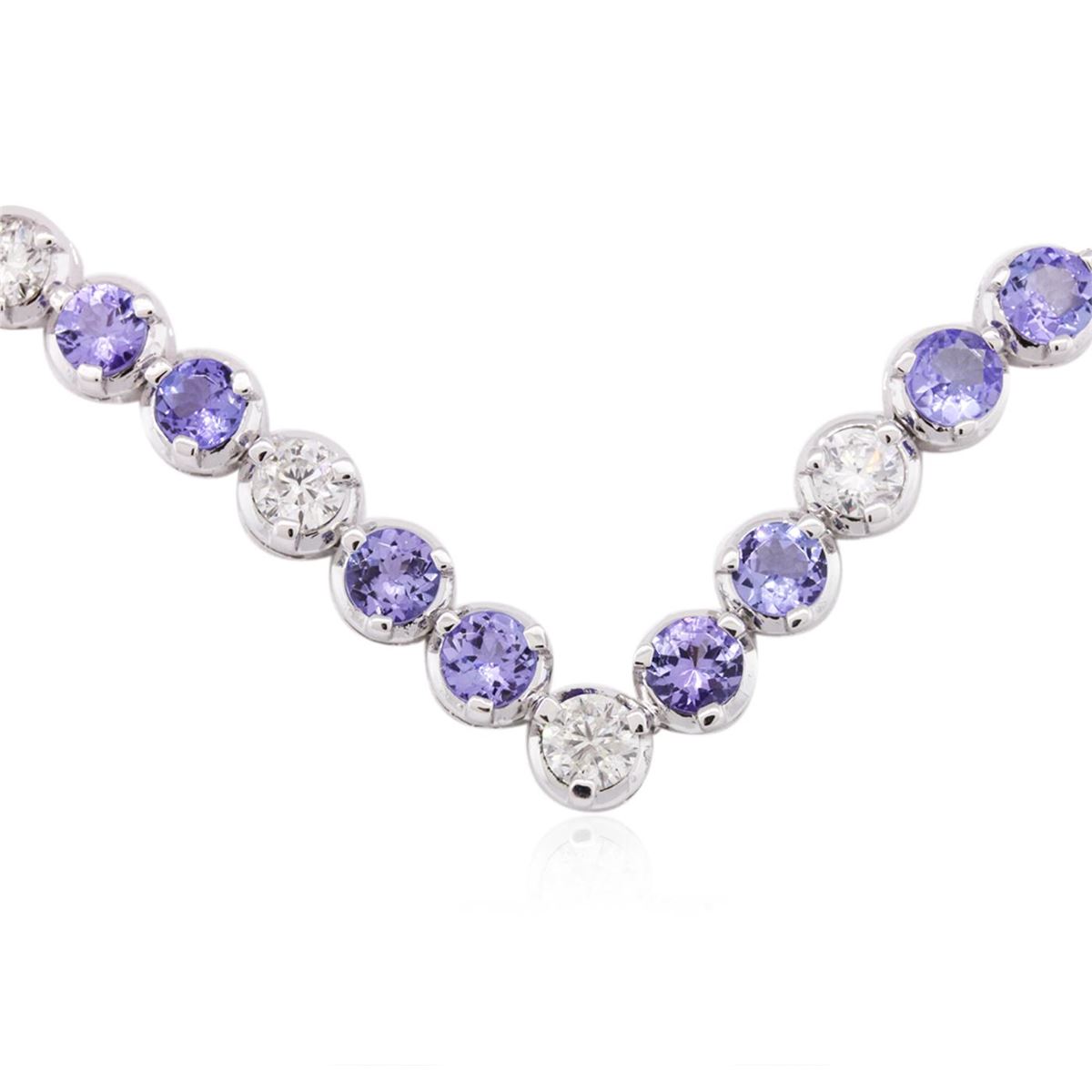 One electronically tested 14KT white gold ladies combination cast & assembled tanzanite and diamond necklace with a hidden box clasp with safety closer with a bright polish finish. Identified with markings of "14K". Condition is new. Containing: Twenty-four prong set round modified brilliant cut natural tanzanites, measuring 4.83 - 4.82 x 2.84 mm, approximate total weight of 10.56ct., clarity is eye clean, type I, medium light, very slightly grayish, violet color, (GIA V 4/3), cut is good. Five prong set round brilliant cut diamonds, measuring 4.72 - 4.82 x 3.17mm (depth est.) approximate total weight of 5 Stones = 2.20ct. Clarity: SI-2 to I-1. Color: I - J, Cut is Good. All diamonds and colored gemstones are graded in the mounting, unless otherwise stated. Colored gemstones are presumed to have been subjected to commonly used enhancement processes. Total Weight of Colored Stones 10.56ct. Total Weight of Diamonds 2.20ct. Total Weight of Necklace 31.80 grams. GGL Appraised at $20,805.00.