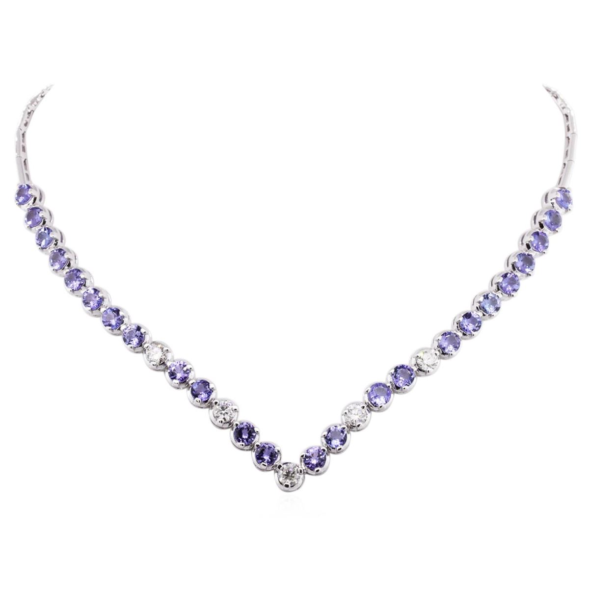 One electronically tested 14KT white gold ladies combination cast & assembled tanzanite and diamond necklace with a hidden box clasp with safety closer with a bright polish finish. Identified with markings of "14K". Condition is new. Containing: Twenty-four prong set round modified brilliant cut natural tanzanites, measuring 4.83 - 4.82 x 2.84 mm, approximate total weight of 10.56ct., clarity is eye clean, type I, medium light, very slightly grayish, violet color, (GIA V 4/3), cut is good. Five prong set round brilliant cut diamonds, measuring 4.72 - 4.82 x 3.17mm (depth est.) approximate total weight of 5 Stones = 2.20ct. Clarity: SI-2 to I-1. Color: I - J, Cut is Good. All diamonds and colored gemstones are graded in the mounting, unless otherwise stated. Colored gemstones are presumed to have been subjected to commonly used enhancement processes. Total Weight of Colored Stones 10.56ct. Total Weight of Diamonds 2.20ct. Total Weight of Necklace 31.80 grams. GGL Appraised at $20,805.00.