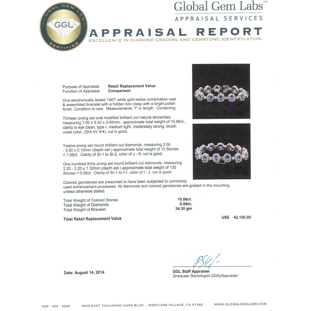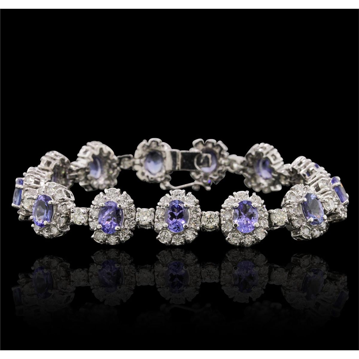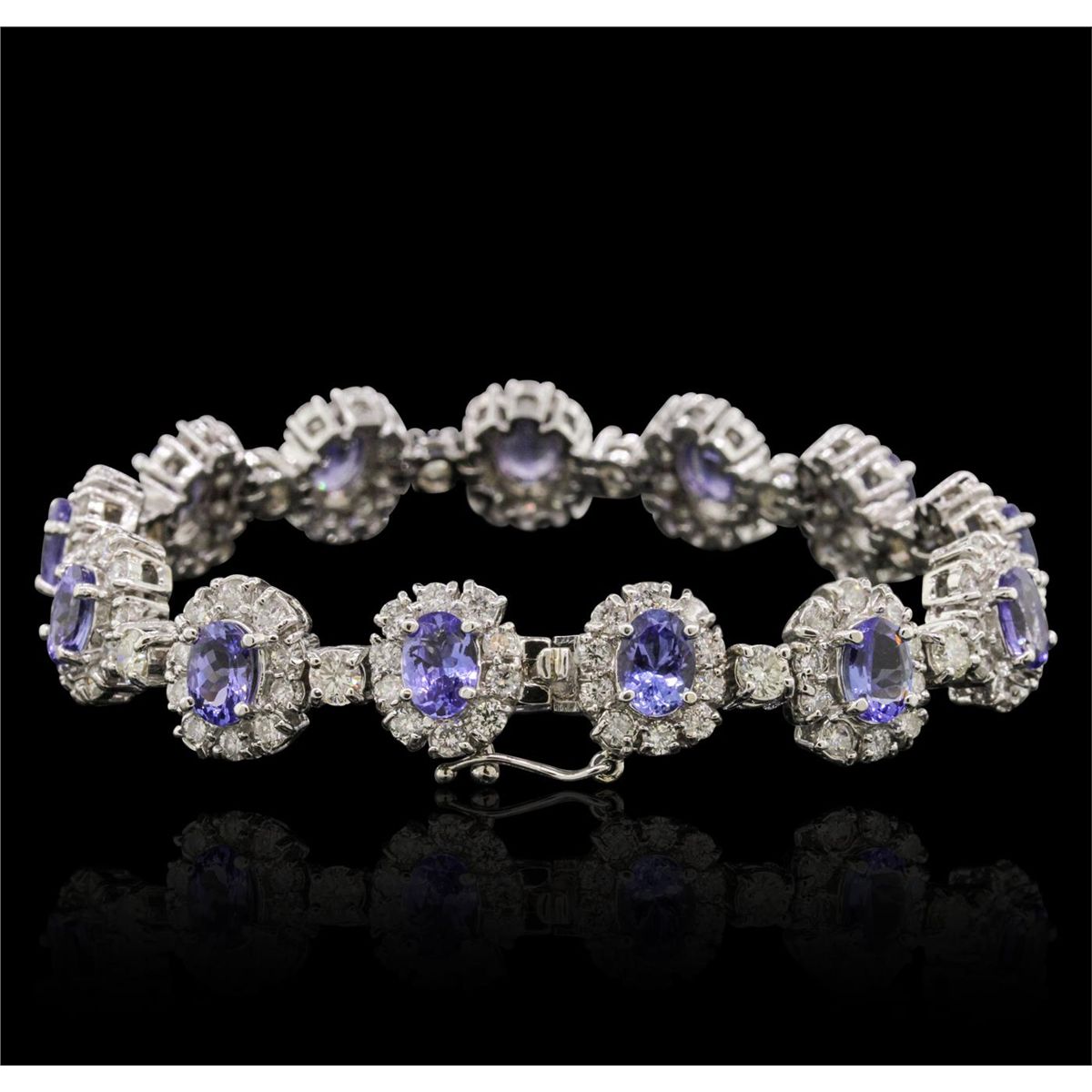 One electronically tested 14KT white gold ladies combination cast & assembled bracelet with a hidden box clasp with a bright polish finish. Condition is new. Measurements: 7" in length. Containing: Thirteen prong set oval modified brilliant cut natural tanzanites, measuring 7.00 x 5.00 x 3.40mm, approximate total weight of 10.66ct., clarity is eye clean, type I, medium light, moderately strong, bluish violet color, (GIA bV 4/4), cut is good. Twelve prong set round brilliant cut diamonds, measuring 3.50 - 3.50 x 2.10mm (depth est.) approximate total weight of 12 Stones = 1.88ct. Clarity: SI-1 to SI-2. Color: J - K, Cut is Good. One Hundred Thirty prong set round brilliant cut diamonds, measuring 2.20 - 2.20 x 1.32mm (depth est.) approximate total weight of 130 Stones = 5.06ct. Clarity: SI-1 to I-1. Color: I - J, Cut is Good. Colored gemstones are presumed to have been subjected to commonly used enhancement processes. All diamonds and colored gemstones are graded in the mounting, unless otherwise stated. Total Weight of Colored Stones 10.66ct. Total Weight of Diamonds 6.94ct. Total Weight of Bracelet 34.30 grams. GGL Appraised at $42,150.00.