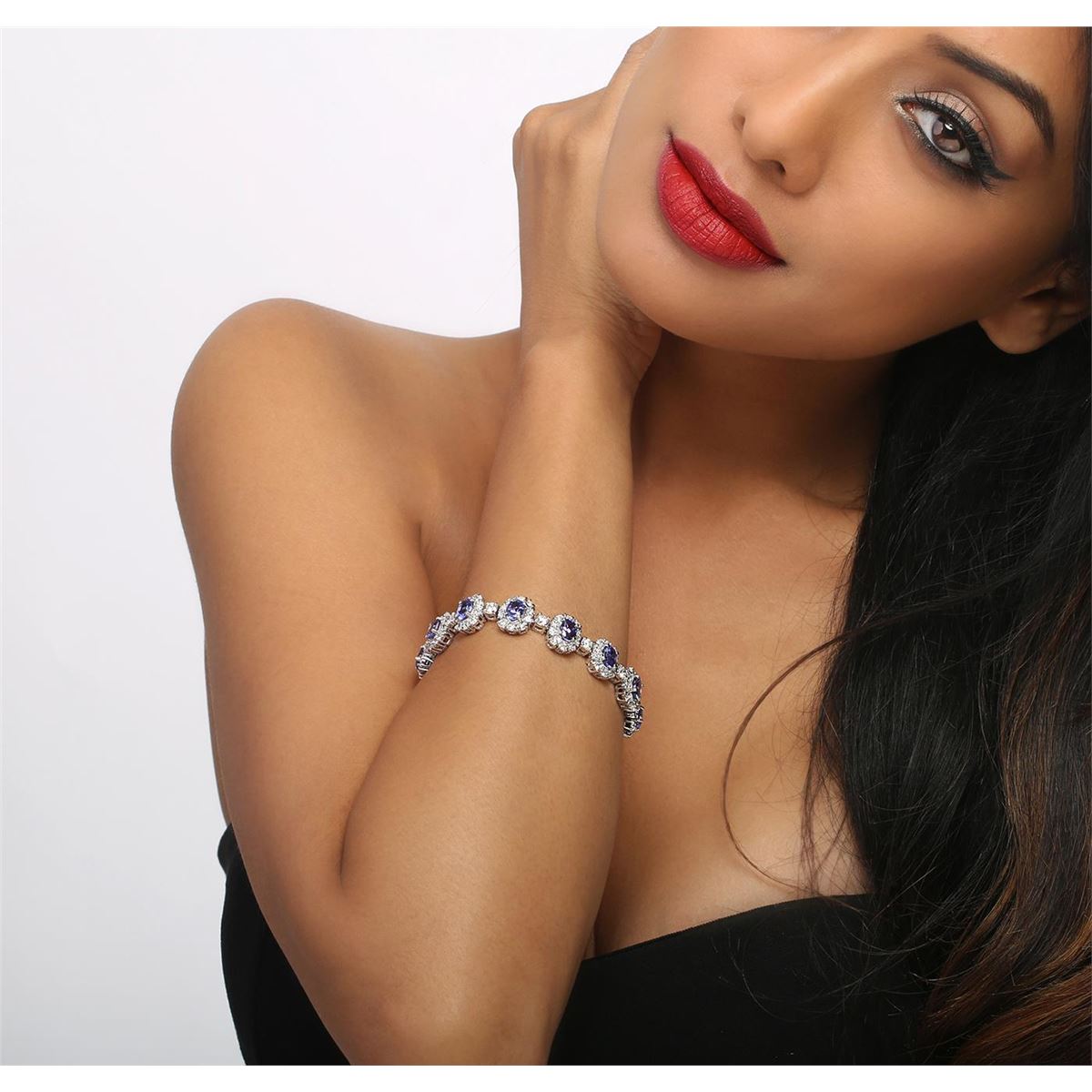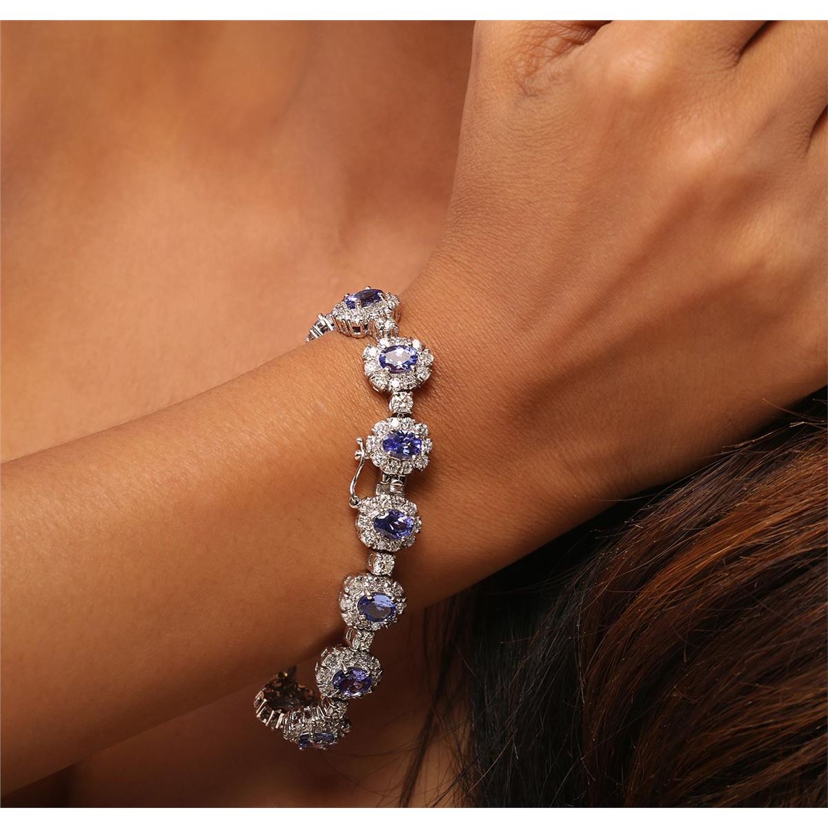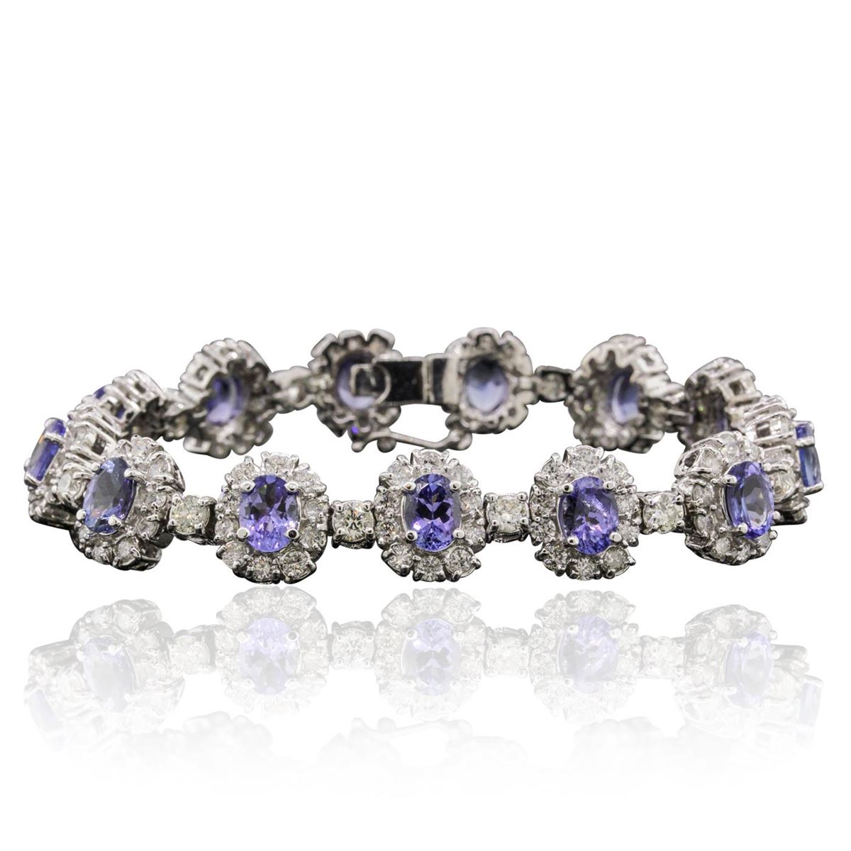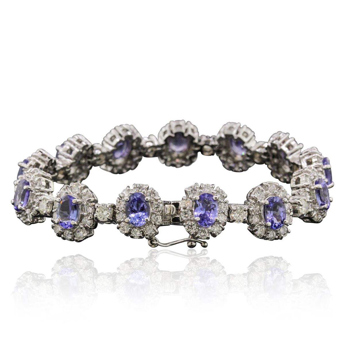 One electronically tested 14KT white gold ladies combination cast & assembled bracelet with a hidden box clasp with a bright polish finish. Condition is new. Measurements: 7" in length. Containing: Thirteen prong set oval modified brilliant cut natural tanzanites, measuring 7.00 x 5.00 x 3.40mm, approximate total weight of 10.66ct., clarity is eye clean, type I, medium light, moderately strong, bluish violet color, (GIA bV 4/4), cut is good. Twelve prong set round brilliant cut diamonds, measuring 3.50 - 3.50 x 2.10mm (depth est.) approximate total weight of 12 Stones = 1.88ct. Clarity: SI-1 to SI-2. Color: J - K, Cut is Good. One Hundred Thirty prong set round brilliant cut diamonds, measuring 2.20 - 2.20 x 1.32mm (depth est.) approximate total weight of 130 Stones = 5.06ct. Clarity: SI-1 to I-1. Color: I - J, Cut is Good. Colored gemstones are presumed to have been subjected to commonly used enhancement processes. All diamonds and colored gemstones are graded in the mounting, unless otherwise stated. Total Weight of Colored Stones 10.66ct. Total Weight of Diamonds 6.94ct. Total Weight of Bracelet 34.30 grams. GGL Appraised at $42,150.00.