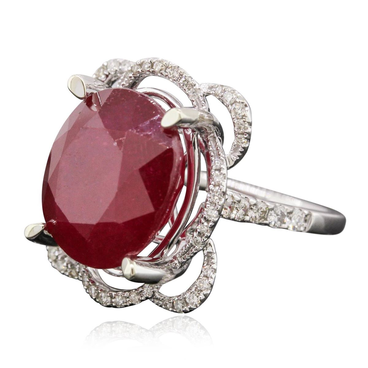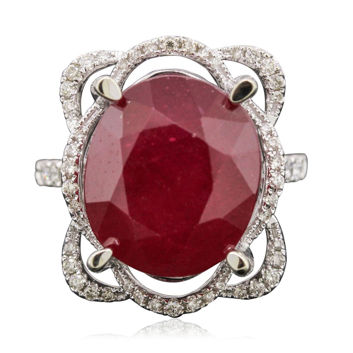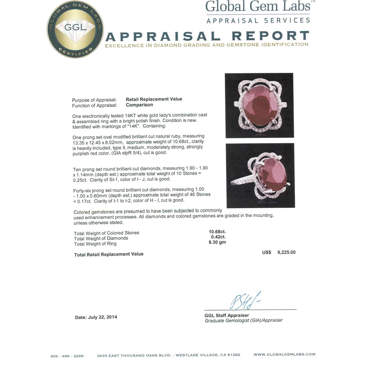 One electronically tested 14KT white gold ladies combination cast & assembled ring with a bright polish finish. Condition is new. Identified with markings of "14K". Containing: One prong set oval modified brilliant cut natural ruby, measuring 13.35 x 12.45 x 8.02mm, approximate weight of 10.68ct., clarity is heavily included, type II, medium, moderately strong, strongly purplish red color, (GIA stpR 5/4), cut is good. Ten prong set round brilliant cut diamonds, measuring 1.90 - 1.90 x 1.14mm (depth est.) approximate total weight of 10 Stones = 0.25ct. Clarity: SI-1. Color: I - J, Cut is Good. Forty-Six prong set round brilliant cut diamonds, measuring 1.00 - 1.00 x 0.60mm (depth est.) approximate total weight of 46 Stones = 0.17ct. Clarity: I-1 to I-2. Color: H - I, Cut is Good. Colored gemstones are presumed to have been subjected to commonly used enhancement processes. All diamonds and colored gemstones are graded in the mounting, unless otherwise stated. Total Weight of Colored Stones 10.68ct. Total Weight of Diamonds 0.42ct. Total Weight of Ring 8.30 grams. GGL Appraised at $9,225.00.