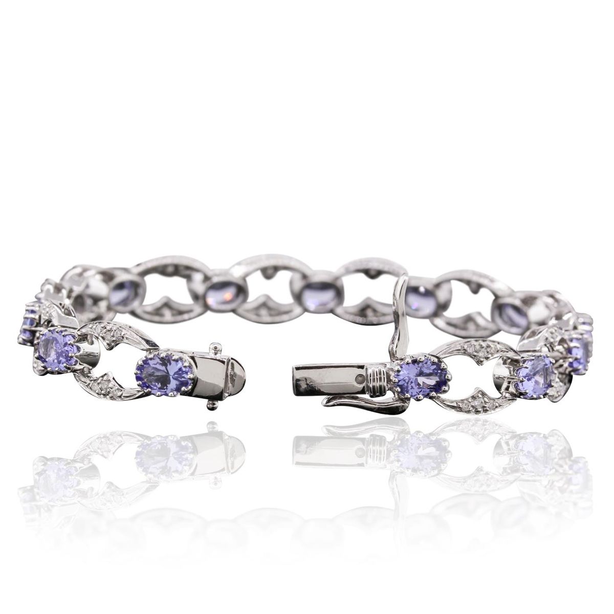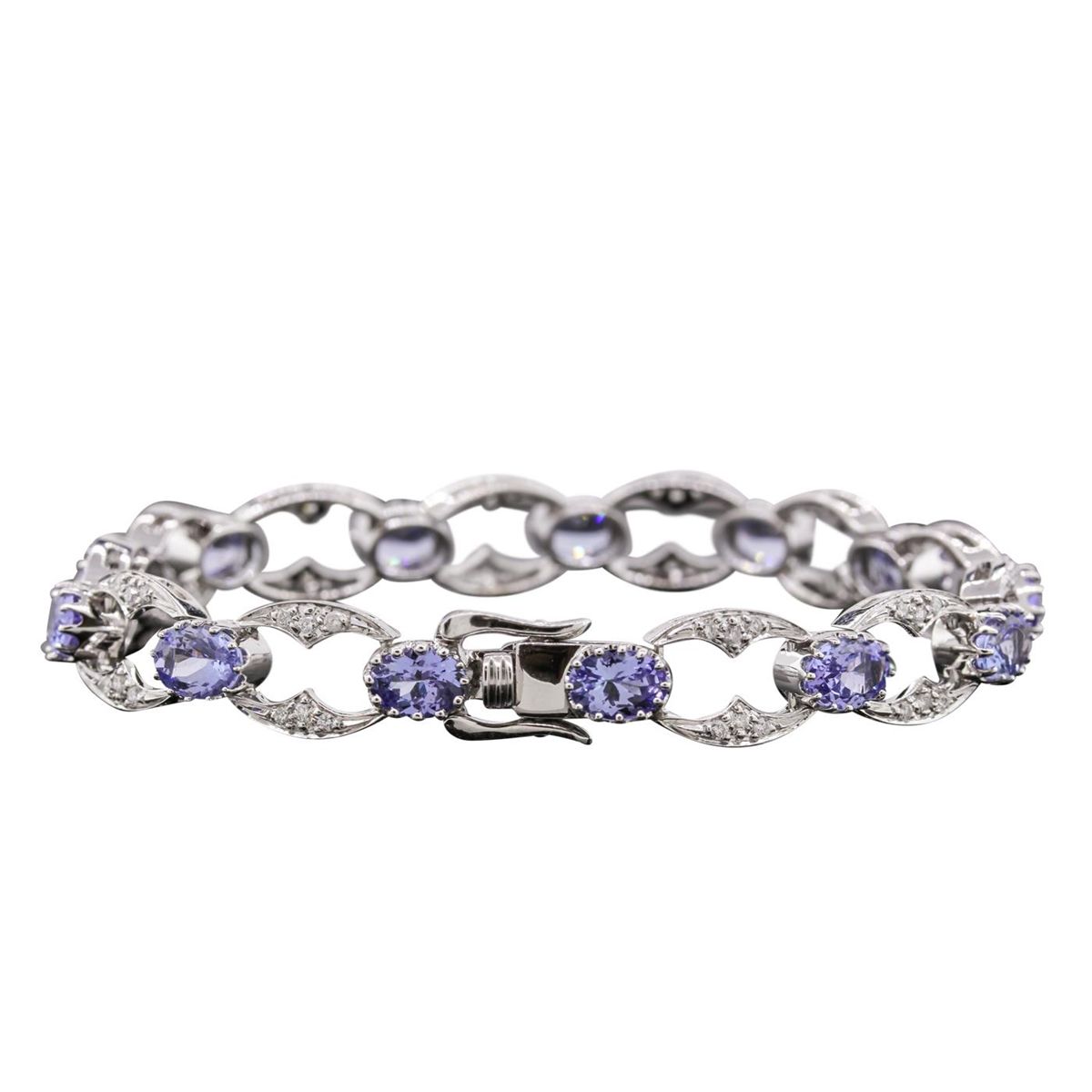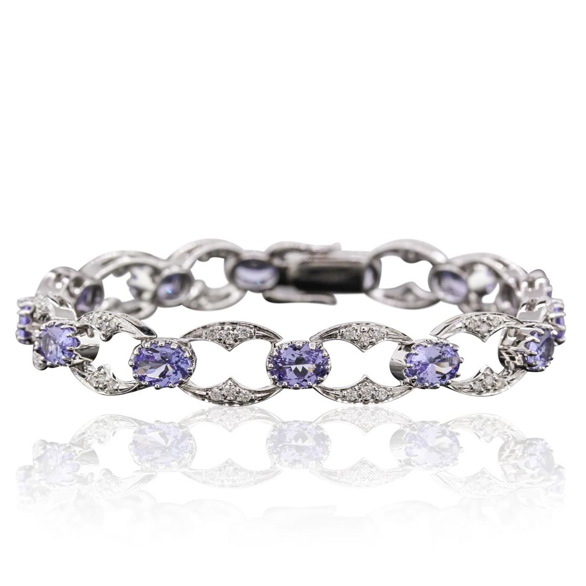 One electronically tested 14KT white gold ladies cast & assembled tanzanite and diamond bracelet with a bright polish finish. Condition is new, good workmanship. Seven and one-half inch length bracelet features a ribbon of tanzanite framed by mirroring ribbons of diamonds terminating in a concealed box clasp with twin safeties. Identified with markings of "14K". Containing: Thirteen prong set oval mixed cut natural tanzanites, measuring 7.00 x 5.00 x 3.25mm, 6%. bulge factor, approximate. Total Weight of 10.79ct., clarity is eye clean, type I, medium, very slightly grayish, violet color, (GIA V 5/3), cut is good. Transmitting light with a minimum of distortion, transparent. Measurements & the color grade are an average for the group. Graded in the setting. Tanzanite is a very rare gemstone that is only found in the country of Tanzania. Originally discovered in 1967. Tiffany & Company, named the stone Tanzanite. It is found in the Usumburu Mountains that border the Umba Valley of northern Tanzania. Tanzanite occurs in gray, brown, violet, blue, reddish-purple, & green. The gem is interesting because of its exceptional pleochroism. Rotated in different directions a tanzanite will exhibit multiple changes of color. Tanzanite has a low tolerance to ultrasonic cleaning, and should not be cleaned using this method. Seventy-Two bead set round brilliant cut diamonds, measuring 1.40 - 1.30 x 0.81mm (depth est.) approximate. Total Weight of 72 Stones = 0.74ct. Graded in the setting. Clarity: SI-2 to I-2. Color: F - H. Total Weight of Colored Stones 10.79ct. Total Weight of Diamonds 0.74ct. Total Weight of Bracelet 19.10 grams. AIG Appraised at $11,020.00.