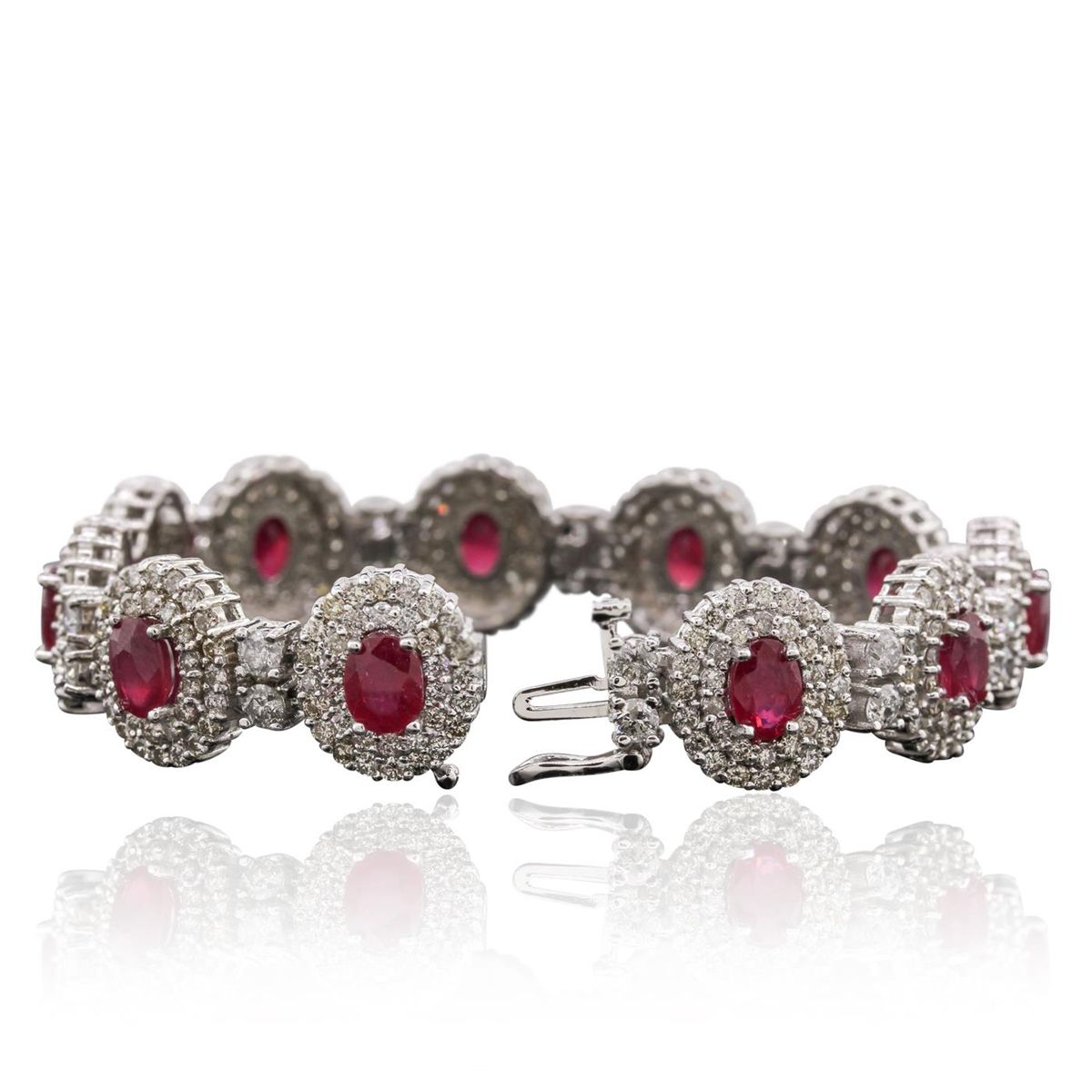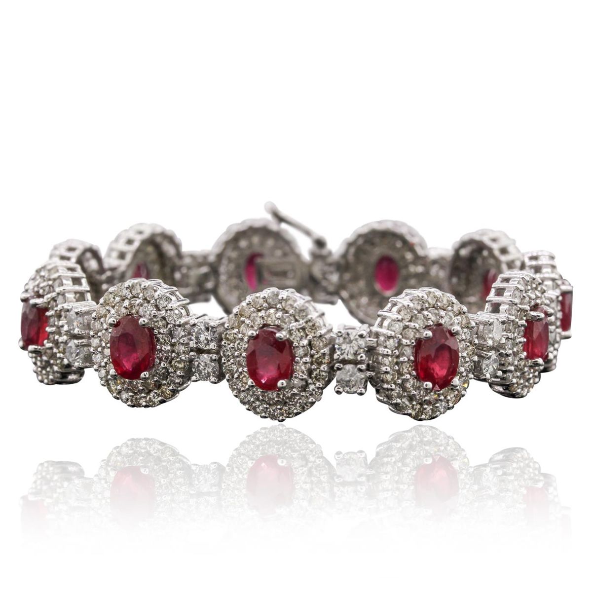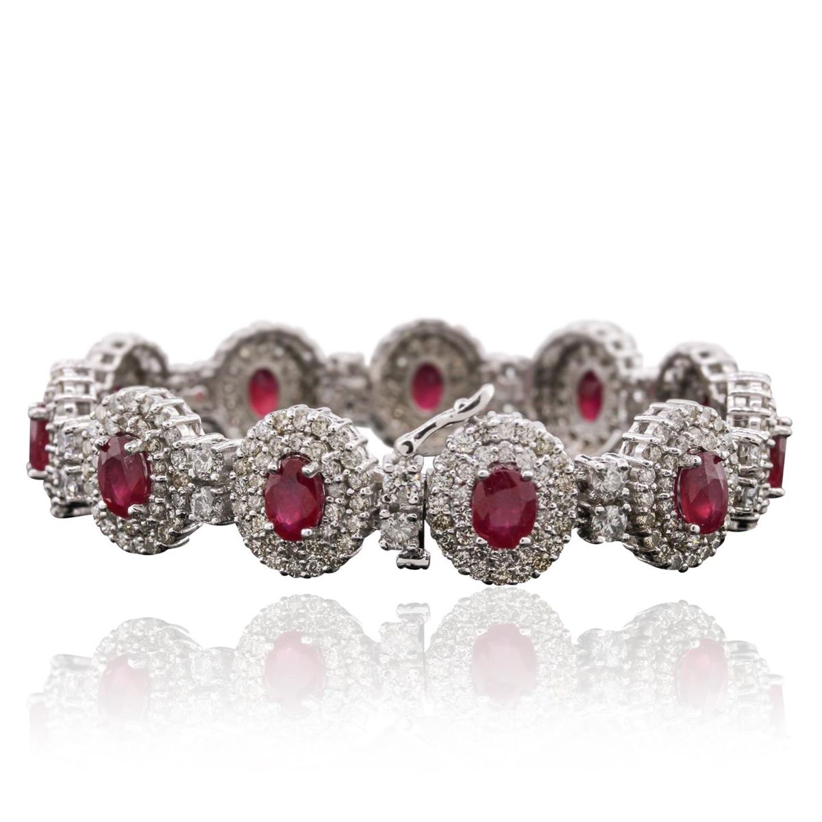 One electronically tested 14KT white gold ladies cast & assembled ruby and diamond bracelet with a bright polish finish. Condition is new, good workmanship. Seven inch length bracelet features a ribbon of ruby and diamond bezels, alternated by diamond duos, terminating in a concealed clasp with safety clasp. Identified with markings of "14K". Containing: Eleven prong set oval mixed cut natural rubies, measuring 7.00 x 5.00 x 3.25mm, 6%. bulge factor, approximate. Total Weight of 10.89ct., clarity is heavily included, type II, medium dark, moderately strong, slightly purplish red color, (GIA slpR 6/4), cut is good. Transmitting light somewhat diffusely, transparent to translucent. Naturally occurring internal & external characteristics are present. Indications of laboratory high temperature heat treatment, with glass & flux additives. Measurements & the color grade are an average for the group. Graded in the setting. Ruby has a low tolerance to rhodium plating, repolishing the surface, & ultrasonic cleaning. Twenty-Two prong set round brilliant cut diamonds, measuring 3.20 - 3.10 x 1.89mm (depth est.) approximate. Total Weight of 22 Stones = 2.61ct. Graded in the setting. Clarity: I-1 to I-3. Color: G - I Three Hundred Seventy-Four prong set round brilliant cut diamonds, measuring 1.80 - 1.60 x 1.02mm (depth est.) approximate. Total Weight of 374 Stones = 6.79ct. Graded in the setting. Clarity: SI-2 to I-2. Color: K - M. Total Weight of Colored Stones 10.89ct. Total Weight of Diamonds 9.40ct. Total Weight of Bracelet 38.10 grams. AIG Appraised at $25,300.00.