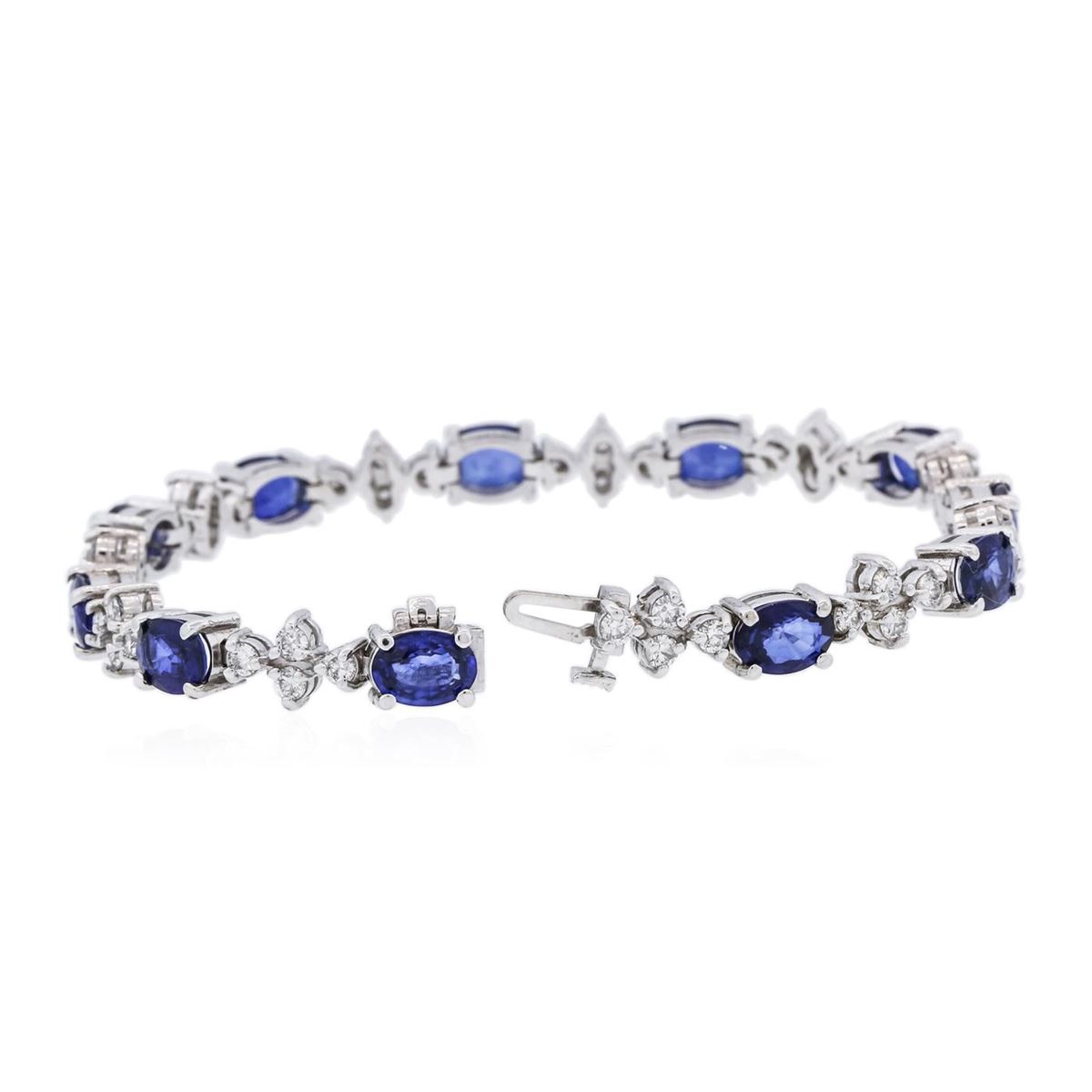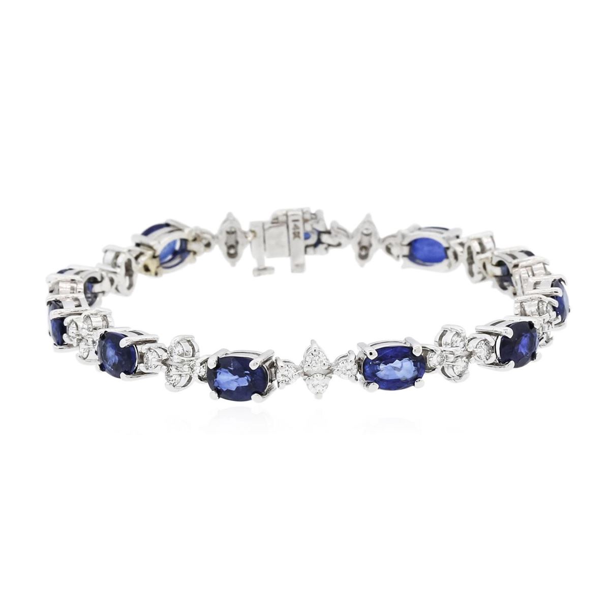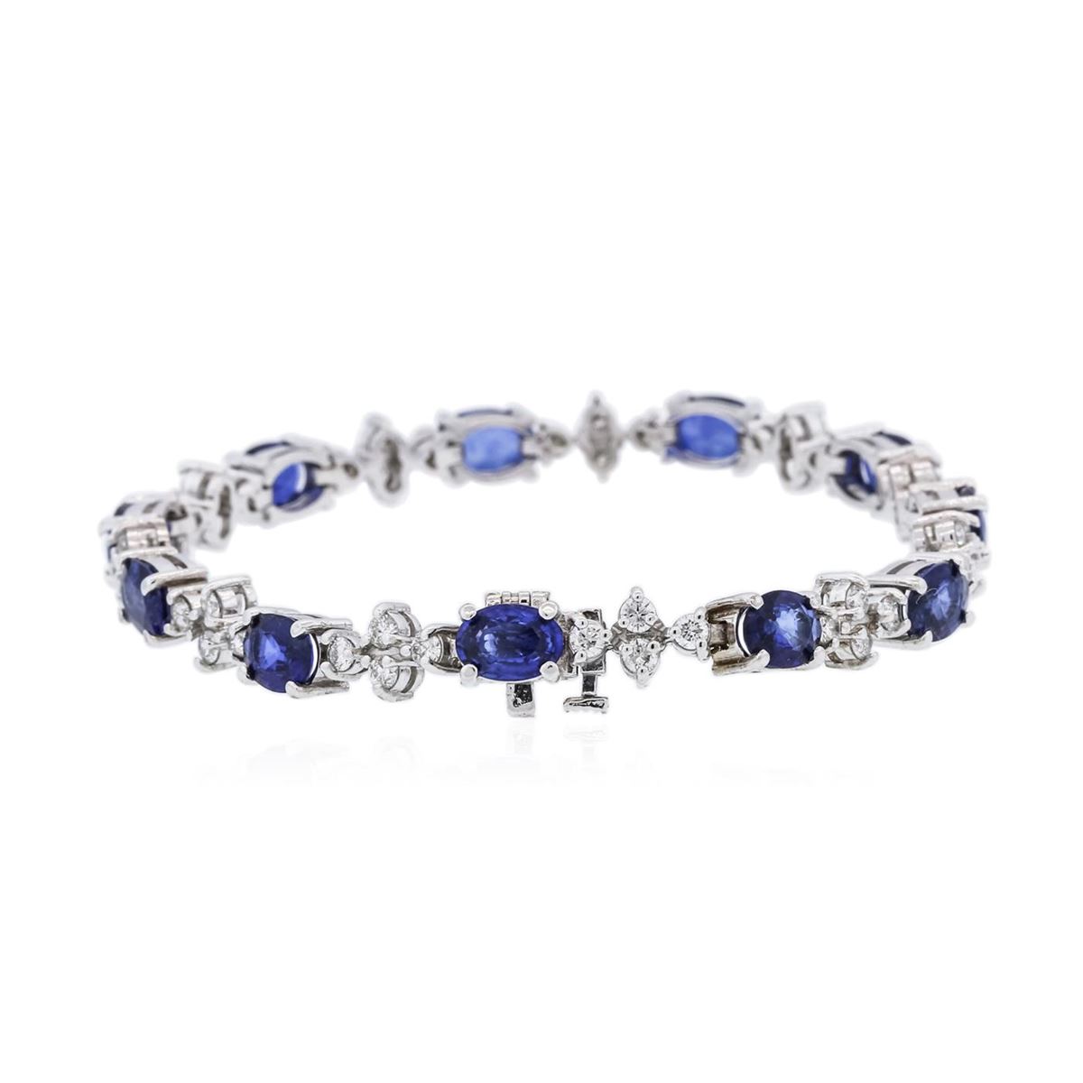 One electronically tested 14KT white gold ladies combination cast & assembled sapphire and diamond bracelet with a hidden box clasp with a bright polish finish. Measurements: 7" in length. Identified with markings of "14K". Condition is new. Containing: Eleven prong set oval modified brilliant cut natural blue sapphires, measuring 7.00 x 5.15 x 3.34mm, approximate total weight of 10.89ct., clarity is eye clean, type II, medium, moderately strong, blue color, (GIA B 5/4), cut is good. One Hundred prong set round brilliant cut diamonds, measuring 1.50 - 1.50 x 0.90mm (depth est.) approximate total weight of 100 Stones = 1.23ct. Clarity: SI-2 to I-2. Color: I - J, Cut is Good. Colored gemstones are presumed to have been subjected to commonly used enhancement processes. All diamonds and colored gemstones are graded in the mounting, unless otherwise stated. Total Weight of Colored Stones 10.89ct. Total Weight of Diamonds 1.23ct. Total Weight of Bracelet 16.40 grams. GGL Appraised at $13,285.00.