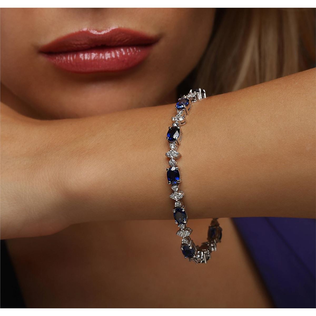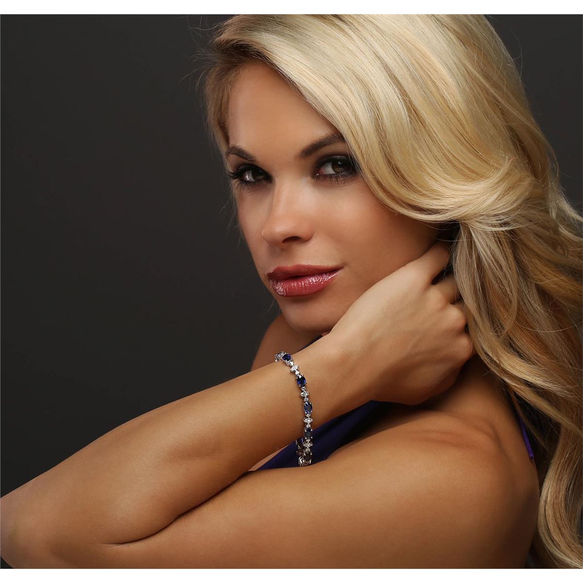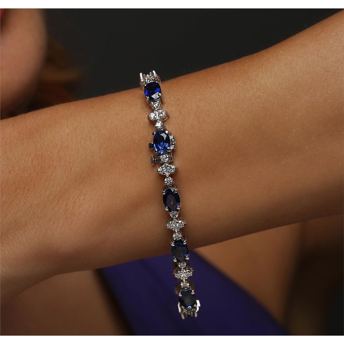 One electronically tested 14KT white gold ladies combination cast & assembled sapphire and diamond bracelet with a hidden box clasp with a bright polish finish. Measurements: 7" in length. Identified with markings of "14K". Condition is new. Containing: Eleven prong set oval modified brilliant cut natural blue sapphires, measuring 7.00 x 5.15 x 3.34mm, approximate total weight of 10.89ct., clarity is eye clean, type II, medium, moderately strong, blue color, (GIA B 5/4), cut is good. One Hundred prong set round brilliant cut diamonds, measuring 1.50 - 1.50 x 0.90mm (depth est.) approximate total weight of 100 Stones = 1.23ct. Clarity: SI-2 to I-2. Color: I - J, Cut is Good. Colored gemstones are presumed to have been subjected to commonly used enhancement processes. All diamonds and colored gemstones are graded in the mounting, unless otherwise stated. Total Weight of Colored Stones 10.89ct. Total Weight of Diamonds 1.23ct. Total Weight of Bracelet 16.40 grams. GGL Appraised at $13,285.00.