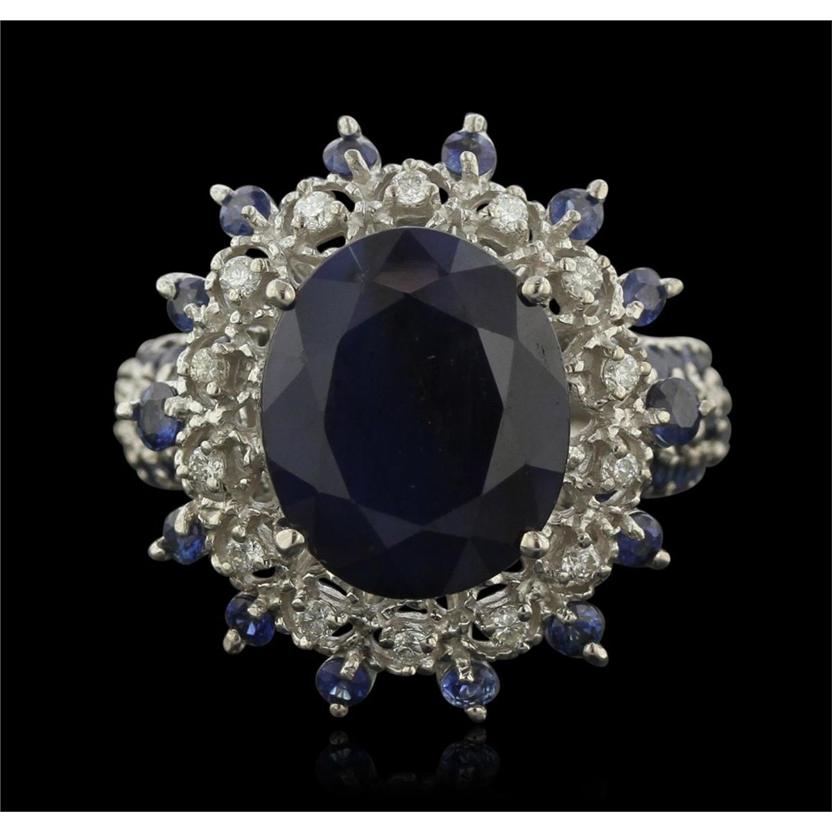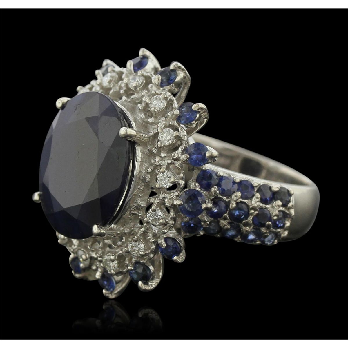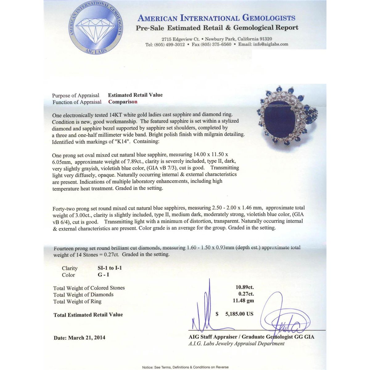 One electronically tested 14KT white gold ladies cast sapphire and diamond ring. Condition is new, good workmanship. The featured sapphire is set within a stylized diamond and sapphire bezel supported by sapphire set shoulders, completed by a three and one-half millimeter wide band. Bright polish finish with milgrain detailing. Identified with markings of "K14". Containing: One prong set oval mixed cut natural blue sapphire, measuring 14.00 x 11.50 x 6.05mm, approximate weight of 7.89ct., clarity is severely included, type II, dark, very slightly grayish, violetish blue color, (GIA vB 7/3), cut is good. Transmitting light very diffusely, opaque. Naturally occurring internal & external characteristics are present. Indications of multiple laboratory enhancements, including high temperature heat treatment. Graded in the setting. Forty-two prong set round mixed cut natural blue sapphires, measuring 2.50 - 2.00 x 1.46mm, approximate total weight of 3.00ct., clarity is slightly included, type II, medium dark, moderately strong, violetish blue color, (GIA vB 6/4), cut is good. Transmitting light with a minimum of distortion, transparent. Naturally occurring internal & external characteristics are present. Color grade is an average for the group. Graded in the setting. Fourteen prong set round brilliant cut diamonds, measuring 1.60 - 1.50 x 0.93mm (depth est.) approximate total weight of 14 stones = 0.27ct. Graded in setting. Clarity SI-1 to I-1. Color G-1. Total weight of colored stones 10.89ct., Total weight of diamonds 0.27ct., total weight of ring 11.48 grams. AIG Appraised at $5,185.00.