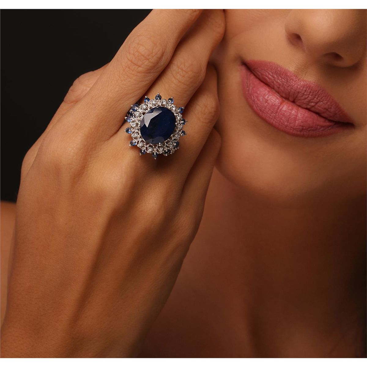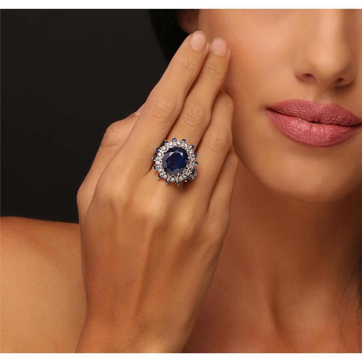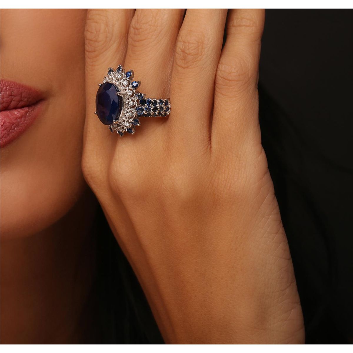 One electronically tested 14KT white gold ladies cast sapphire and diamond ring. Condition is new, good workmanship. The featured sapphire is set within a stylized diamond and sapphire bezel supported by sapphire set shoulders, completed by a three and one-half millimeter wide band. Bright polish finish with milgrain detailing. Identified with markings of "K14". Containing: One prong set oval mixed cut natural blue sapphire, measuring 14.00 x 11.50 x 6.05mm, approximate weight of 7.89ct., clarity is severely included, type II, dark, very slightly grayish, violetish blue color, (GIA vB 7/3), cut is good. Transmitting light very diffusely, opaque. Naturally occurring internal & external characteristics are present. Indications of multiple laboratory enhancements, including high temperature heat treatment. Graded in the setting. Forty-two prong set round mixed cut natural blue sapphires, measuring 2.50 - 2.00 x 1.46mm, approximate total weight of 3.00ct., clarity is slightly included, type II, medium dark, moderately strong, violetish blue color, (GIA vB 6/4), cut is good. Transmitting light with a minimum of distortion, transparent. Naturally occurring internal & external characteristics are present. Color grade is an average for the group. Graded in the setting. Fourteen prong set round brilliant cut diamonds, measuring 1.60 - 1.50 x 0.93mm (depth est.) approximate total weight of 14 stones = 0.27ct. Graded in setting. Clarity SI-1 to I-1. Color G-1. Total weight of colored stones 10.89ct., Total weight of diamonds 0.27ct., total weight of ring 11.48 grams. AIG Appraised at $5,185.00.