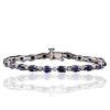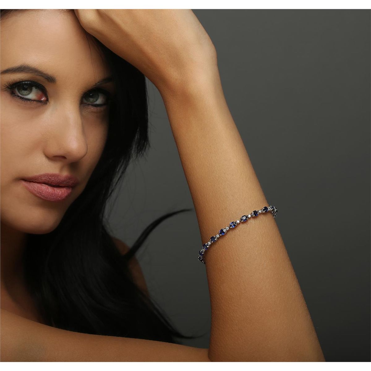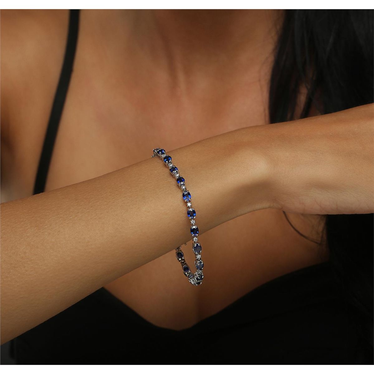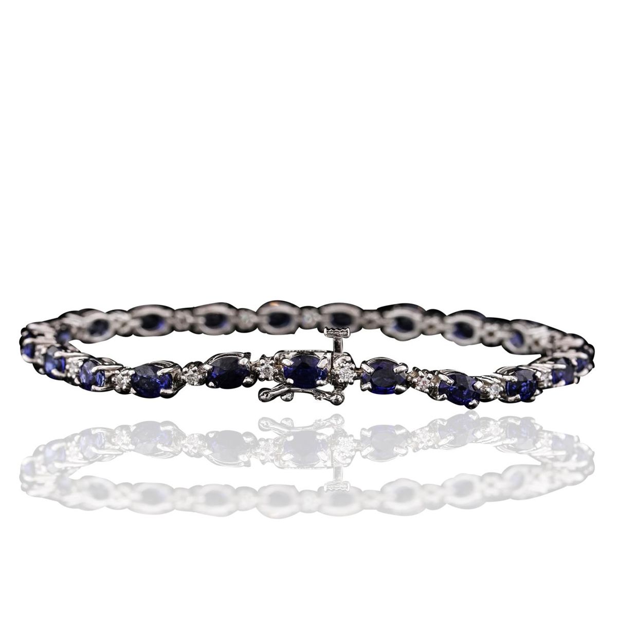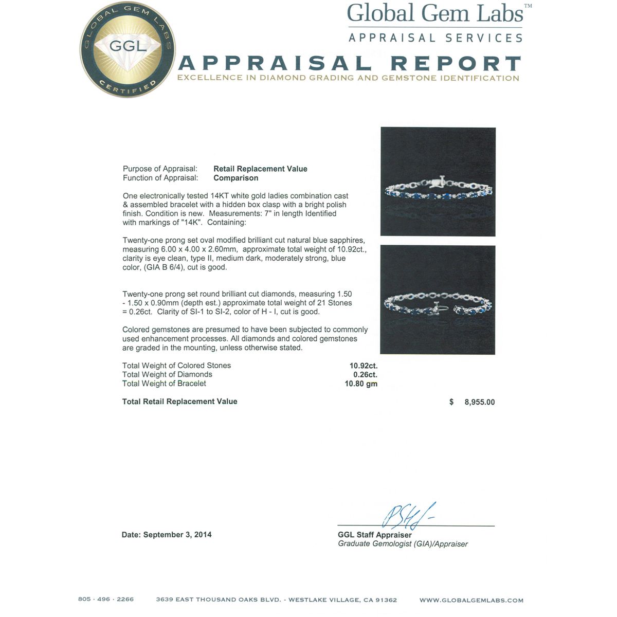 One electronically tested 14KT white gold ladies combination cast & assembled bracelet with a hidden box clasp with a bright polish finish. Measurements: 7" in length Identified with markings of "14K". Condition is new. Containing: Twenty-one prong set oval modified brilliant cut natural blue sapphires, measuring 6.00 x 4.00 x 2.60mm, approximate total weight of 10.92ct., clarity is eye clean, type II, medium dark, moderately strong, blue color, (GIA B 6/4), cut is good. Twenty-One prong set round brilliant cut diamonds, measuring 1.50 - 1.50 x 0.90mm (depth est.) approximate total weight of 21 Stones = 0.26ct. Clarity: SI-1 to SI-2. Color: H - I, Cut is Good. Colored gemstones are presumed to have been subjected to commonly used enhancement processes. All diamonds and colored gemstones are graded in the mounting, unless otherwise stated. Total Weight of Colored Stones 10.92ct. Total Weight of Diamonds 0.26ct. Total Weight of Bracelet 10.80 grams. GGL Appraised at $8,955.00.