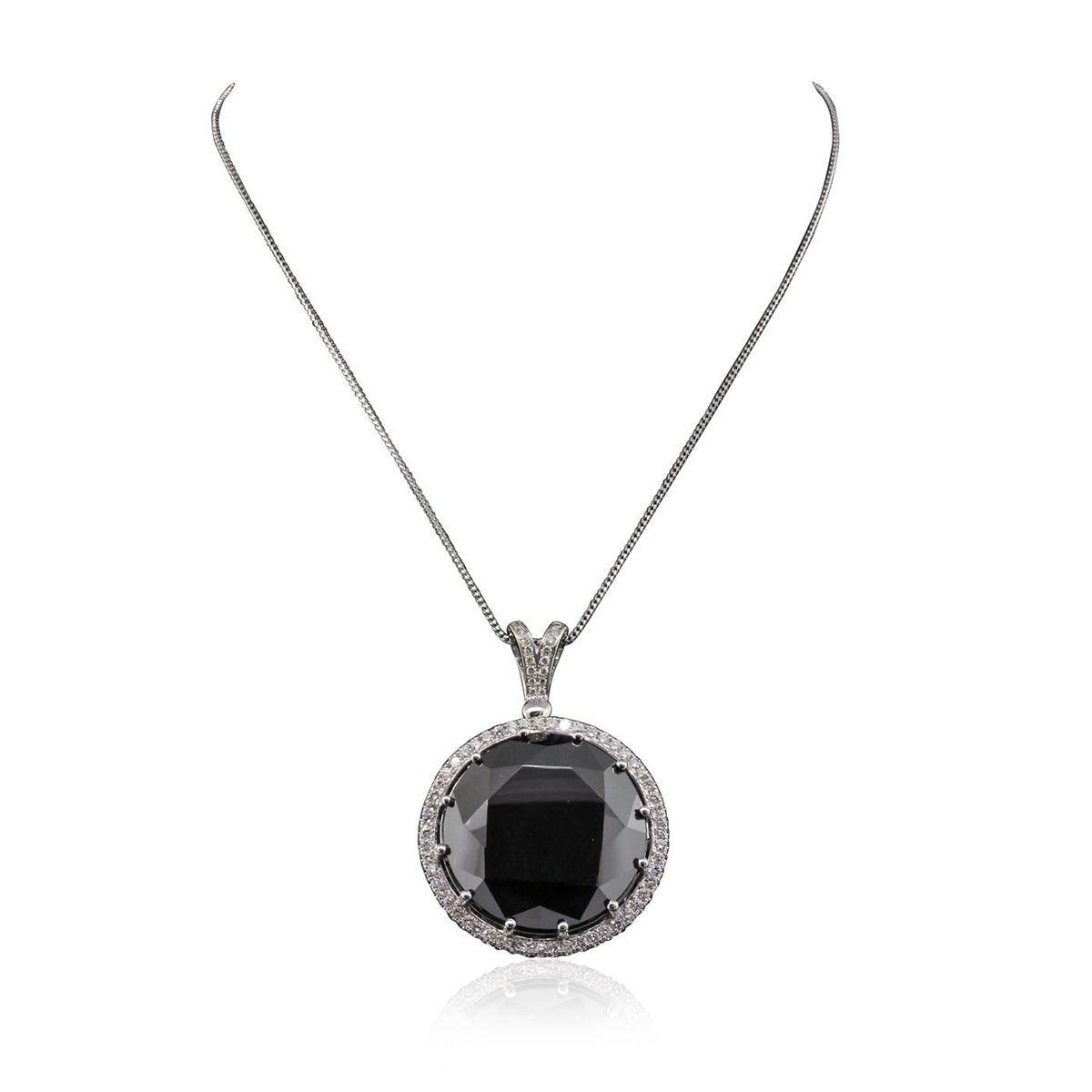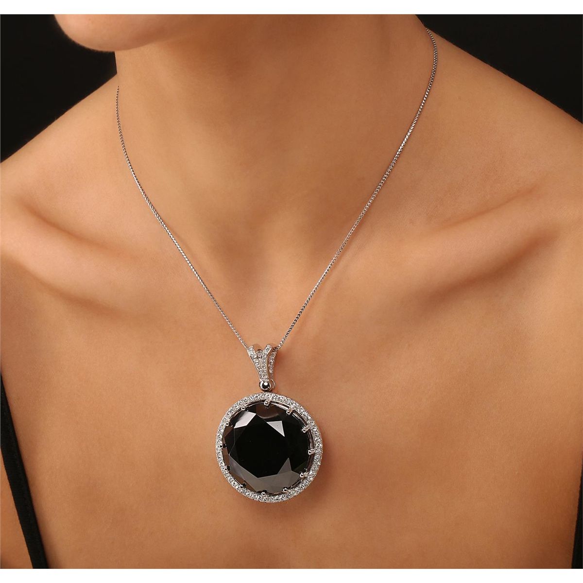 One electronically tested 14KT white gold ladies cast & assembled black and white diamond pendant. Condition is new, good workmanship. The pendant features a black diamond set within a white diamond bezel, completed by a diamond set split bail. The pendant is supported by a sixteen inch length 1.00mm wide designer style chain, terminating in a lobster claw clasp. Bright polish finish. Area measurements 2.25 x 1.50 inch. Identified with markings of "14K". Containing: One prong set round brilliant cut diamond, measuring 32.40 - 32.10 x 14.75mm (depth est.), 8.00.%. GTCF approximate weight of 101.06ct. Indications of multiple laboratory enhancements. The specific gravity of black diamond is 3.120 to 3.165. Diamond tester results are non reactive. Graded in the setting. Clarity Déclassé‚. Color: Fancy Black; Irradiated. Depth: 45.7%. Table: 62.0%. Fifty-Five prong set round brilliant cut diamonds, measuring 2.10 - 2.00 x 1.23mm (depth est.) approximate. Total Weight of 55 Stones = 1.83ct. Graded in the setting. Clarity: VS-2 to SI-2. Color: G - I Sixteen prong set round brilliant cut diamonds, measuring 1.60 - 1.50 x 0.93mm (depth est.) approximate. Total Weight of 16 Stones = 0.30ct. Graded in the setting. Clarity: VS-1 to SI-1. Color: G - I. Total Weight of Diamonds103.19ct. Total Weight of Pendant 49.49 grams. AIG Appraised at $26,730.00.