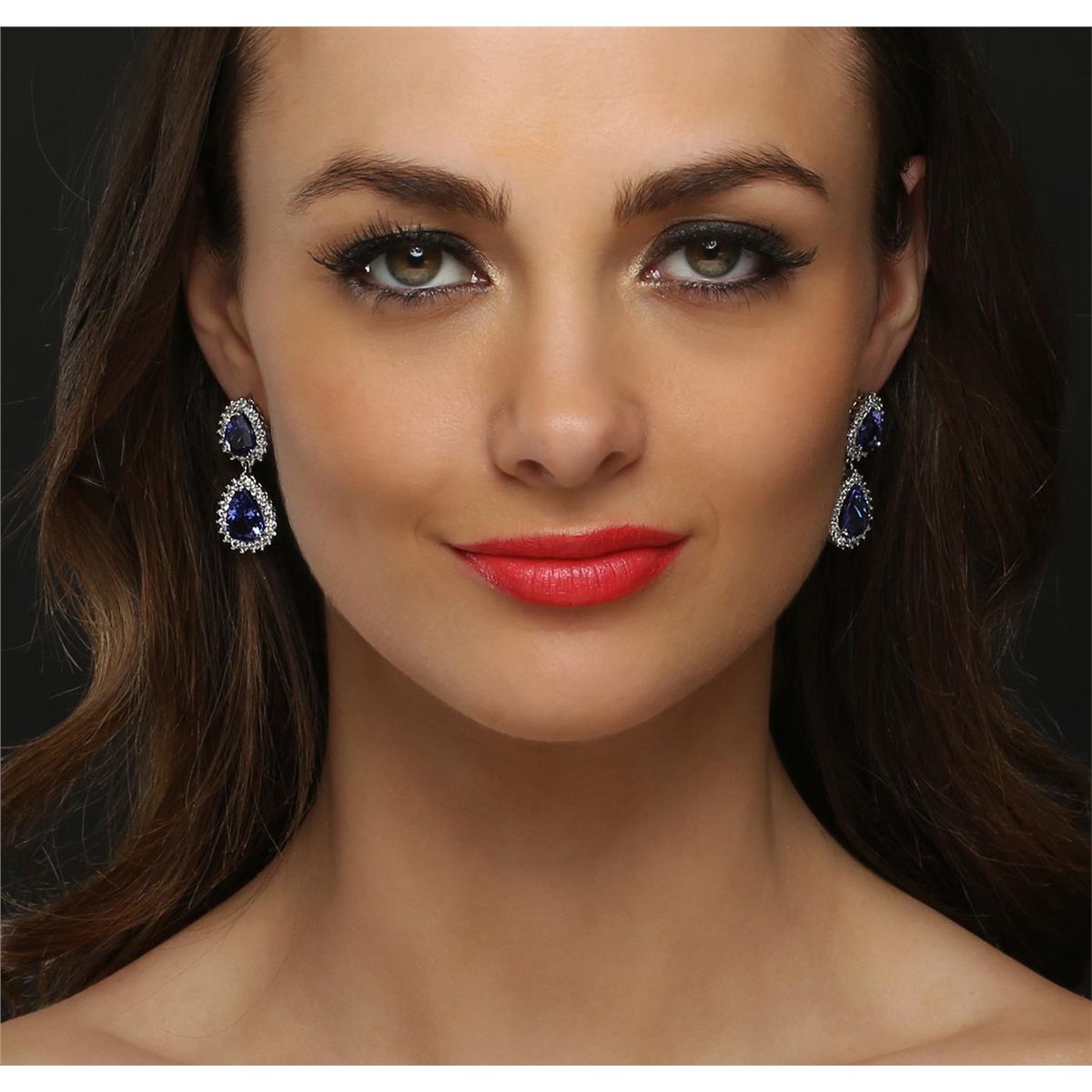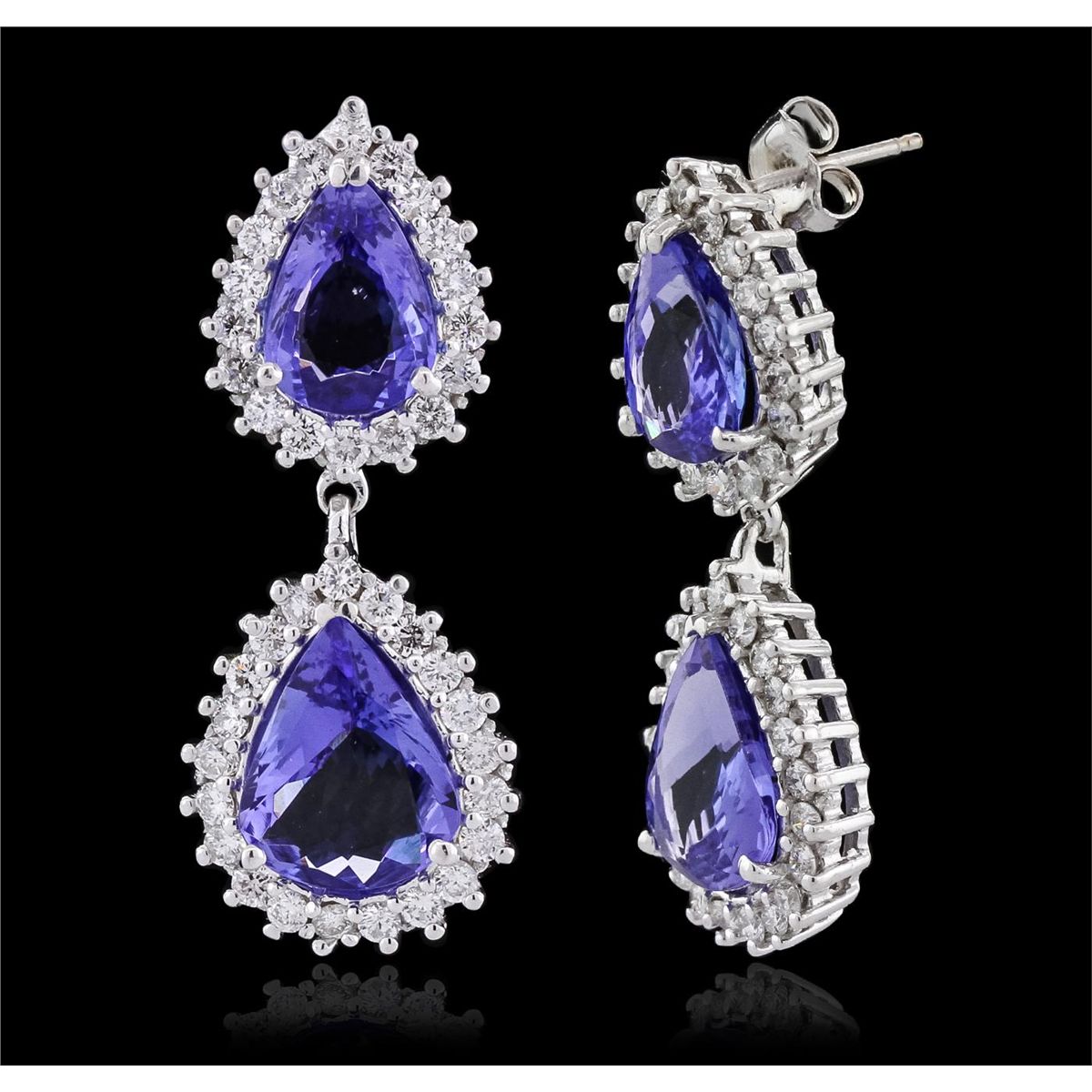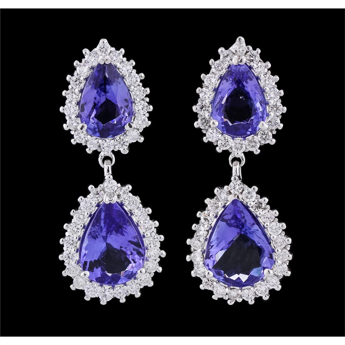 One pair electronically tested 14KT white gold ladies combination cast & assembled dangle earrings with friction posts with a bright polish finish. Identified with markings of "14K". Condition is new. Containing: Two prong set pear modified brilliant cut natural tanzanites, measuring 11.01 x 9.47 x 4.60mm, approximate total weight of 6.42ct., clarity is eye clean, type I, medium light, moderately strong, bluish violet color, (GIA bV 4/4), cut is good. Two prong set pear modified brilliant cut natural tanzanites, measuring 10.00 x 7.28 x 4.70mm, approximate total weight of 4.58ct., clarity is eye clean, type I, medium light, moderately strong, bluish violet color, (GIA bV 4/4), cut is good. Seventy-Eight prong set round brilliant cut diamonds, measuring 2.00 - 1.90 x 1.17mm (depth est.) approximate total weight of 78 Stones = 2.11ct. Clarity: SI-2 to I-1. Color: H - J, Cut is Good. Colored gemstones are presumed to have been subjected to commonly used enhancement processes. All diamonds and colored gemstones are graded in the mounting, unless otherwise stated. Total Weight of Colored Stones 11.00ct. Total Weight of Diamonds 2.11ct. Total Weight of Earrings 12.20 grams. GGL Appraised at $23,145.00.