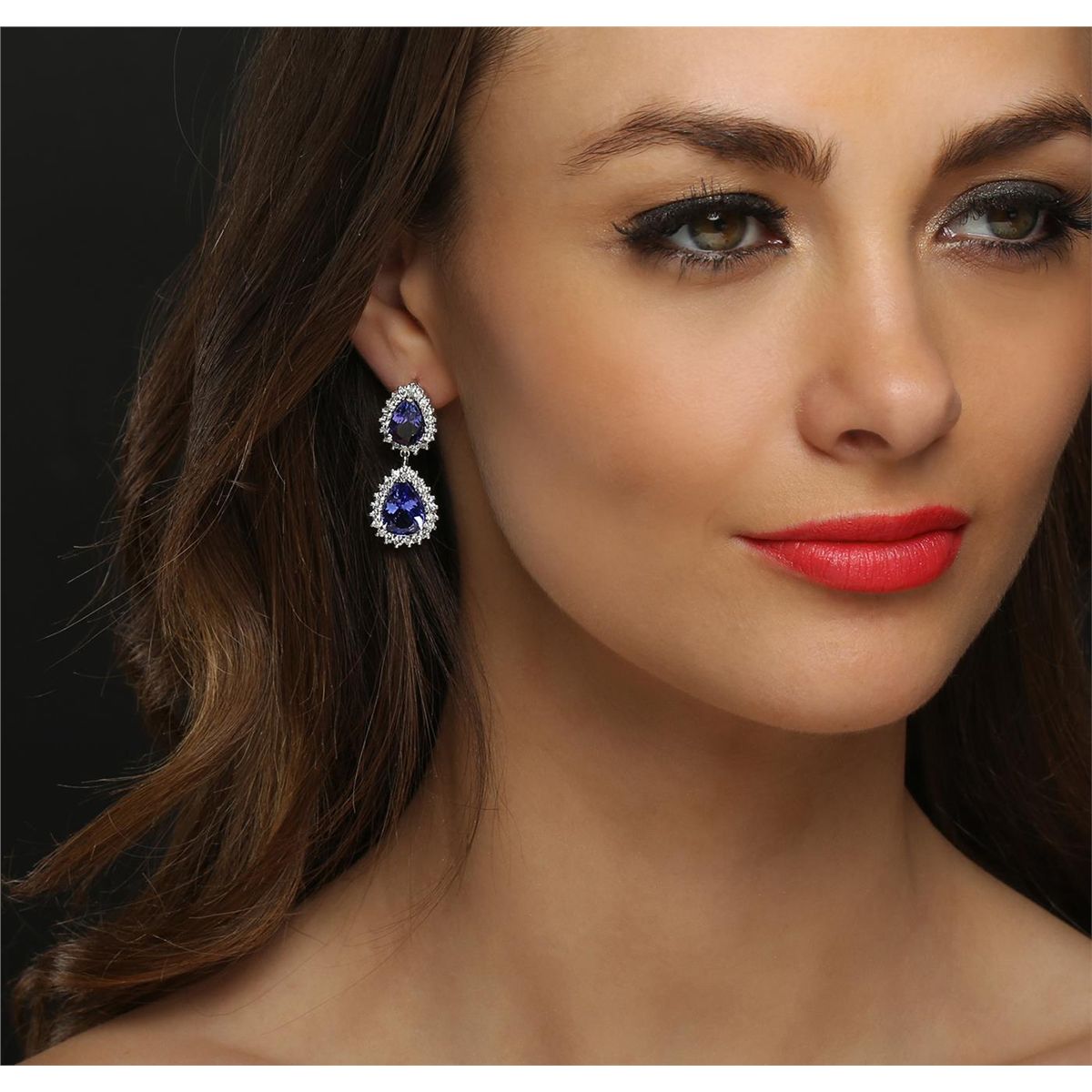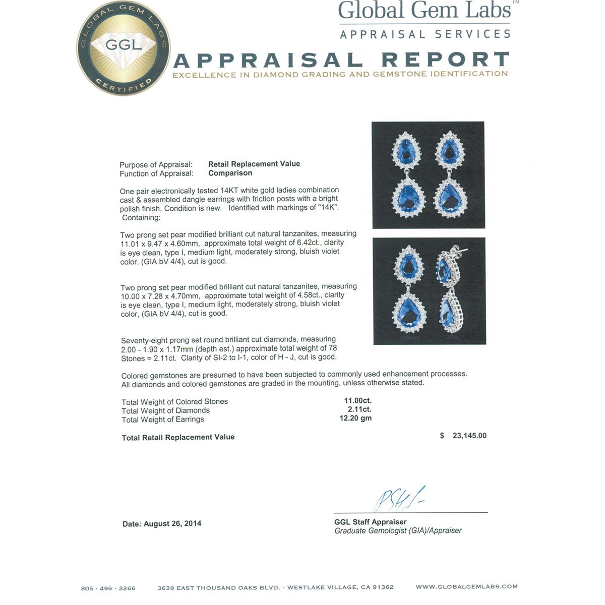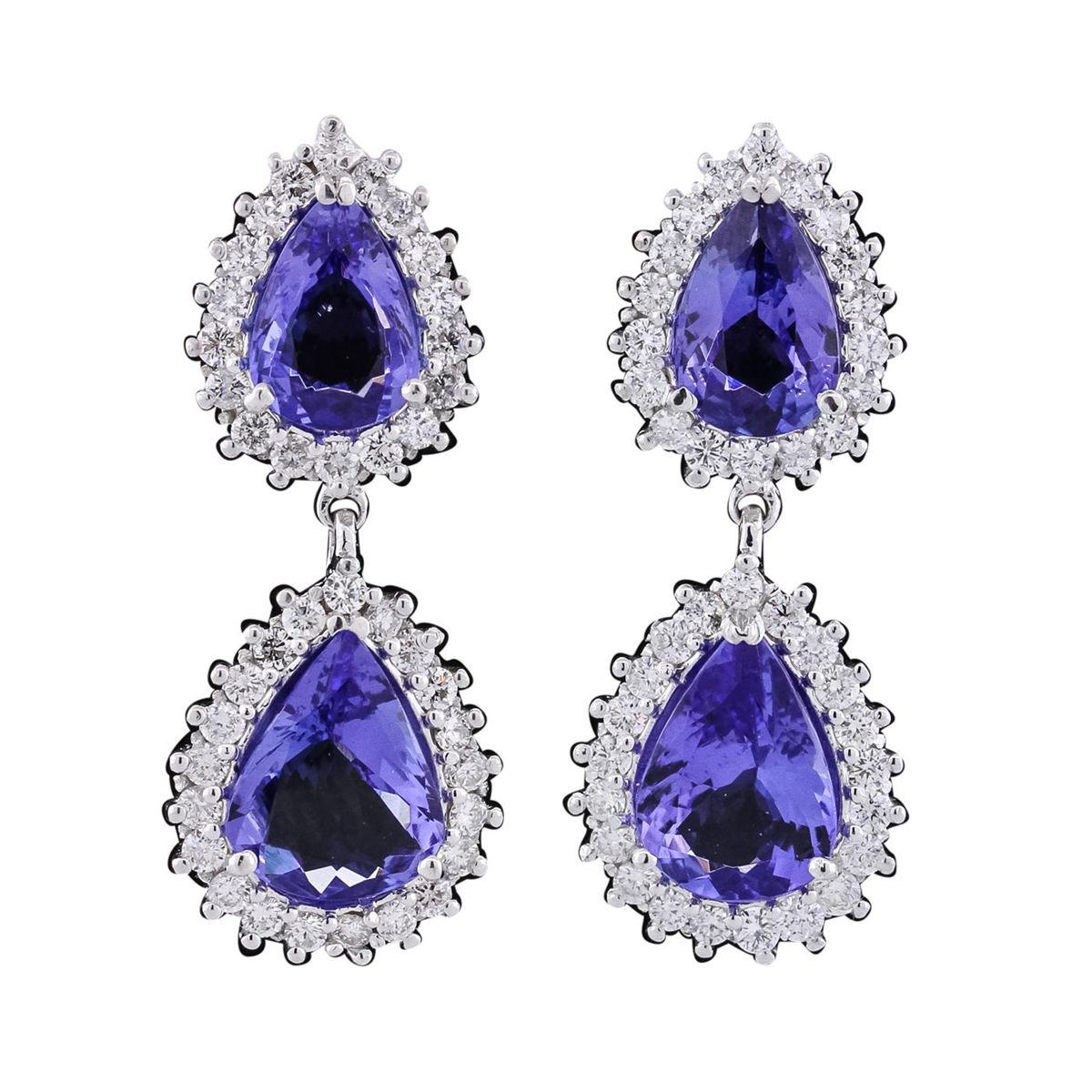 One pair electronically tested 14KT white gold ladies combination cast & assembled dangle earrings with friction posts with a bright polish finish. Identified with markings of "14K". Condition is new. Containing: Two prong set pear modified brilliant cut natural tanzanites, measuring 11.01 x 9.47 x 4.60mm, approximate total weight of 6.42ct., clarity is eye clean, type I, medium light, moderately strong, bluish violet color, (GIA bV 4/4), cut is good. Two prong set pear modified brilliant cut natural tanzanites, measuring 10.00 x 7.28 x 4.70mm, approximate total weight of 4.58ct., clarity is eye clean, type I, medium light, moderately strong, bluish violet color, (GIA bV 4/4), cut is good. Seventy-Eight prong set round brilliant cut diamonds, measuring 2.00 - 1.90 x 1.17mm (depth est.) approximate total weight of 78 Stones = 2.11ct. Clarity: SI-2 to I-1. Color: H - J, Cut is Good. Colored gemstones are presumed to have been subjected to commonly used enhancement processes. All diamonds and colored gemstones are graded in the mounting, unless otherwise stated. Total Weight of Colored Stones 11.00ct. Total Weight of Diamonds 2.11ct. Total Weight of Earrings 12.20 grams. GGL Appraised at $23,145.00.
