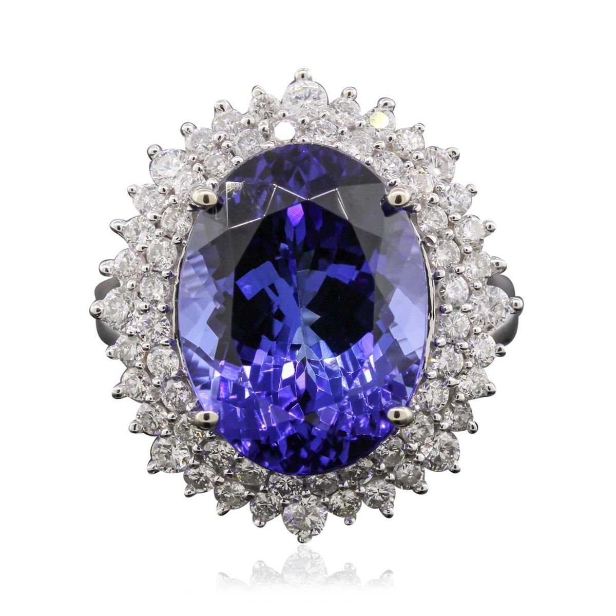 One electronically tested 14KT white gold Ladies combination cast & assembled fancy ring with a high polish finish. Condition is new. Identified with markings of "14K". Containing: Fifty-Seven prong set round brilliant cut diamonds, measuring 1.60 - 1.60 x 0.96mm (depth est.) approximate. Total Weight of 57 Stones = 1.18ct. Clarity: I-1 to I-2. Color: H - J, Cut is Good. One prong set oval modified brilliant cut natural tanzanite, measuring 15.76 x 11.77 x 8.62mm, approximate weight of 11.01ct., clarity is eye clean, type I, medium, moderately strong, violetish blue color, (GIA vB 5/4), cut is very good. GIA Report: 2151964581.Total Weight of Colored Stones 11.01ct. Total Weight of Diamonds 1.18ct. Total Weight of Ring 7.00 grams. GGL Appraised at $16,595.00.
