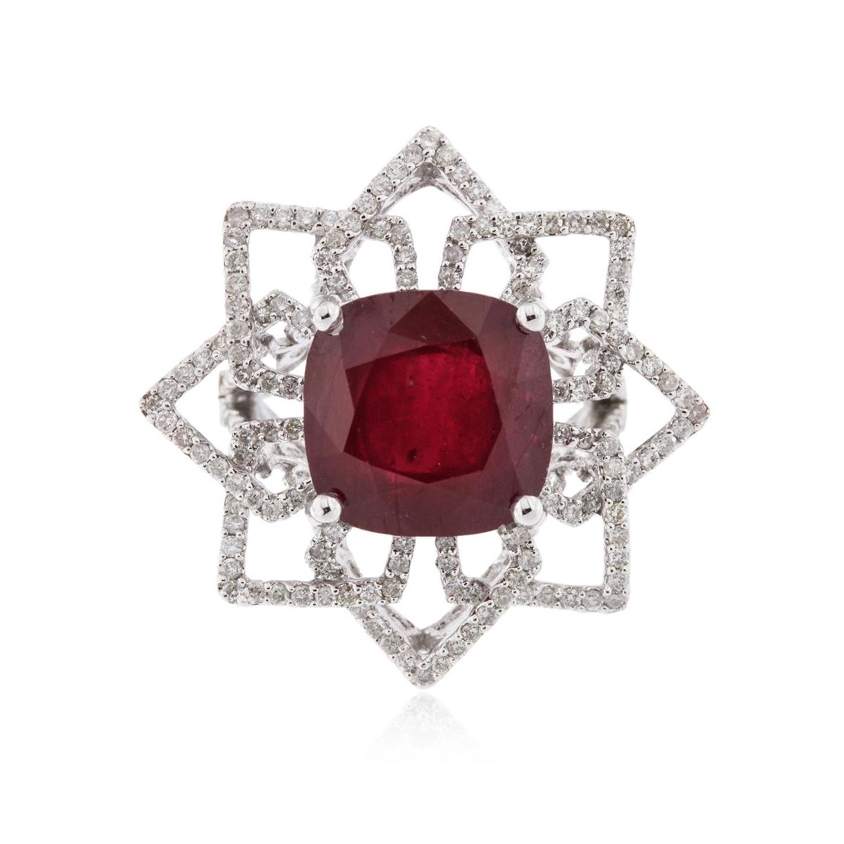One electronically tested 14KT white gold Ladies combination cast & assembled cocktail ring with a bright polish finish. Identified with markings of "14K". Condition is excellent. Containing: One prong set square cushion modified brilliant cut natural ruby, measuring 12.10 x 12.10 x 7.40mm, approximate weight of 11.02ct., clarity is heavily included, type II, cut is good. Indications of heat treatment with glass and flux residue. Colored gemstones are presumed to have been subjected to commonly used and possible undetectable color/clarity enhancement processes. One Hundred Sixty prong set round brilliant cut diamonds, measuring 1.10 - 1.10 x 0.66mm (depth est.) approximate total weight of 160 Stones = 0.87ct. Clarity of I-1 to I-3, Color of H - I. Total Weight of Colored Stones 11.02ct. Total Weight of Diamonds 0.87ct. Total Weight of Ring 9.20gm. GGL Appraised at $8,355.00.