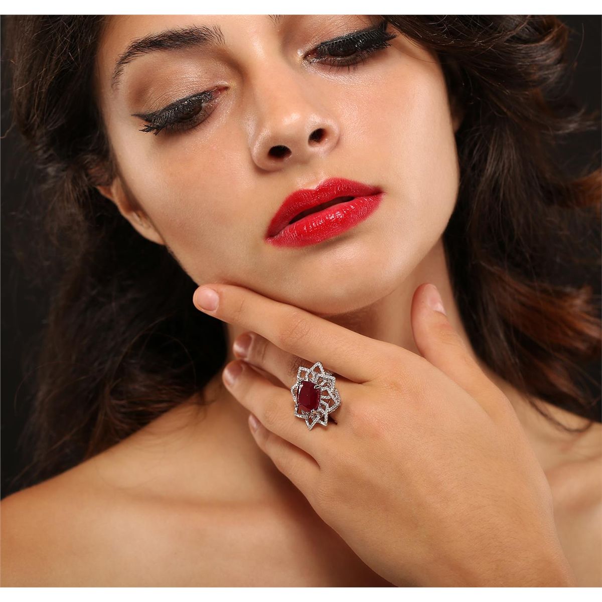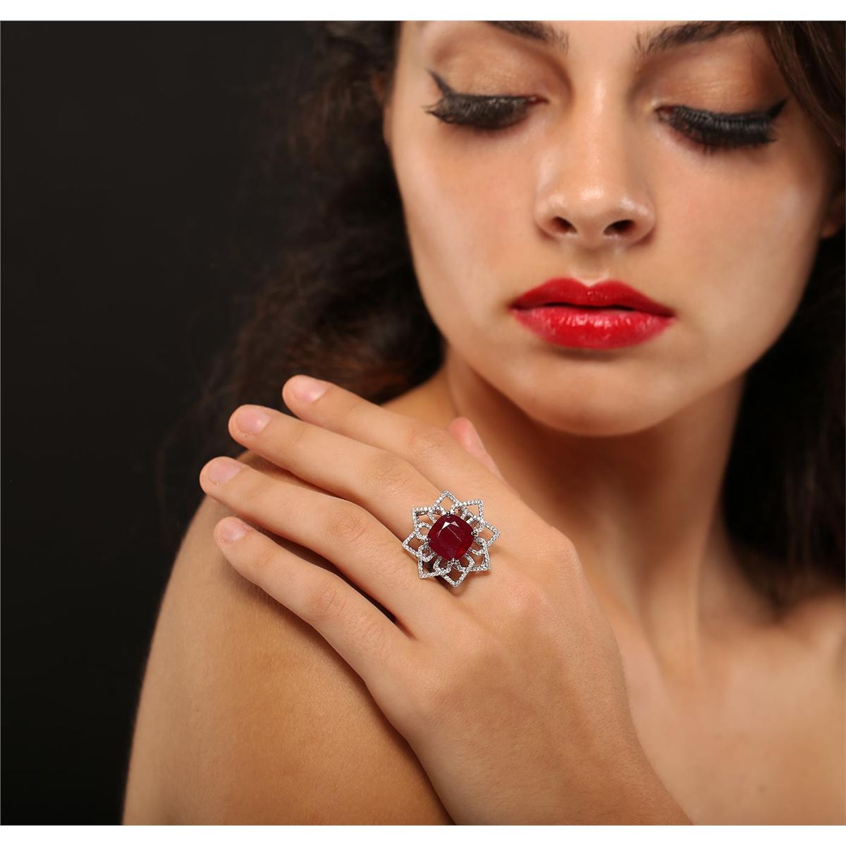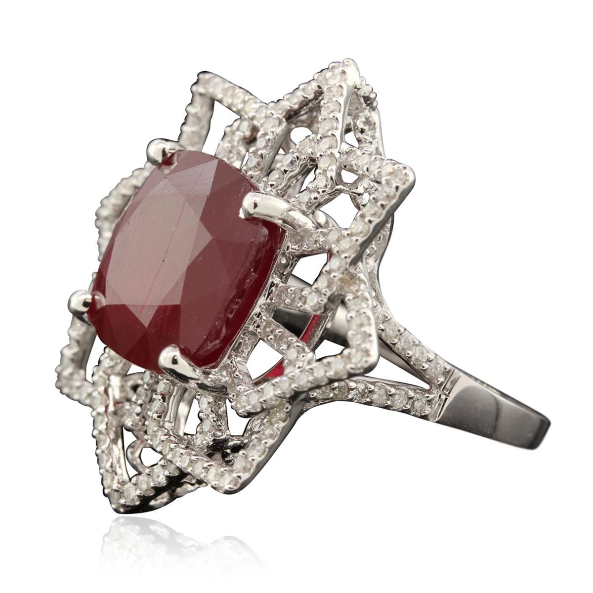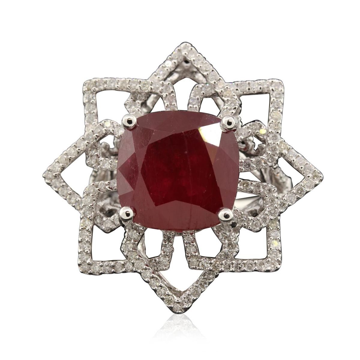 One electronically tested 14KT white gold Ladies combination cast & assembled cocktail ring with a bright polish finish. Identified with markings of "14K". Condition is excellent. Containing: One prong set square cushion modified brilliant cut natural ruby, measuring 12.10 x 12.10 x 7.40mm, approximate weight of 11.02ct., clarity is heavily included, type II, cut is good. Indications of heat treatment with glass and flux residue. Colored gemstones are presumed to have been subjected to commonly used and possible undetectable color/clarity enhancement processes. One Hundred Sixty prong set round brilliant cut diamonds, measuring 1.10 - 1.10 x 0.66mm (depth est.) approximate total weight of 160 Stones = 0.87ct. Clarity of I-1 to I-3, Color of H - I. Total Weight of Colored Stones 11.02ct. Total Weight of Diamonds 0.87ct. Total Weight of Ring 9.20gm. GGL Appraised at $8,355.00.
