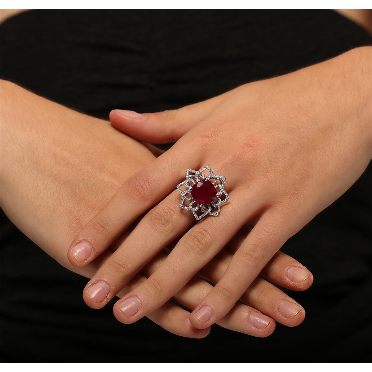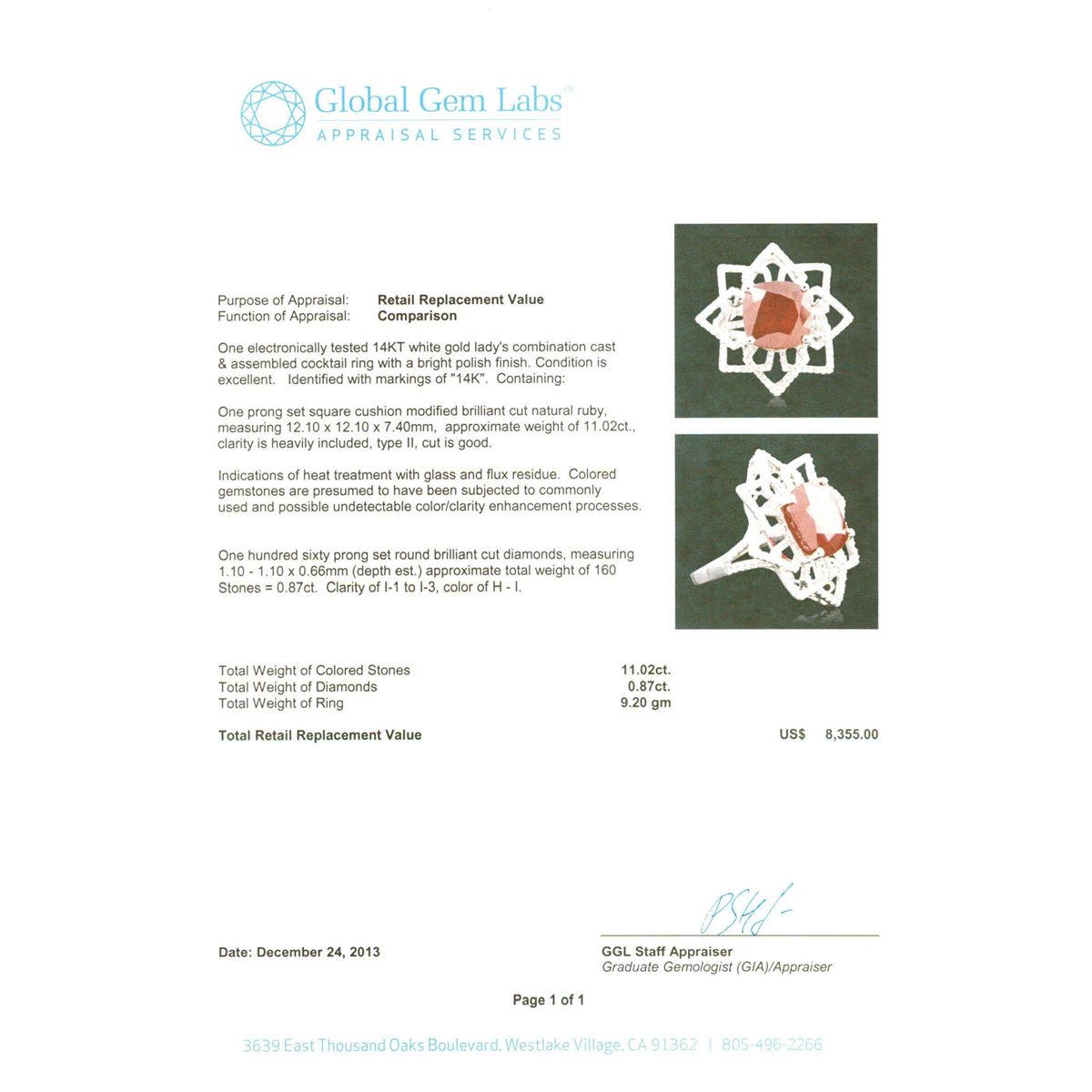 One electronically tested 14KT white gold Ladies combination cast & assembled cocktail ring with a bright polish finish. Identified with markings of "14K". Condition is excellent. Containing: One prong set square cushion modified brilliant cut natural ruby, measuring 12.10 x 12.10 x 7.40mm, approximate weight of 11.02ct., clarity is heavily included, type II, cut is good. Indications of heat treatment with glass and flux residue. Colored gemstones are presumed to have been subjected to commonly used and possible undetectable color/clarity enhancement processes. One Hundred Sixty prong set round brilliant cut diamonds, measuring 1.10 - 1.10 x 0.66mm (depth est.) approximate total weight of 160 Stones = 0.87ct. Clarity of I-1 to I-3, Color of H - I. Total Weight of Colored Stones 11.02ct. Total Weight of Diamonds 0.87ct. Total Weight of Ring 9.20gm. GGL Appraised at $8,355.00.