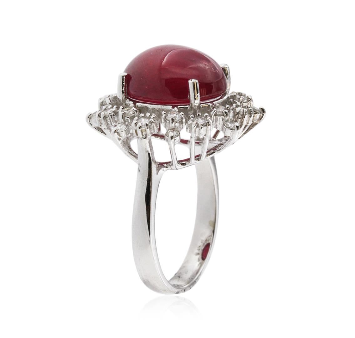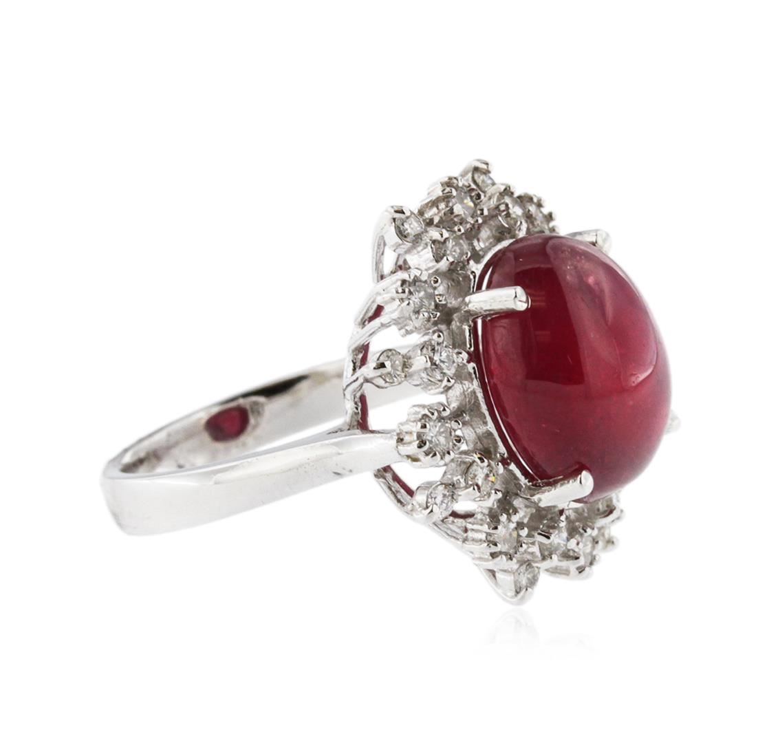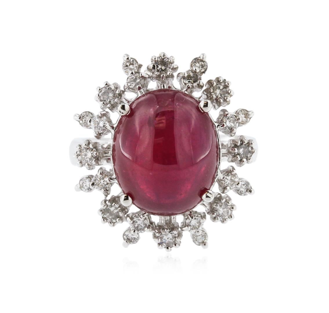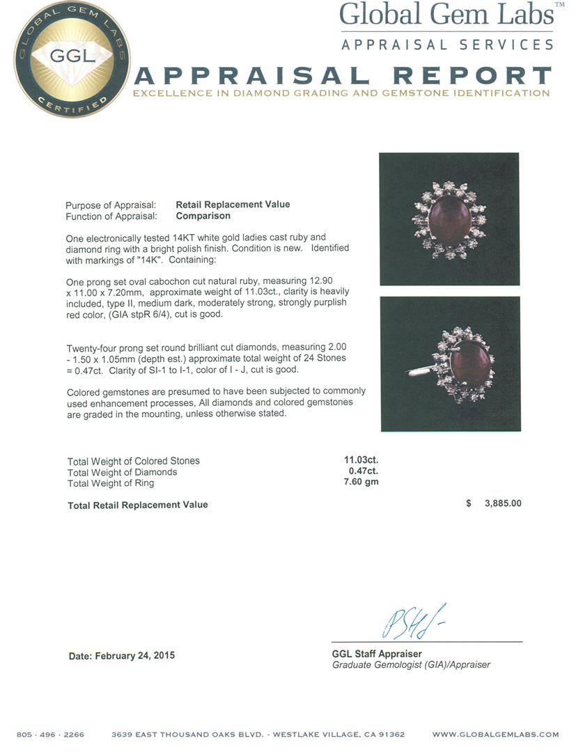 One electronically tested 14KT white gold ladies cast ruby and diamond ring with a bright polish finish. Identified with markings of "14K". Condition is new. Containing: One prong set oval cabochon cut natural ruby, measuring 12.90 x 11.00 x 7.20mm, approximate weight of 11.03ct., clarity is heavily included, type II, medium dark, moderately strong, strongly purplish red color, (GIA stpR 6/4), cut is good. Twenty-Four prong set round brilliant cut diamonds, measuring 2.00 - 1.50 x 1.05mm (depth est.) approximate total weight of 24 Stones = 0.47ct. Clarity: SI-1 to I-1. Color: I - J, Cut is Good. Colored gemstones are presumed to have been subjected to commonly used enhancement processes, All diamonds and colored gemstones are graded in the mounting, unless otherwise stated. Total Weight of Colored Stones 11.03ct. Total Weight of Diamonds 0.47ct. Total Weight of Ring 7.60 grams. GGL Appraised at $3,885.00.