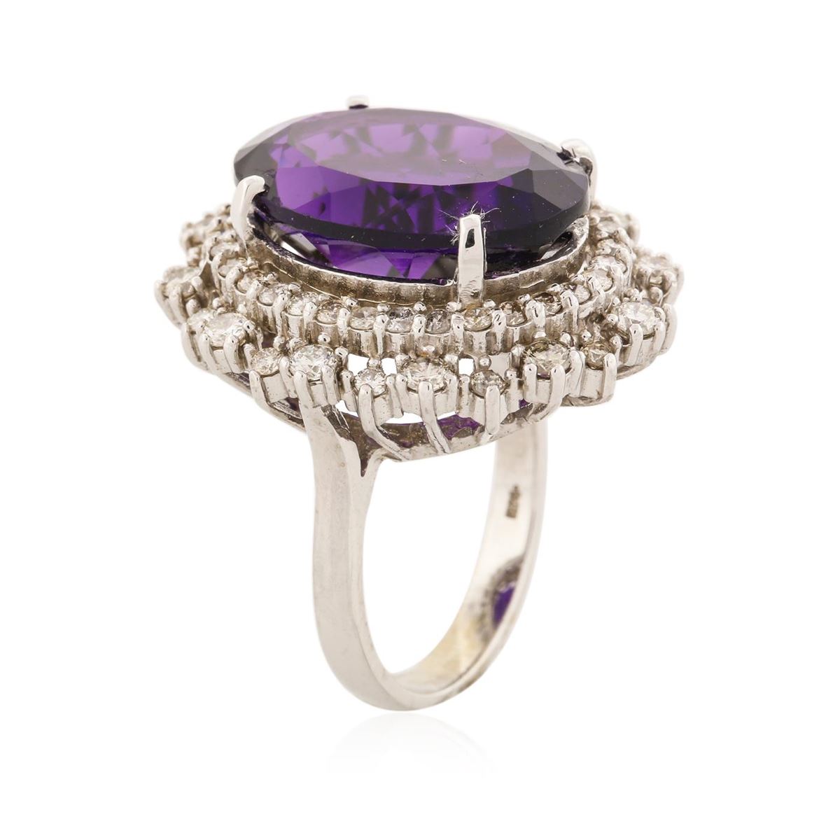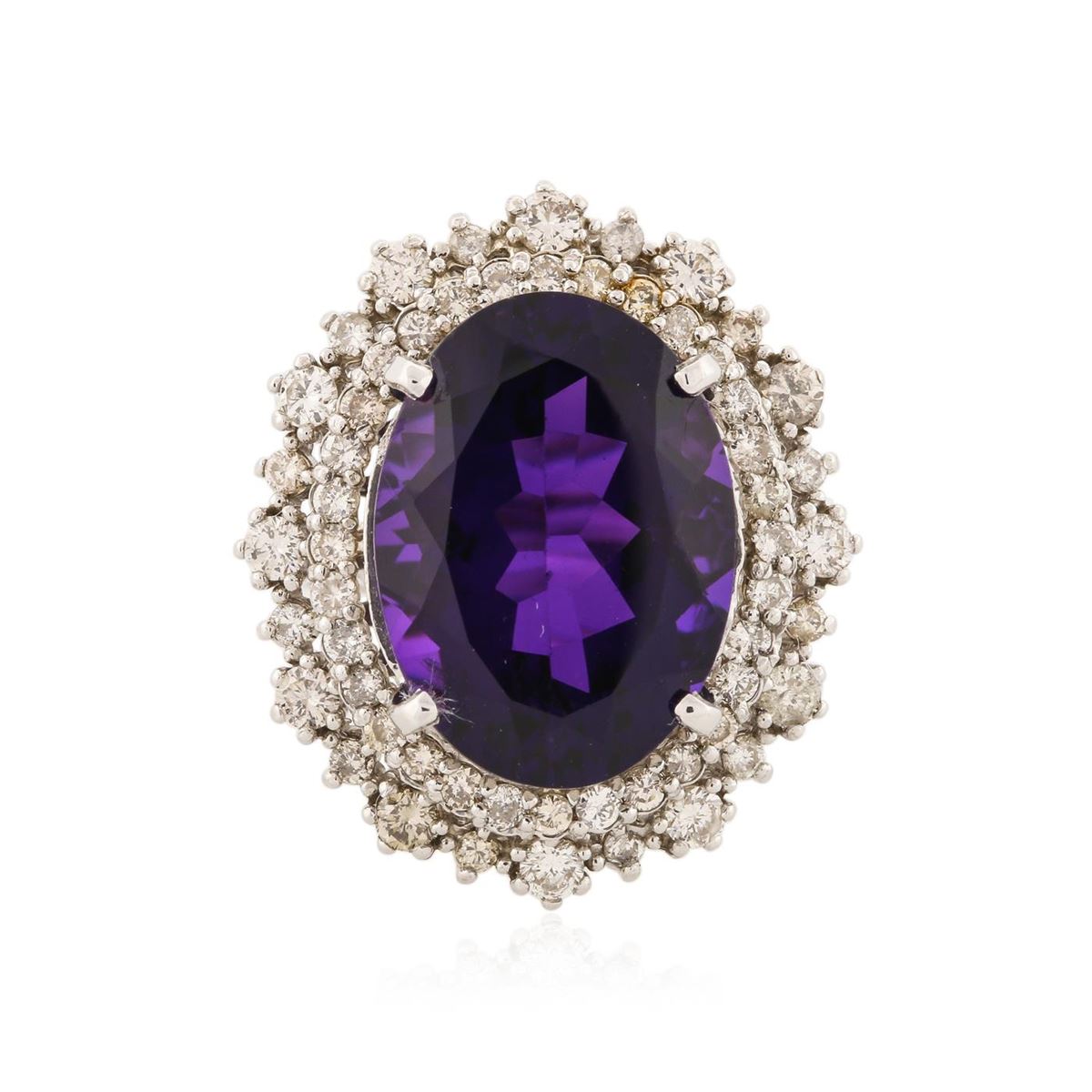 One electronically tested 14KT white gold Ladies combination cast & assembled ring with a bright polish finish. Condition is new. Identified with markings of "K14". Containing: One prong set oval modified brilliant cut natural amethyst, measuring 18.00 x 13.37 x 8.49mm, approximate weight of 11.11ct., clarity is eye clean, type II, medium dark, moderately strong, purple color, (GIA P 6/4), cut is very good. Colored gemstones are presumed to have been subjected to commonly used color/clarity enhancement processes. Twelve prong set round brilliant cut diamonds, measuring 2.30 - 2.30 x 1.38mm (depth est.) approximate. Total Weight of 12 Stones = 0.53ct. Clarity: I-1 to I-2. Color: J - K, Cut is Good. Forty-Six prong set round brilliant cut diamonds, measuring 1.50 - 1.50 x 0.90mm (depth est.) approximate. Total Weight of 46 Stones = 0.57ct. Clarity: I-1 to I-2. Color: J - K, Cut is Good. Total Weight of Colored Stones 11.11ct. Total Weight of Diamonds 1.10ct. Total Weight of Ring 11.60 grams. GGL Appraised at $4,670.00.