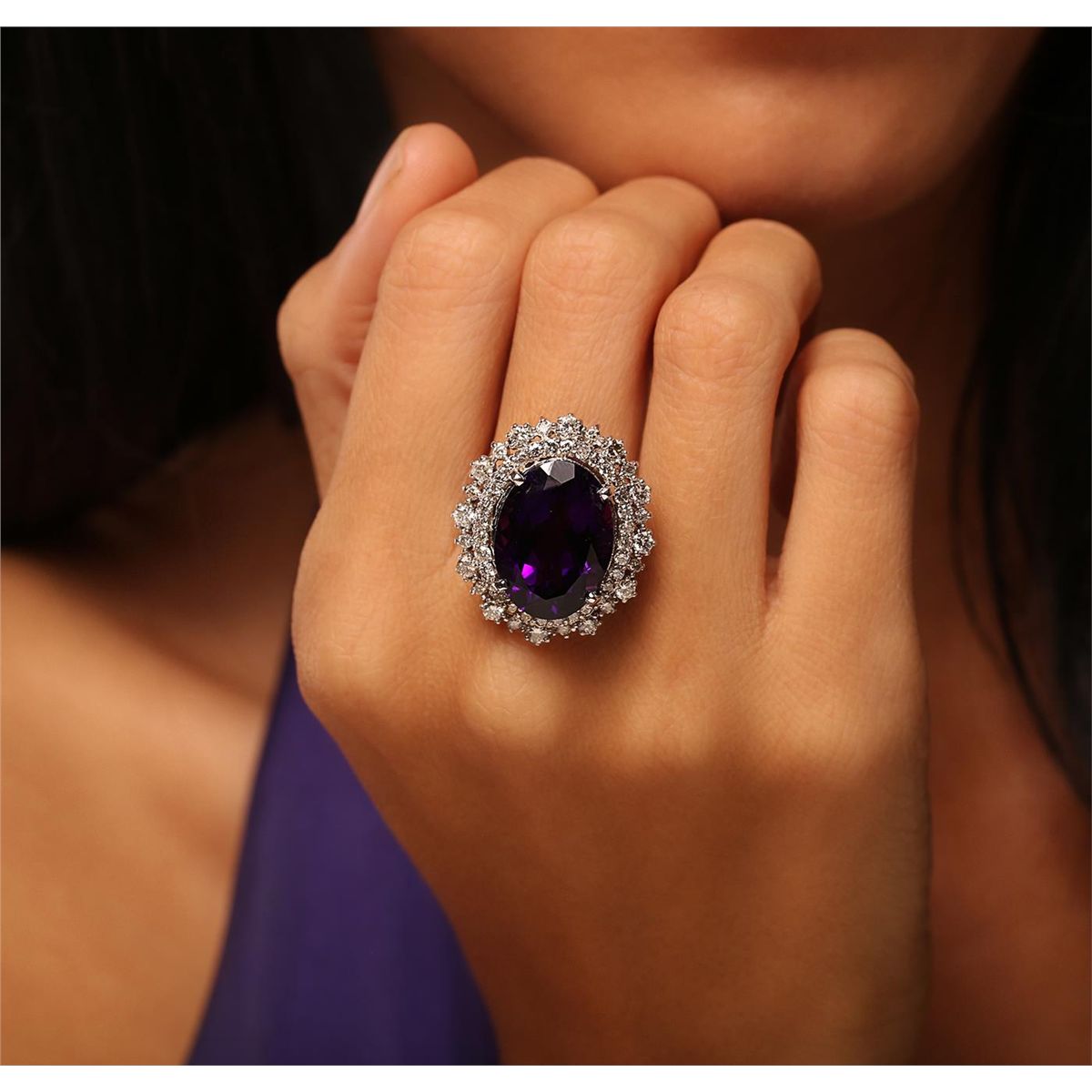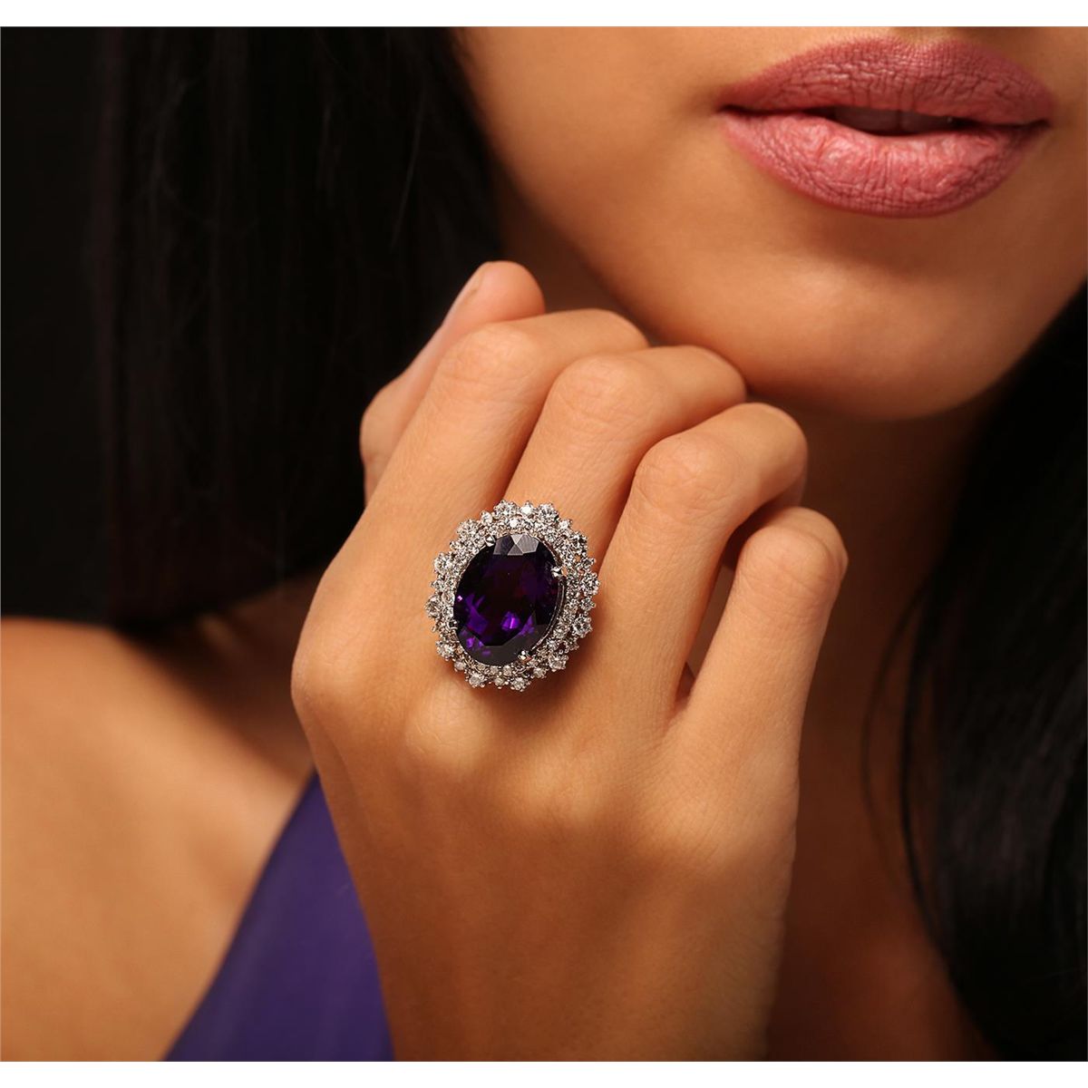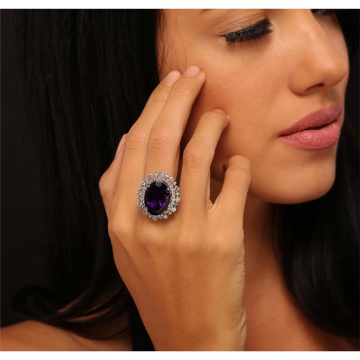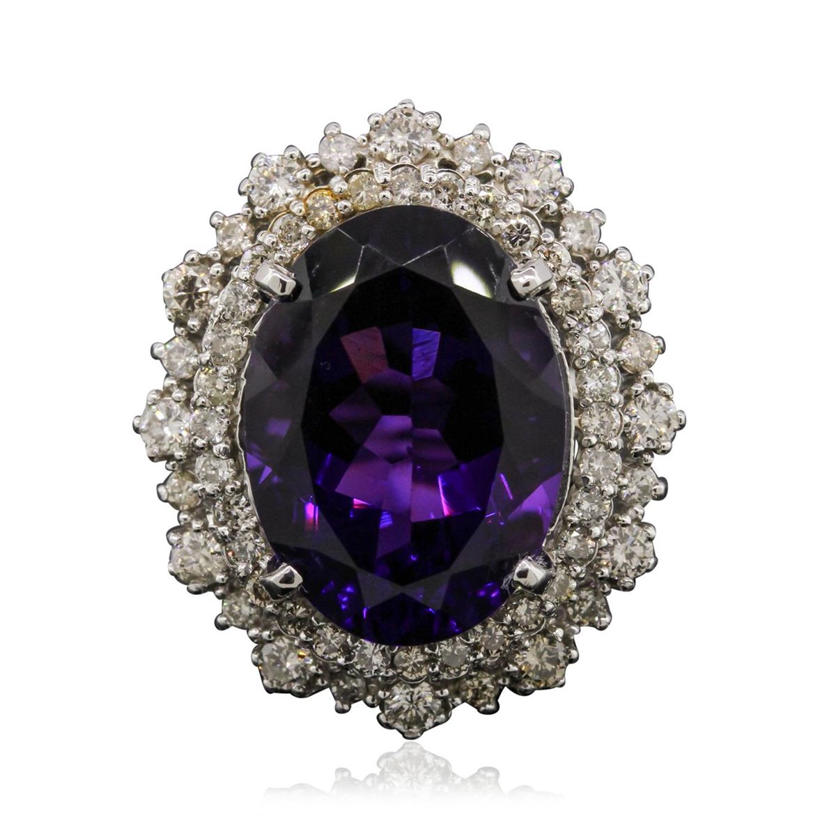 One electronically tested 14KT white gold Ladies combination cast & assembled ring with a bright polish finish. Condition is new. Identified with markings of "K14". Containing: One prong set oval modified brilliant cut natural amethyst, measuring 18.00 x 13.37 x 8.49mm, approximate weight of 11.11ct., clarity is eye clean, type II, medium dark, moderately strong, purple color, (GIA P 6/4), cut is very good. Colored gemstones are presumed to have been subjected to commonly used color/clarity enhancement processes. Twelve prong set round brilliant cut diamonds, measuring 2.30 - 2.30 x 1.38mm (depth est.) approximate. Total Weight of 12 Stones = 0.53ct. Clarity: I-1 to I-2. Color: J - K, Cut is Good. Forty-Six prong set round brilliant cut diamonds, measuring 1.50 - 1.50 x 0.90mm (depth est.) approximate. Total Weight of 46 Stones = 0.57ct. Clarity: I-1 to I-2. Color: J - K, Cut is Good. Total Weight of Colored Stones 11.11ct. Total Weight of Diamonds 1.10ct. Total Weight of Ring 11.60 grams. GGL Appraised at $4,670.00.