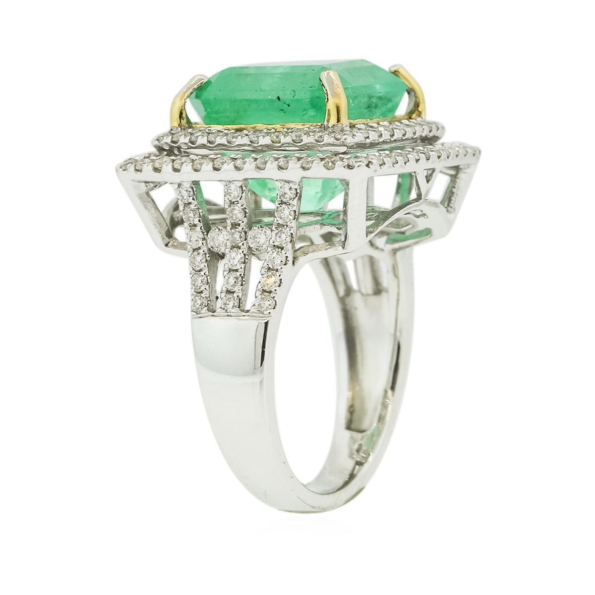 One electronically tested 14KT white gold ladies cast emerald and diamond ring. The featured emerald is set within two tiered diamond bezels supported by diamond set three-way split shoulders, completed by a three millimeter wide band. Identified with markings of "14K". Condition is new, good workmanship. Containing: One prong set rectangular step cut natural emerald, measuring 11.90 x 11.25 x 9.60mm, 6% bulge factor, approximate weight of 11.12ct., clarity is heavily included, type III, medium, very slightly grayish, very slightly bluish green color, (GIA vslbG 5/3), cut is good. Transmitting light with a minimum of distortion, transparent. Naturally occurring internal & external characteristics are present. Indications of oil residue. Colored Stone Grading Report attached. Graded in the setting. One Hundred prong set round brilliant cut diamonds, measuring 1.50 - 1.40 x 0.87mm (depth est.) approximate total weight of 100 Stones = 1.21ct. Graded in the setting. Clarity: SI-1 to I-1. Color: G - I. Total Weight of Colored Stones 11.12ct. Total Weight of Diamonds 1.21ct. Total Weight of Ring 9.16 grams. AIG Appraised at $34,145.00.