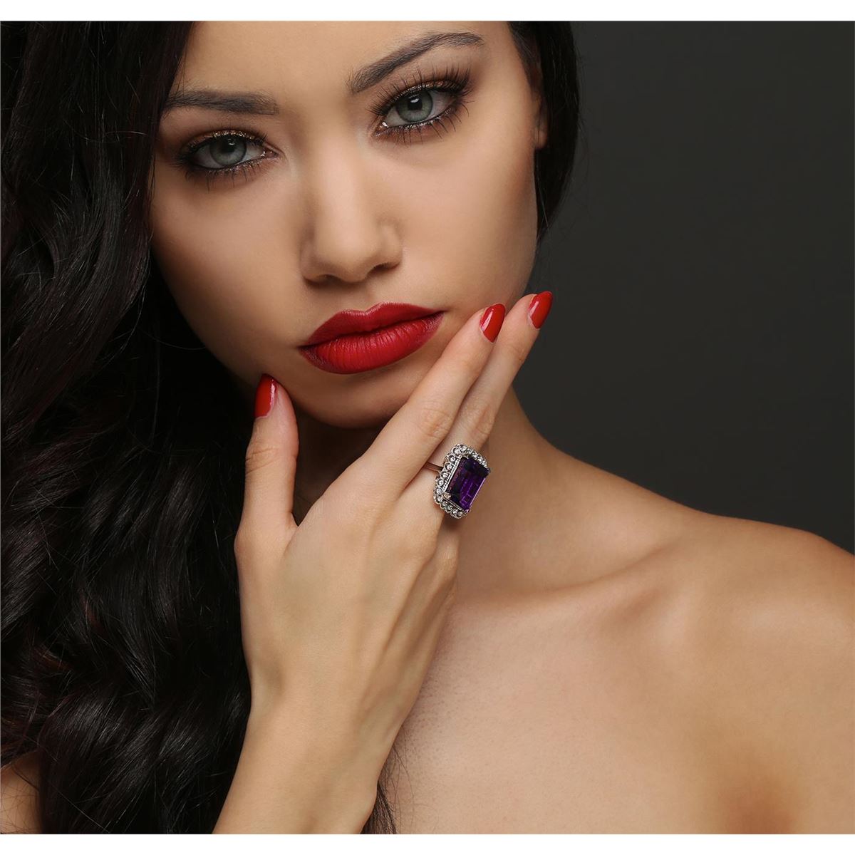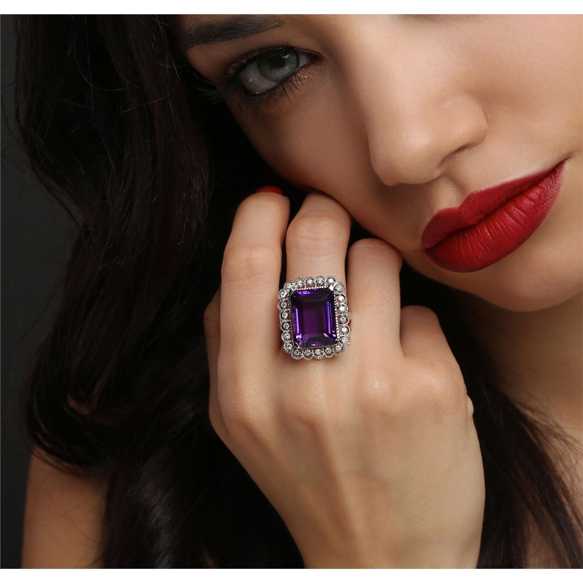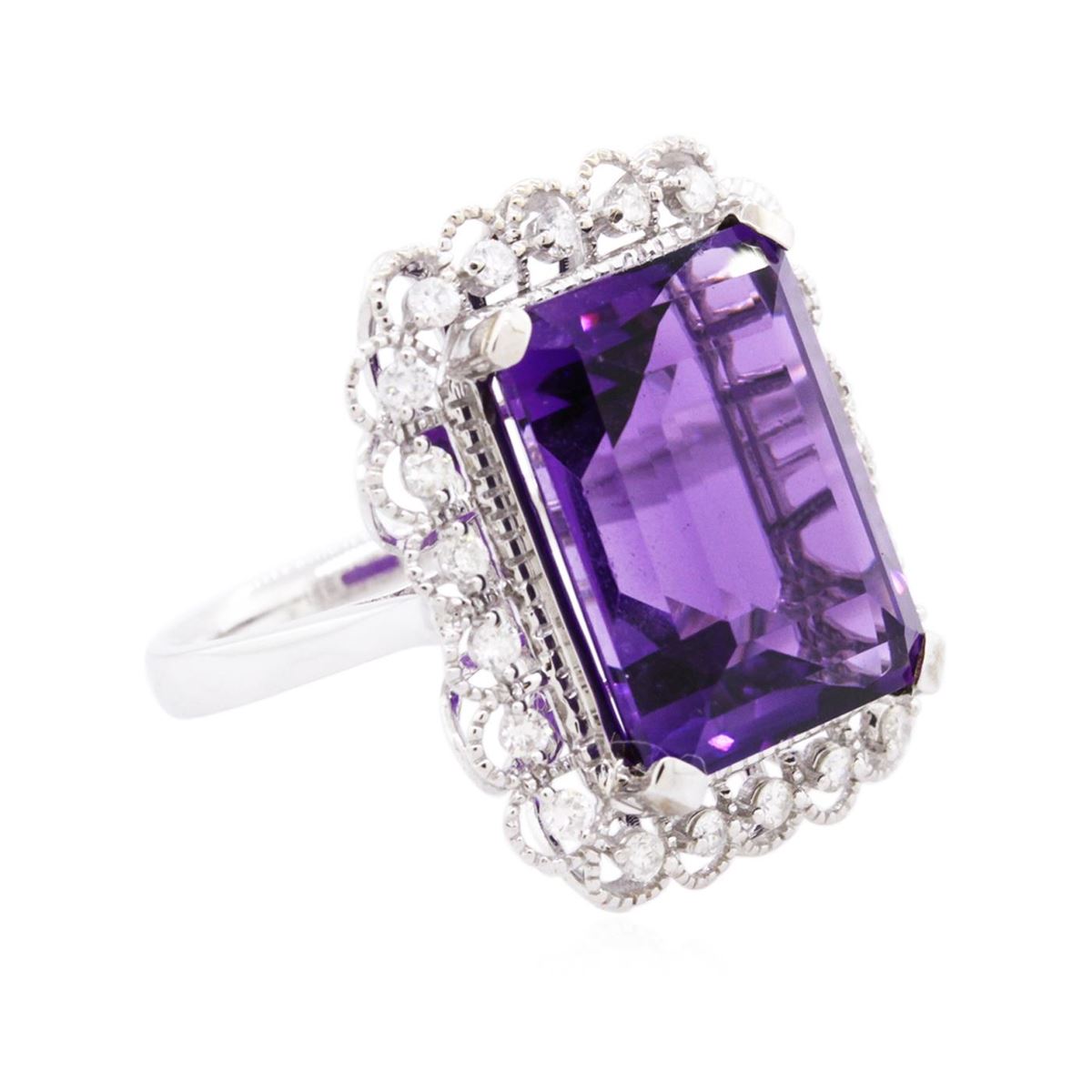 One electronically tested 14KT white gold ladies combination cast & assembled amethyst and diamond ring with a flat shank with a bright polish finish. Identified with markings of "14K". Condition is new. Containing: One prong set emerald standard step cut natural amethyst, measuring 16.09 x 12.18 x 7.92mm, approximate weight of 11.15ct., clarity is eye clean, type II, medium, moderately strong, purple color, (GIA P 5/4), cut is good. Twenty-Two prong set round brilliant cut diamonds, measuring 1.50 - 1.50 x 0.90mm (depth est.) approximate total weight of 22 Stones = 0.27ct. Clarity: I-1 to I-2. Color: I - J, Cut is Good. Colored gemstones are presumed to have been subjected to commonly used enhancement processes. All diamonds and colored gemstones are graded in the mounting, unless otherwise stated. Total Weight of Colored Stones 11.15ct. Total Weight of Diamonds 0.27ct. Total Weight of Ring 7.40 grams. GGL Appraised at $3,570.00.